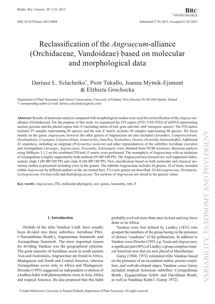 BRC Biodiv. Res. Conserv. 29: 1-23, 2013 www.brc.amu.edu.pl DOI 10.2478/biorc-2013-0004 Submitted 27.01.2013, Accepted 31.03.2013 Reclassification of the Angraecum-alliance (Orchidaceae, Vandoideae) based on molecular and morphological data Dariusz L. Szlachetko*, Piotr Tukałło, Joanna Mytnik-Ejsmont & Elżbieta Grochocka Abstract: Results of molecular analysis compared with morphological studies were used for reclassification of the Angraecumalliance (Orchidaceae). For the purpose of this study we sequenced the ITS region (ITS1-5.8S-ITS2) of nrDNA representing nuclear genome and the plastid region trnL-F (including intron of trnL gene and trnL-trnF intergenic spacer). The ITS matrix includes 97 samples representing 86 species and the trnL-F matrix includes 94 samples representing 86 species. We focus mainly on the genus Angraecum, however the other genera of Angraecinae are also included (Aeranthes, Campylocentrum, Dendrophylax, Cryptopus, Calyptrochilum, Lemurorchis, Jumellea, Neobathiea, Oeonia, Oeoniella, Sobennikoffia). Additional 43 sequences, including an outgroup (Polystachya modesta) and other representatives of the subtribes Aeridinae (Aerides) and Aerangidinae (Aerangis, Angraecopsis, Erasanthe, Solenangis), were obtained from NCBI resources. Bayesian analysis using MrBayes 3.1.2 on the combined ITS/trnL-F matrix were performed. The monophyly of Angraecinae with an inclusion of Aerangidinae is highly supported by both methods (93 BP/100 PP). The Angraecoid taxa formed two well supported clades, namely clade I (89 BP/100 PP) and clade II (84 BP/100 PP). New classification based on both molecular and classical taxonomy studies is presented including a key to the genera. The subtribe Angraecinae includes 36 genera, 18 of them, included within Angraecum by different authors so far, are treated here. Five new genera are described: Eichlerangraecum, Hermansia, Lesliegraecum, Pectianriella and Rudolfangraecum. Ten sections of Angraecum are raised to the generic status. Key words: Angraecum, ITS, molecular phylogeny, new genus, taxonomy, trnL-F 1. Introduction Orchids of the tribe Vandeae Lindl. have usually been divided into three subtribes: Aeridinae Pfitz. (=Sarcanthinae Benth.), Angraecinae Summerh. and Aerangidinae Summerh. The most important reason for dividing Vandeae was the geographical criterion. The great majority of Aeridinae occur in south-eastern Asia and Australasia, Angraecinae are found in Africa, Madagascar and South and Central America, whereas Aerangidinae occur only in Africa and Madagascar. Dressler (1993) suggested an independent evolution of a leafless habit with photosynthetic roots in Asia, Africa and tropical America. He also proposed that this habit probably evolved more than once in Asia and may have done so in Africa. Vandeae were first defined by Lindley (1835) who grouped the members of the group basing on the presence of distinct “caudicles” of the pollinarium. In addition to Vandeae sensu Dressler (1993; e.g. Vanda and Angraecum), a significant part (40%) of Lindley’s group comprises tropical American taxa that are now placed in Maxillarieae. Garay (1960, 1972) reinstated tribe Vandeae based on the presence of an incumbent anther, porrect rostellum, and well-developed stipes. Vandeae sensu Garay included tropical American subtribes: Cyrtopodiinae Benth., Zygopetalinae Schltr. and Oncidiinae Benth. as well as Vandinae Rchb.f. (Garay 1972). ©Adam Mickiewicz University in Poznań (Poland), Department of Plant Taxonomy. All rights reserved. VARIABILITY, TAXONOMY AND PHYLOGENY Department of Plant Taxonomy and Nature Conservation, University of Gdańsk, Wita Stwosza 59, 80-308 Gdańsk, Poland * corresponding author (e-mail: [email protected]) 2 Dariusz L. Szlachetko et al. Reclassification of the Angraecum-alliance (Orchidaceae, Vandoideae) based... The subtribes Angraecinae and Aerangidinae were described by Summerhayes in 1966. He officially reco gnized these two groups as the subtribes of Vandeae which were earlier separated by Schlechter (1918), accordingto the structure of the rostellum. In Angraecinae, the rostellum is deeply divided and in Aerangidinae is elongate and beak-like (Dressler 1993). Morphologically, the members of these two subtribes have similar vegetative and floral features and are often referred to collectively as “angraecoids”. Chromosome counts were made by Jones (1967) and showed cytological support for the subdivision of the angrecoid orchids (Angraecinae and Aerangidinae) on the morphological basis and revealed the chromosome number for Angraecinae n=19 and for Aerangidinae n=25. Arends et al. (1980) and Arends and Van der Laan’s (1983) in their preliminary karyological studies questioned the previous division of the African Vandeae. These authors established four groups: the first one with a short rostellum and n=19 (Aeranthes Lindl., Cryptopus Lindl., Jumella Schlecht. and some species of Angraecum Bory), the second one with a short rostellum and n=21, 23, 24, 25 (some species of Angraecum), the third one with a beak-like rostellum and n=19 (Calyptrochilum Kraenzl.) and the fourth one with a beak-like rostellum and n=23 to 27 (most of Aerangidinae). Dressler (1981) elevated units of the original tribe Epidendreae Lindl. delimited by Dressler and Dodson (1960) to form two subfamilies: Epidendroideae Lindl. ex Endl. and Vandoideae Endl.. Although Vandoideae have long been recognized (at various taxonomic levels) on the basis of floral morphology, there were few consistent characters to delimit Vandoideae from Epidendroideae. Dressler admitted that the only clear character delimiting these two subfamilies was anther development and, several years later (1989), he reinstated the members of Vandoideae into a broadly defined Epidendroideae, much like his original systematic treatment with Dodson (Dressler & Dodson 1960). In his classification system, Vandeae formed a well-defined group of orchids splitted into three su