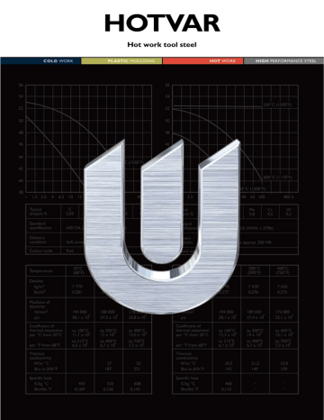 HOTVAR Hot work tool steel HOTVAR Ogólne dane Właściwości HOTVAR jest molibdenowo-wanadową stalą narzędziową do pracy na gorąco cechującą się: • Bardzo dobrą odpornością na wysokie temperatury • Bardzo dobrymi właściwościami w wysokich temperaturach • Bardzo dobrą odpornością na zmęczenie cieplne • Bardzo dobrą wytrzymałością na odpuszczanie • Bardzo dobrą przewodnością cieplną Wszystkie próbki pobrano ze środka pręta o średnicy 115 mm (4,5"). O ile nie określono inaczej, wszystkie próbki były hartowane w temperaturze 1050°C (1920°F), chłodzone powietrzem i odpuszczane 2+2h w temp. 575°C (1070°F) do twardości odpowiadającej 56 HRC. WŁAŚCIWOŚCI FIZYCZNE Dane w temperaturze pokojowej oraz podwyższonej. Skład chemiczny % Standardowa specyfikacja Stan dostawy Kod kolorystyczny C 0,55 Brak Si 1,0 Mn 0,75 Cr 2,6 Mo 2,25 V 0,85 Zmiękczona do około 210 HB Czerwony/brązowy LEPSZE WŁAŚCIWOŚCI NARZĘDZI HOTVAR jest specjalną stalą do pracy na gorąco typu premium opracowaną przez Uddeholm, aby umożliwić wydajną pracę narzędzi w temperaturach do 650°C. Dobór składników stopowych powoduje, że stal HOTVAR cechuje się wysoką odpornością na zużycie cieplne oraz dobrymi właściwościami w wysokich temperaturach. W produkcji stali HOTVAR zastosowano specjalną technologię. Zastosowania HOTVAR to stal narzędziowa do pracy na gorąco odpowiednia na zastosowania, gdzie zużycie cieplne i/lub odkształcenia plastyczne są podstawowymi czynnikami powodującymi uszkodzenia. Ciekawsze zastosowania i narzędzia: • Kucie na gorąco, matryce i stemple • Walcowanie na walcach kuźniczych, segmenty walcownicze • Kucie obwodowe, stemple i matryce • Spęczanie, narzędzia zaciskowe • Kucie posuwowe, matryce • Kucie osiowe w matrycach zamkniętych, matryce górne i dolne • Formowanie krzyżowe, segmenty • Gięcie na gorąco, narzędzia • Wzorcowanie na gorąco, narzędzia • Odlewanie ciśnieniowe cynku, matryce • Wyciskanie rur aluminiowych Temperatura Gęstość kg/m3 lbs/in3 Współczynnik sprężystości N/mm2 psi Współczynnik rozszerzalności cieplnej °C od 20°C °F od 68°F Przewodność cieplna W/m °C Btu in (ft2h°F) 20°C (68°F) 400°C (750°F) 600°C (1110°F) 7800 0,281 7700 0,277 7600 0,274 210 000 30,5x106 180 000 26,1x106 140 000 20,3x106 - 12,6x10-6 7,0x10-6 13,2x10-6 7,3x10-6 31 215 33 230 33 230 WŁAŚCIWOŚCI MECHANICZNE Przybliżona wytrzymałość na rozciąganie w temperaturze pokojowej. Twardość Wytrzymałość na rozciąganie Rm Granica plastyczności Rp0,2 54 HRC 2100 MPa 136 tsi 305 000 psi 1800 MPa 117 tsi 260 000 psi 56 HRC 2200 MPa 142 tsi 320 000 psi 1820 MPa 119 tsi 265 000 psi 58 HRC 2300 MPa 149 tsi 335 000 psi 1850 MPa 121 tsi 270 000 psi Zalecany poziom twardości to 54-58 HRC. Celem poprawy odporności na zużycie, narzędzia mogą być poddane azotowaniu plazmowemu lub węgloazotowaniu. 2 HOTVAR Wytrzymałość na gorąco Wpływ czasu na twardość w wysokiej temperaturze Wytrzymałość na gorąco, przekrój wzdłużny Poniżej pokazano spadek twardości w wysokiej temperaturze oraz różnych czasach utrzymywania. Próbki zostały najpierw zahartowane i odpuszczone do 54. 56 i 58 HRC. Wpływ temperatury testów na energię uderzenia Próbki Charpy-V, przekrój poprzeczny Energia uderzenia stopy funty J Temperatura testów 3 HOTVAR Obróbka cieplna - ogólne zalecenia MIĘKKIE WYŻARZANIE Zabezpieczyć stal i nagrzać skrośnie do 820°C (150°F). Następnie schładzać w piecu o 10°C (20°F) na godzinę do 60°C (1110°F), a następnie na powietrzu. ODPRĘŻANIE Po obróbce zgrubnej, narzędzie powinno zostać nagrzane skrośnie do 650°C (1200°F), przy czasie utrzymywania 2 godziny. Schładzać powoli do 350°C (660°F), a następnie na powietrzu. HARTOWANIE Temperatura podgrzewania: pierwszy etap 480-600°C (8951110°F), drugi etap 850°C (1560°F), Temperatura austenityzacji: 1050-1070°C (1920-1960°F), zwykle 1050°C (1920°F), ale gdy wymagana jest maksymalna twardość, wtedy temperatura ta wynosi 1070°C (1960°F). Temperatura Czas wygrzewania w minutach * Twardość przed odpuszczaniem dla średnicy 25 mm (1") °C °F Olej Powietrze 1050 1920 30 61±1 59±1 1070 1960 20 62±1 60±1 * Czas wygrzewania = czas całkowitego nagrzania skrośnego narzędzia w temperaturze hartowania. Należy chronić narzędzie przed odwęgleniem i utlenieniem podczas hartowania. ŚRODKI HARTOWNICZE • Szybkobieżny gaz / obieg powietrza • Próżnia (gaz szybkobieżny przy dostatecznie wysokim ciśnieniu) • Kąpiel hartowania stopniowego lub złoże fluidalne w temperaturze 450-550°C (840-1220°F) • Kąpiel hartowania stopniowego lub złoże fluidalne w temperaturze ok. 180-220°C (360-430°F) • Ciepły olej, ok. 80°C (175°F) • Uwaga 1: Należy odpuszczać narzędzie, gdy tylko jego temperatura osiągnie 50-70°C (120-160°F). Uwaga 2: W celu uzyskania optymalnych właściwości narzędzia, tempo chłodzenia powinno być szybkie, ale takie, które nie spowoduje nadmiernych odkształceń czy pęknięć. Wykres CCT Temperatura austenityzacji 1050°C (1920°F). Czas utrzymywania 30 minut. AC1=890°C (1630°F) AC1S=800°C (1470°F) Krzywa chłodzenia nr 1 2 3 4 5 6 7 8 9 Twardość HV10 T800-500 (s) 772 734 715 707 690 548 473 464 351 1 140 280 450 630 1390 5215 8360 19400 4 HOTVAR Twardość, wielkość ziarna i austenit szczątkowy jako funkcja temperatury austenityzacji. Próbki o średnicy 25 mm (1"). ZMIANY WYMIAROWE PODCZAS HARTOWANIA I ODPUSZCZANIA Podczas hartowania i odpuszczania matryca podlega naprężeniom cieplnym oraz naprężeniom wynikającym z przemian w materiale. Powoduje to nieuniknione zmiany wymiarowe, a w najgorszym wypadku odkształcenia. Dlatego też, zaleca się zawsze pozostawianie naddatku po obróbce skrawaniem, a przed hartowaniem i odpuszczaniem matrycy. Próbki zwykle kurczą się na osi dłuższej, a rozszerzają na osi krótszej, ale zale