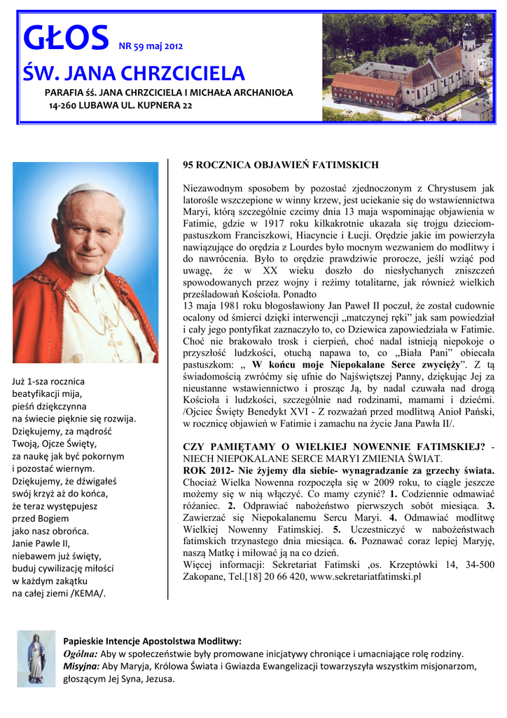 GŁOS NR 59 maj 2012 ŚW. JANA CHRZCICIELA PARAFIA śś. JANA CHRZCICIELA I MICHAŁA ARCHANIOŁA 14‐260 LUBAWA UL. KUPNERA 22 95 ROCZNICA OBJAWIEŃ FATIMSKICH Już 1‐sza rocznica beatyfikacji mija, pieśń dziękczynna na świecie pięknie się rozwija. Dziękujemy, za mądrość Twoją, Ojcze Święty, za naukę jak być pokornym i pozostać wiernym. Dziękujemy, że dźwigałeś swój krzyż aż do końca, że teraz występujesz przed Bogiem jako nasz obrońca. Janie Pawle II, niebawem już święty, buduj cywilizację miłości w każdym zakątku na całej ziemi /KEMA/. Niezawodnym sposobem by pozostać zjednoczonym z Chrystusem jak latorośle wszczepione w winny krzew, jest uciekanie się do wstawiennictwa Maryi, którą szczególnie czcimy dnia 13 maja wspominając objawienia w Fatimie, gdzie w 1917 roku kilkakrotnie ukazała się trojgu dzieciompastuszkom Franciszkowi, Hiacyncie i Łucji. Orędzie jakie im powierzyła nawiązujące do orędzia z Lourdes było mocnym wezwaniem do modlitwy i do nawrócenia. Było to orędzie prawdziwie prorocze, jeśli wziąć pod uwagę, że w XX wieku doszło do niesłychanych zniszczeń spowodowanych przez wojny i reżimy totalitarne, jak również wielkich prześladowań Kościoła. Ponadto 13 maja 1981 roku błogosławiony Jan Paweł II poczuł, że został cudownie ocalony od śmierci dzięki interwencji „matczynej ręki” jak sam powiedział i cały jego pontyfikat zaznaczyło to, co Dziewica zapowiedziała w Fatimie. Choć nie brakowało trosk i cierpień, choć nadal istnieją niepokoje o przyszłość ludzkości, otuchą napawa to, co „Biała Pani” obiecała pastuszkom: „ W końcu moje Niepokalane Serce zwycięży”. Z tą świadomością zwróćmy się ufnie do Najświętszej Panny, dziękując Jej za nieustanne wstawiennictwo i prosząc Ją, by nadal czuwała nad drogą Kościoła i ludzkości, szczególnie nad rodzinami, mamami i dziećmi. /Ojciec Święty Benedykt XVI - Z rozważań przed modlitwą Anioł Pański, w rocznicę objawień w Fatimie i zamachu na życie Jana Pawła II/. CZY PAMIĘTAMY O WIELKIEJ NOWENNIE FATIMSKIEJ? NIECH NIEPOKALANE SERCE MARYI ZMIENIA ŚWIAT. ROK 2012- Nie żyjemy dla siebie- wynagradzanie za grzechy świata. Chociaż Wielka Nowenna rozpoczęła się w 2009 roku, to ciągle jeszcze możemy się w nią włączyć. Co mamy czynić? 1. Codziennie odmawiać różaniec. 2. Odprawiać nabożeństwo pierwszych sobót miesiąca. 3. Zawierzać się Niepokalanemu Sercu Maryi. 4. Odmawiać modlitwę Wielkiej Nowenny Fatimskiej. 5. Uczestniczyć w nabożeństwach fatimskich trzynastego dnia miesiąca. 6. Poznawać coraz lepiej Maryję, naszą Matkę i miłować ją na co dzień. Więcej informacji: Sekretariat Fatimski ,os. Krzeptówki 14, 34-500 Zakopane, Tel.[18] 20 66 420, www.sekretariatfatimski.pl Papieskie Intencje Apostolstwa Modlitwy: Ogólna: Aby w społeczeństwie były promowane inicjatywy chroniące i umacniające rolę rodziny. Misyjna: Aby Maryja, Królowa Świata i Gwiazda Ewangelizacji towarzyszyła wszystkim misjonarzom, głoszącym Jej Syna, Jezusa. SŁOWO NA NIEDZIELĘ 06 V- V Niedziela Wielkanocna J15,18. W opisie uprawy winorośli nie ma odwołania do relacji społecznych związanych z prowadzeniem winnicy, ale mowa jest o samej technice uprawy. Symboliczna warstwa alegorii odnosi się do relacji między Ojcem, Jezusem a wspólnotą, którą On skupił wokół siebie. W obrazie nie zostały rozwinięte wszystkie elementy. Nie wiadomo na przykład, co należy rozumieć przez oczyszczanie krzewu: prześladowania dopuszczone przez Boga celem oczyszczenia wspólnoty, czy też inne wydarzenia. Owoc, jaki przynoszą uczniowie, oraz sam fakt, że są uczniamito objawienie chwały Bożej. Słowo „owoc” pojawiało się już wcześniej w odniesieniu do tego, co z ludzkiego życia zachowuje wartość wobec próby śmierci. 13 V- VI Niedziela Wielkanocna J15,9-17. Dzisiejszy fragment Ewangelii mówi o miłości Jezusa do uczniów. Miłość ta polega na dawaniu siebie, co symbolizuje odżywianie gałązek przez krzew. Z tego obrazu wypływa zasada doskonałego modelu miłości, który polega na oddaniu życia za tego, kogo się kocha. Miłość Jezusa jest więc wymagająca. Wymagania te wyrażają się w przykazaniach, które mają być realizowane poprzez naśladowanie Jezusa. 20 V- Wniebowstąpienie Pańskie Mk16,15-20. Całe stworzenie uczestniczy w grzechu Adama, dlatego też całe potrzebuje odkupienia i usłyszenia Ewangelii Jezusa Chrystusa. Aby osiągnąć zbawienie, należy wiarą odpowiedzieć na głoszone przez apostołów orędzie i przyjąć chrzest. Ci, którzy odrzucają Ewangelię, sami zamykają się na Chrystusa i dokonane przez Niego odkupienie. W jednym zwięzłym zdaniu jest tu mowa o Wniebowstąpieniu i uwielbieniu Jezusa. Wyrażenie „zasiadł po prawej stronie Boga” ma sens symboliczny i oznacza, że Syn Boży na nowo objawia swój boski majestat i władzę które miał przed swoim zstąpieniem na ziemię. 27 V- Zesłanie Ducha Świętego J20, 1923. Podczas spotkania ze Zmartwychwstałym uczniowie mogą dotknąć Jezusa, a to oznacza, że wrócił On do swojego Ojca. Jezus daje również uczniom Ducha, co świadczy o tym, że już został otoczony chwałą przez Ojca. Wydarzenia te ukazują, że misja Jezusa została dopełniona. Dlatego posyła On teraz uczniów, tak jak Ojciec posłał Jego. Dana im władza odpuszczania i nieodpuszczania grzechów nawiązuje do władzy Jezusa i jest znakiem, że uczniowie mają kontynuować jego misję. 03 VI- Najświętszej Trójcy Mt28,16-20 Zmartwychwstały Chrystus otrzymał od swego Ojca pełnię władzy, mocą której posyła apostołów do świata, aby złączyć ze sobą wszystkie narody. Zbawienia nie osiąga się bowiem przez prostą deklarację, ale przez wejście we wspólnotę uczniów, co oznacza osobiste i całkowite przylgnięcie do Chrystusa. Apostołowie mają przekroczyć granice Izraela aby wszystkim ludom i 