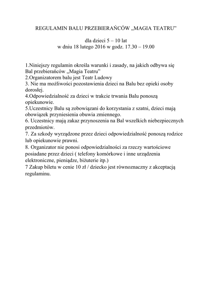REGULAMIN BALU PRZEBIERAŃCÓW „MAGIA TEATRU” dla dzieci 5 – 10 lat w dniu 18 lutego 2016 w godz. 17.30 – 19.00 1.Niniejszy regulamin określa warunki i zasady, na jakich odbywa się Bal przebierańców „Magia Teatru” 2.Organizatorem balu jest Teatr Ludowy 3. Nie ma możliwości pozostawienia dzieci na Balu bez opieki osoby dorosłej. 4.Odpowiedzialność za dzieci w trakcie trwania Balu ponoszą opiekunowie. 5.Uczestnicy Balu są zobowiązani do korzystania z szatni, dzieci mają obowiązek przyniesienia obuwia zmiennego. 6. Uczestnicy mają zakaz przynoszenia na Bal wszelkich niebezpiecznych przedmiotów. 7. Za szkody wyrządzone przez dzieci odpowiedzialność ponoszą rodzice lub opiekunowie prawni. 8. Organizator nie ponosi odpowiedzialności za rzeczy wartościowe posiadane przez dzieci ( telefony komórkowe i inne urządzenia elektroniczne, pieniądze, biżuterie itp.) 7 Zakup biletu w cenie 10 zł / dziecko jest równoznaczny z akceptacją regulaminu.