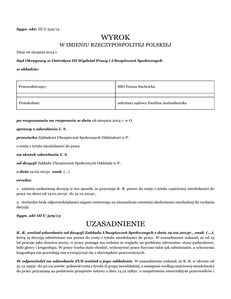 Sygn. akt: III U 529/13 WYROK W IMIENIU RZECZYPOSPOLITEJ POLSKIEJ Dnia 06 sierpnia 2014 r. Sąd Okręgowy w Ostrołęce III Wydział Pracy i Ubezpieczeń Społecznych w składzie: Przewodniczący: SSO Teresa Suchcicka Protokolant: sekretarz sądowy Ewelina Asztemborska po rozpoznaniu na rozprawie w dniu 06 sierpnia 2014 r. w O. sprawy z odwołania K. R. przeciwko Zakładowi Ubezpieczeń Społecznych Oddziałowi w P. o rentę z tytułu niezdolności do pracy na skutek odwołania K. R. od decyzji Zakładu Ubezpieczeń Społecznych Oddziału w P. z dnia 19.02.2013r. znak (...) orzeka: 1. zmienia zaskarżoną deczyję w ten sposób, że przyznaje K. R. prawo do renty z tytułu częściowej niezdolności do pracy na okres od 14.01.2013r. do 31.12.2014r., 2. stwierdza brak odpowiedzialności organu rentowego za nieustalenie ostatniej okoliczności niezbędnej do wydania decyzji. Sygn. akt III U 529/13 UZASADNIENIE K. R. wniósł odwołanie od decyzji Zakładu Ubezpieczeń Społecznych z dnia 19.02.2013r., znak (...), którą tą decyzją odmówiono mu prawa do renty z tytułu niezdolności do pracy. W uzasadnieniu wskazał, że od 15 lat pracuje jako dozorca nocny, w pracy pomaga mu rodzina ze względu na problemy zdrowotne: stany padaczkowe, bóle głowy i kręgosłupa. W pracy trzeba dużo chodzić, wykonywać prace fizyczne takie jak odśnieżanie, a schorzenia kręgosłupa nie pozwalają mu wywiązywać się z obowiązków pracowniczych. W odpowiedzi na odwołanie ZUS wniósł o jego oddalenie. W uzasadnieniu wskazał, że K. R. w okresie od 31.12.1993r. do 30.04.2006r. pobierał rentę z tytułu II grupy inwalidzkiej, a następnie według częściowej niezdolności do pracy przyznaną na podstawie przepisów ustawy z dnia 14.12.1982r. o zaopatrzeniu emerytalnym pracowników i ich rodzin. Wypłata renty została wstrzymana, ponieważ odwołujący uznany został przez Komisję Lekarską ZUS w W. za zdolnego do pracy. W dniu 12.12.2012r. odwołujący zwrócił się do Oddziału ZUS w P. Inspektoratu w O. wnioskiem o ponowne ustalenie uprawnień do renty. W związku z powyższym został skierowany na badanie lekarskie przez lekarza orzecznika ZUS, który w swoim orzeczeniu z dnia 14.01.2013r. stwierdził, że istnieją okoliczności uzasadniające ustalenie uprawnień do świadczenia rehabilitacyjnego na okres 4 miesięcy licząc od daty ustania uprawnień do świadczenia rehabilitacyjnego. Z-ca Głównego lekarza orzecznika ZUS zgłosił zarzut wadliwości orzeczenia lekarza orzecznika ZUS, bowiem orzeczenie to jest nieprawidłowe. Ubezpieczony K. R. wykorzystał 12 miesięcy świadczenia rehabilitacyjnego (od 20.01.2012r. do 13.01.2013r.) i dalsze jego przedłużenie jest niemożliwe. W związku z czym sprawa ta została przekazana do ponownego rozpatrzenia przez Komisję Lekarską ZUS w W.. Po przeprowadzeniu badania lekarskiego oraz w oparciu o zebraną w aktach dokumentację medyczną, Komisja Lekarska II Oddział ZUS w W. nr (...) w swoim orzeczeniu z dnia 07.02.2013r. ustaliła, że odwołujący K. R. nie jest niezdolny do pracy. Wobec powyższego Oddział ZUS w P. Inspektorat w O. zaskarżoną decyzją z dnia 19.02.2013r. odmówił ubezpieczonemu K. R. prawa do renty z tytułu niezdolności do pracy z uwagi na to, że nie spełniony został warunek z art.57 ust. 1 pkt I powołanej ustawy. Organ rentowy w odpowiedzi na odwołanie wskazał także, że udokumentowany staż pracy ubezpieczonego to 19 lat, 1 miesiąc i 13 dni okresów składkowych oraz 1 rok, 6 miesięcy i 26 dni okresów nieskładkowych, tj. łącznie 20 lat, 8 miesięcy i 9 dni. Sąd Okręgowy w Ostrołęce ustalił i zważył, co następuje: Odwołanie K. R. od decyzji ZUS z dnia 19.02.2013r. jest zasadne i skutkuje je go zmianą. Z pisma ZUS z dnia 02.07.2014r. (k. 133 a.s.) wynika, że odwołujący się w okresie od dnia 20.01.2012r. do 13.01.2013r. pobierał świadczenie rehabilitacyjne. Zgodnie z art. 57 ust. 1 ustawy z dnia 17.12.1998r. o emeryturach i rentach z Funduszu Ubezpieczeń Społecznych (t.j.Dz.U.2013.1440) renta z tytułu niezdolności do pracy przysługuje ubezpieczonemu, która spełnia łącznie następujące przesłanki: 1. jest niezdolny do pracy, 2. ma wymagany okres składkowy i nieskładkowy, 3. niezdolność do pracy powstała we wskazanych w ustawie okresach składkowych lub nieskładkowych albo nie później niż w ciągu 18 miesięcy od ustania tych okresów. Przepisu ust. l pkt 3 nie stosuje się do ubezpieczonego, który udowodnił okres składkowy i nieskładkowy wynoszący co najmniej 20 lat dla kobiety lub 25 lat dla mężczyzny oraz jest całkowicie niezdolny do pracy (art. 57 ust. 2 ustawy). Definicję osoby niezdolnej do pracy zawiera art. 12 ust. 1-3 w/w ustawy, który stwierdza, że jest nią osoba, która całkowicie lub częściowo utraciła zdolność do pracy zarobkowej z powodu naruszenia sprawności organizmu i nie rokuje odzyskania zdolności do pracy po przekwalifikowaniu. Całkowicie niezdolną do pracy jest osoba, która utraciła zdolność do wykonywania jakiejkolwiek pracy, natomiast częściowo niezdolną do pracy jest osoba, która w znacznym stopniu utraciła zdolność do pracy zgodnej z poziomem posiadanych kwalifikacji. W świetle w/w przepisów zasadniczą kwestią wymagającą rozstrzygnięcia w przedmiotowej sprawie, od której zależała skuteczność odwołania K. R. było ustalenie, czy jest on całkowicie niezdolny do pracy, jeśli tak, to jaki jest przewidywany okres jej trwania. Organ rentowy bowiem, wbrew twierdzeniom odwołującego się - uznał go za zdolnego do pracy. Na powyższą okoliczność Sąd dopuścił dowód z opinii biegłych sądowych -lekarzy z zakresu ortopedii, neurologii i ortopedii. Biegli z zakresu: ortopedii C. K.i neurologii T. P., po analizie akt niniejszej sprawy i badaniu lekarskim w dniu 27.04.2013r. u K. R.rozpoznali: stan po leczeniu-\ przekorną laserową dekompresją dysku: PLDD L3)L3.L3/L4.L4/ L5 w dniu 29.10.2012r., przeb