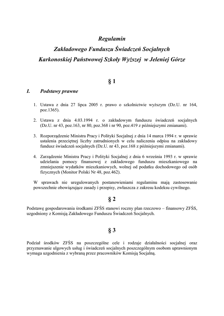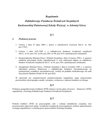 Regulamin Zakładowego Funduszu Świadczeń Socjalnych Karkonoskiej Państwowej Szkoły Wyższej w Jeleniej Górze §1 I. Podstawy prawne 1. Ustawa z dnia 27 lipca 2005 r. prawo o szkolnictwie wyższym (Dz.U. nr 164, poz.1365). 2. Ustawa z dnia 4.03.1994 r. o zakładowym funduszu świadczeń socjalnych (Dz.U. nr 43, poz.163, nr 80, poz.368 i nr 90, poz.419 z późniejszymi zmianami). 3. Rozporządzenie Ministra Pracy i Polityki Socjalnej z dnia 14 marca 1994 r. w sprawie ustalenia przeciętnej liczby zatrudnionych w celu naliczenia odpisu na zakładowy fundusz świadczeń socjalnych (Dz.U. nr 43, poz.168 z późniejszymi zmianami). 4. Zarządzenie Ministra Pracy i Polityki Socjalnej z dnia 6 września 1993 r. w sprawie udzielania pomocy finansowej z zakładowego funduszu mieszkaniowego na zmniejszenie wydatków mieszkaniowych, wolnej od podatku dochodowego od osób fizycznych (Monitor Polski Nr 48, poz.462). W sprawach nie uregulowanych postanowieniami regulaminu mają zastosowanie powszechnie obowiązujące zasady i przepisy, zwłaszcza z zakresu kodeksu cywilnego. §2 Podstawę gospodarowania środkami ZFŚS stanowi roczny plan rzeczowo – finansowy ZFŚS, uzgodniony z Komisją Zakładowego Funduszu Świadczeń Socjalnych. §3 Podział środków ZFŚS na poszczególne cele i rodzaje działalności socjalnej oraz przyznawanie ulgowych usług i świadczeń socjalnych poszczególnym osobom uprawnionym wymaga uzgodnienia z wybraną przez pracowników Komisją Socjalną. II. Zasady tworzenia zakładowego funduszu świadczeń socjalnych. §4 Źródłem finansowania zakładowej działalności socjalnej jest zakładowy fundusz świadczeń socjalnych, zwany dalej Funduszem, tworzony przez: 1. Odpis podstawowy w wysokości: a) 6,5% planowanych rocznych środków przeznaczonych na wynagrodzenia osobowe pracowników Karkonoskiej Państwowej Szkoły Wyższej, b) 10% rocznej sumy najniższej emerytury lub renty z roku poprzedniego ustalonej zgodnie z art. 94 ust. 3 pkt 1 lit. a Ustawy z dnia 17.12.1998 r. o emeryturach i rentach z Funduszu Ubezpieczeń Społecznych (Dz.U. z 2004 r. Nr 39, poz. 353 z późn. zmianami) dla każdego emeryta lub rencisty Karkonoskiej Państwowej Szkoły Wyższej. 2. Odsetki od środków Funduszu. 3. Wpływy z oprocentowania pożyczek udzielanych na cele mieszkaniowe. §5 1. Środki Funduszu gromadzone są na odrębnym rachunku bankowym (subkonto). 2. Środki Funduszu nie wykorzystane w danym roku kalendarzowym przechodzą na rok następny. III. Postanowienia ogólne. §6 Osoba ubiegająca się o przyznanie świadczenia socjalnego z Funduszu jest obowiązana złożyć w dziale administracyjno – osobowym, w trybie i terminie określonym w dalszych postanowieniach regulaminu, wniosek o przyznanie świadczenia socjalnego według załącznika nr 1 do regulaminu oraz kwestionariusza socjalnego pracownika (załącznik nr 2). §7 1. Podstawę do wyliczenia wysokości pomocy socjalnej przyznawanej osobom uprawnionym z Funduszu stanowi wysokość wynagrodzenia minimalnego ogłoszonego w Dz.U. na dany rok kalendarzowy. 2. Przyjmuje się, że maksymalna wysokość pomocy na remont mieszkania lub domu nie może przekroczyć sumy 20 wynagrodzeń minimalnych. 3. Pomoc zwrotna (pożyczka) na remont mieszkania lub domu może być przyznana dopiero po spłaceniu poprzedniego zadłużenia.” IV. Przeznaczenie Funduszu. §8 1. Środki Funduszu przeznaczone są na dofinansowanie: a) wypoczynku urlopowego i rekreacji osób uprawnionych do korzystania z Funduszu; b) kolonii i obozów (letnich i zimowych) dla dzieci i młodzieży, pochodzących z rodzin uprawnionych do korzystania z Funduszu; c) imprez okolicznościowych, artystycznych, kulturalnych i rozrywkowych oraz zakupu biletów wstępu na te imprezy; d) budżetów domowych osób znajdujących się w trudnej sytuacji finansowej (zapomogi bezzwrotne); e) wydatków na cele mieszkaniowe w formie pożyczki. 2. Zakupienie talonów świątecznych i okazjonalnych. 3. Wypłatę świadczeń z okazji świąt. Osoby uprawnione do ulgowych świadczeń socjalnych. V. §9 Do korzystania z Funduszu uprawnieni są: a) b) c) d) e) pracownicy Karkonoskiej Państwowej Szkoły Wyższej ; emeryci i renciści Karkonoskiej Państwowej Szkoły Wyższej; pracownicy przebywający na urlopach wychowawczych; współmałżonkowie nie posiadający własnych dochodów; dzieci własne i przysposobione oraz przyjęte na wychowanie w rodzinie zastępczej, wnuki i rodzeństwo będące na wyłącznym utrzymaniu pracownika, emeryta lub rencisty, do lat 18 lub ukończenia nauki, nie dłużej niż do ukończenia 26 roku życia. Jeżeli osoby są inwalidami I lub II grupy, świadczenia przysługują bez względu na wiek. § 10 Pracownikom korzystającym w danym roku z urlopu bezpłatnego oraz ich rodzinom przysługują świadczenia w wysokości proporcjonalnej do okresu przepracowanego w danym roku. VI. Podział Zakładowego Funduszu Świadczeń Socjalnych. § 11 Zakładowy Fundusz Świadczeń Socjalnych składa się z następujących funduszy częściowych: a) fundusz dopłat rekreacyjno – wypoczynkowych b) fundusz mieszkaniowy c) fundusz zapomogowy. § 12 1. Podział Funduszu na części dokonywany jest w ramach rocznego planu finansowego. 2. Plan ten przygotowywany jest przez Kanclerza Karkonoskiej Państwowej Szkoły Wyższej wspólnie z Komisją Socjalną. 3. Plan zatwierdzany jest przez Rektora Karkonoskiej Państwowej Szkoły Wyższej. VII. Szczegółowe zasady przyznawania świadczeń socjalnych. § 13 Dofinansowanie świadczeń socjalnych może obejmować między innymi: 1. W zakresie wypoczynku: a) wypłatę ekwiwalentu na wypoczynek zorganizowany przez osobę uprawnioną we własnym zakresie – raz na dwa lata, b) dopłatę do kolonii i obozów dla dzieci i młodzieży – raz w roku. 2. W zakresie działalności kulturalnej, sportowej i turystycznej: a) dopłaty do biletów wstępu na imprezy kulturalne i sportowe, b) dopłaty do jednodniowych i weekendowych