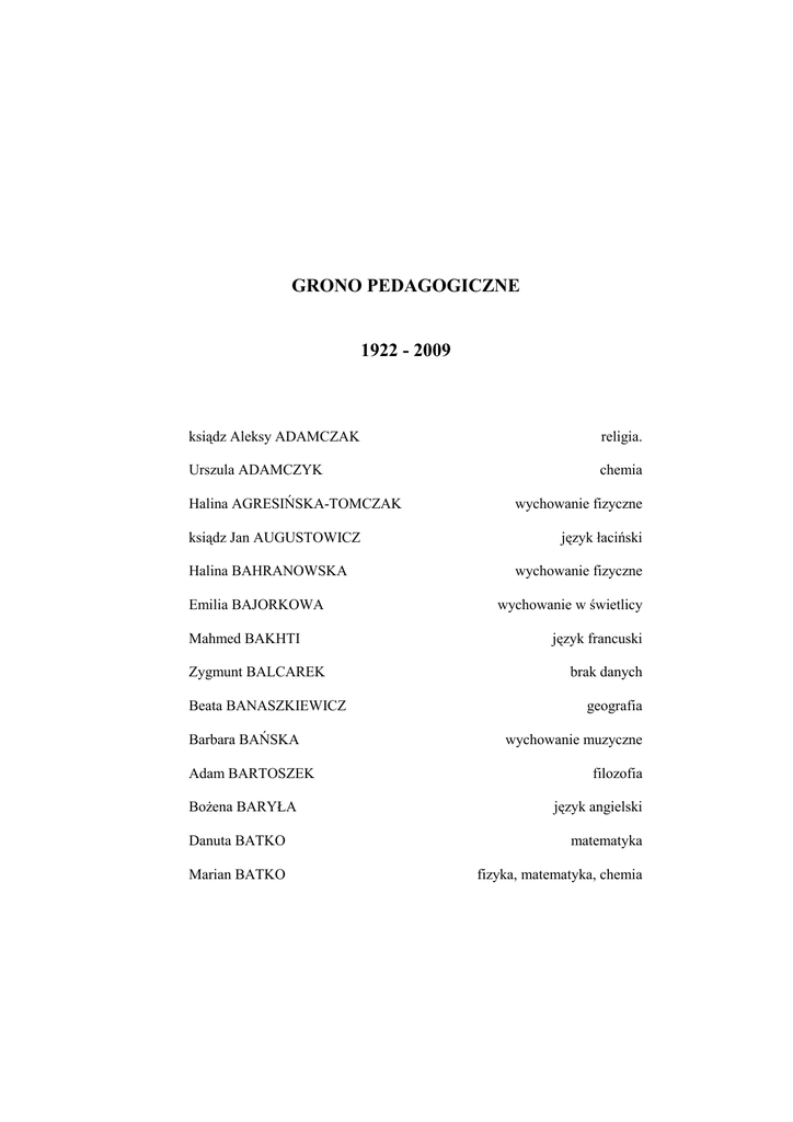 GRONO PEDAGOGICZNE 1922 - 2009 ksiądz Aleksy ADAMCZAK religia. Urszula ADAMCZYK chemia Halina AGRESIŃSKA-TOMCZAK ksiądz Jan AUGUSTOWICZ Halina BAHRANOWSKA Emilia BAJORKOWA Mahmed BAKHTI Zygmunt BALCAREK Beata BANASZKIEWICZ Barbara BAŃSKA Adam BARTOSZEK BoŜena BARYŁA wychowanie fizyczne język łaciński wychowanie fizyczne wychowanie w świetlicy język francuski brak danych geografia wychowanie muzyczne filozofia język angielski Danuta BATKO matematyka Marian BATKO fizyka, matematyka, chemia Krystyna BEDNARCZYK Wanda BENISZ Beata BENNA Józef BERNHART Tadeusz BESSAGA Teresa BIEŃKOWSKA Józef BIERNAŁ Augustyn BILMER BoŜena ŁOŚ- BŁASZCZYK biologia fizyka, informatyka język polski język niemiecki język grecki, język łaciński, język niemiecki nauczycielka w klasach I-IV, język niemiecki rysunki wychowanie techniczne Artur BŁASZCZYK matematyka Krystyna BŁASZCZYK język polski Aleksander BOBER fizyka Maria BOCHENEK język polski Karolina BOCIAŃSKA matematyka Piotr BOGALECKI język polski Urszula BOJARZEŃ Marian BOJORKO GraŜyna BOROWICZ Katarzyna BOROWIEC nauczyciel w klasach I-IV, nauczyciel w szkole podstawowej przysposobienie obronne fizyka, wicedyrektor szkoły w latach 1962 -1972 dr Kordian BORTEL Marianna BORTEL Ewa BORYCA Jerzy BRACHMAŃSKI Małgorzata BROLL Józefa BROMOWICZ Janusz BRZOZA Anna BURDA Józef BURKOT fizyka, informatyka fizyka język francuski język francuski , język niemiecki, propedeutyka bibliotekarka geografia historia przysposobienie obronne brak danych dr Maciej BURZYK biologia Tomasz BUSZMAN historia, wiedza o społeczeństwie Ryszard CEBULSKI język niemiecki Stefan CHASZCZYŃSKI Krzysztof CHMURA język rosyjski zajęcia pozalekcyjne z informatyki Paulina CHOLEWA matematyka Piotr CHOLEWA matematyka Maria CHOLEWSKA brak danych Jan CHOLEWSKI brak danych Krystian CICHOWSKI geografia, wicedyrektor szkoły w latach1987-1989, Łucja CICHY język francuski Jadwiga CIERPIOŁ-RZĄD język francuski Lucjan CYGAN Aniela CYMOREK historia matematyka Irena CZAKAŃSKA język rosyjski, biblioteka Donata CZANKOW fizyka Irena CZARNOTA Maria CZECHOWSKA plastyka historia Jolanta CZECZOTA język polski Paweł CZOPA brak danych Maria DAMIAN język francuski Ewa DANIELAK język angielski Krystyna DANYSZ T. DĄBROWSKI Bronisława DEHNER Gustaw DRYLLA Tadeusz DOBROWOLSKI język rosyjski, język niemiecki chemia język angielski język grecki fizyka, chemia Czesław DORRE wychowanie fizyczne Joanna DREWNIOK wychowanie fizyczne Stella DROGOSZ- FABJAŃSKA Oliwia DRZENZLA-BUZEK Janusz DUBIEL język angielski język niemiecki podstawy przedsiębiorczości Maria DUDEK geografia Izabela DUTKO język rosyjski Krystyna DYBKOWSKA język rosyjski Juliusz DYDAŚ Barbara DZIAŁACH Barbara DZIEKAŃSKA Przemysław FABJAŃSKI Tomasz FABJAŃSKI komendant hufca „SłuŜba Polsce” nauczyciel w szkole podstawowej muzyka geografia, wicedyrektor szkoły w roku 1991, dyrektor szkoły od roku 1991 geografia Władysław FEDYCZKOWSKI wychowanie fizyczne Adam FICEK wychowanie fizyczne Cecylia FILIPCZYK dr Vilim FRANCIĆ Antonina FRITOZ biologia język polski wychowanie fizyczne Alina FURMANIK geografia Aniela FÜRST ekonomia Władysław GAGAT fizyka, ksiądz Damian GAJDZIK religia Wiesława GAŁCZYŃSKA Stefania GANDYK wychowanie techniczne bibliotekarka Franciszek GARYCKI Jan GĄSIOR język grecki, język łaciński fizyka Barbara GĄSOWSKA język polski Urszula GĄTARZ język polski Bronisław GIBAS nauczyciel w szkole podstawowej Andrzej GIEśYŃSKI Stanisław GLÜCKSMAN Felicja GŁADKA ksiądz Adolf GNIŁKA Piotr GOLBA Adam GOLDWASSER Jan GOŁĘBIOWSKI dr Jan GONDZIK matematyka fizyka język łaciński religia katolicka wychowanie fizyczne język francuski język polski szkolny lekarz dentysta Maria GORCZYCA matematyka Mikołaj GORCZYCA brak danych Gustaw GORGOŃ zajęcia praktyczne Stanisław GÓRKA język polski, historia Krystyna GRABOWSKA Leon GRABOWSKI Tadeusz GRABOWSKI język hiszpański; język francuski chemia język angielski, wychowanie w świetlicy Helena GRACKA geografia Ewelina GRAJEK instruktor zespołu teatralnego Franciszek GRYZIK Dorota GRZESIK język polski geografia Maria GRZYBOWSKA język polski Jan GRZYBOWSKI bibliotekarz Franciszek GURGACZ język polski Wacław GUTT matematyka Helena GWÓŹDŹ historia, wicedyrektor w latach 1956 -1984 Józef HAJNOWSKI wychowanie fizyczne, przysposobienie obronne Krystyna HALABA język rosyjski, język polski, pedagog szkolny, wicedyrektor szkoły w latach 1982-1984 Janina HALICKA Maria HAŁGAS Krzysztof HAŁUPKA Ilona HELIK Władysław HELIŃSKI ksiądz Andrzej HOINKIS Zygmunt HONIEK Danuta HORNIK Zbigniew HOSZOWSKI biologia matematyka etyka wychowanie fizyczne język rosyjski religia zajęcia praktyczne, rysunki biologia język angielski Edmund HUPKA Wilhelm IDZIK Jan IMACH język francuski brak danych matematyka, propedeutyka filozofii Bogumiła ISKIERSKA język polski Stanisław JACHYMIAK język polski dr Józef JAKUBOWSKI historia, geografia, Tadeusz JANICKI zajęcia praktyczne Zygmunt JANIK Przemysław JANIUREK Ireneusz JANZ Krystyna JAWORSKA Jan JAZOWY Józef JAZOWY Danuta JEZIOROWSKA Eugenia JEZUSEK - LUBAS Ryszard JOJKO Kazimierz JONDRO Krystyna JONDRO Barbara KACZMARCZYK fizyka wychowanie fizyczne matematyka, dyrektor szkoły w latach 1987 -1991 zajęcia techniczne język łaciński język angielski wychowanie muzyczne, bibliotekarz, propedeutyka wiedzy o prawie fizyka, chemia, geografia śpiew, wychowanie w świetlicy historia język angielski ksiądz Jerzy KAHANKE Józef KALINOWSKI religia ewangelicka informatyka Katarzyna KALUS język angielski Stanisława KAMIŃSKA język francuski Joanna KANDORA chemia ksiądz Witold KANIA religia ksiądz Grzegorz KAPUT religia Antoni KARBIEL Agnieszka KASPERCZYK Lucjan KASZA Sonia KAWCZYK Władysław KAWECKI Krystian KAZIMIERCZUK Albin KĄCKI śpiew i muzyka geografia matematyka bibliotekarka geografia historia, wiedza o społeczeństwie język grecki, język łaciński, kultur