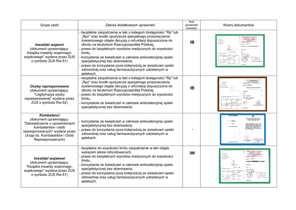 Grupa osób Inwalidzi wojenni (dokument uprawniający: Książka inwalidy wojennegowojskowego" wydana przez ZUS o symbolu ZUS Rw-51) Osoby represjonowane (dokument uprawniający: "Legitymacja osoby represjonowanej" wydana przez ZUS o symbolu Rw-52) Kombatanci (dokument uprawniający: "Zaświadczenie o uprawnieniach kombatantów i osób represjonowanych" wydane przez Urząd ds. Kombatantów i Osób Represjonowanych) Inwalidzi wojskowi (dokument uprawniający: "Książka inwalidy wojennegowojskowego" wydana przez ZUS o symbolu ZUS Rw-51) Zakres dodatkowych uprawnień bezpłatne zaopatrzenie w leki o kategorii dostępności "Rp" lub „Rpz" oraz środki spożywcze specjalnego przeznaczenia żywieniowego objęte decyzją o refundacji dopuszczone do obrotu na terytorium Rzeczypospolitej Polskiej, prawo do bezpłatnych wyrobów medycznych do wysokości limitu, korzystanie ze świadczeń w zakresie ambulatoryjnej opieki specjalistycznej bez skierowania, prawo do korzystania poza kolejnością ze świadczeń opieki zdrowotnej oraz usług farmaceutycznych udzielanych w aptekach. bezpłatne zaopatrzenie w leki o kategorii dostępności "Rp" lub „Rpz" oraz środki spożywcze specjalnego przeznaczenia żywieniowego objęte decyzją o refundacji dopuszczone do obrotu na terytorium Rzeczypospolitej Polskiej, prawo do bezpłatnych wyrobów medycznych do wysokości limitu, korzystanie ze świadczeń w zakresie ambulatoryjnej opieki specjalistycznej bez skierowania. korzystanie ze świadczeń w zakresie ambulatoryjnej opieki specjalistycznej bez skierowania, prawo do korzystania poza kolejnością ze świadczeń opieki zdrowotnej oraz usług farmaceutycznych udzielanych w aptekach. bezpłatne do wysokości limitu zaopatrzenie w leki objęte wykazem leków refundowanych, prawo do bezpłatnych wyrobów medycznych do wysokości limitu, korzystanie ze świadczeń w zakresie ambulatoryjnej opieki specjalistycznej bez skierowania, prawo do korzystania poza kolejnością ze świadczeń opieki zdrowotnej oraz usług farmaceutycznych udzielanych w aptekach. Kod uprawnień (recepty) IB IB - IW Wzory dokumentów Uprawnieni żołnierze lub pracownicy tylko w zakresie leczenia urazów lub chorób nabytych podczas wykonywania zadań poza granicami państwa dokument uprawniający: "Legitymacja osoby poszkodowanej poza granicami państwa" wydana przez Szefa Inspektoratu Wojskowej Służby Zdrowia) Weteran poszkodowany w działaniach poza granicami państwa dokument uprawniający: - żołnierz - „Legitymacja weterana poszkodowanego”, wydaje Minister Obrony Narodowej - funkcjonariusz - „Legitymacja weterana poszkodowanego – funkcjonariusza”, wydaje Minister właściwy do Spraw Wewnętrznych - funkcjonariusz ABW „Legitymacja weterana poszkodowanego – funkcjonariusza ABW”, wydaje Szef Agencji Bezpieczeństwa Wewnętrznego bezpłatne do wysokości limitu zaopatrzenie w leki objęte wykazem leków refundowanych oraz leki recepturowe, prawo do bezpłatnych wyrobów medycznych do wysokości limitu, korzystanie ze świadczeń w zakresie ambulatoryjnej opieki specjalistycznej bez skierowania, prawo do korzystania poza kolejnością ze świadczeń opieki zdrowotnej w szpitalach i świadczeń specjalistycznych w ambulatoryjnej opiece zdrowotnej, prawo do świadczeń opieki zdrowotnej niezakwalifikowanych jako świadczenia gwarantowane oraz odpłatnych świadczeń opieki zdrowotnej. korzystanie poza kolejnością z bezpłatnej pomocy psychologicznej wraz z najbliższymi członkami rodziny, udzielanej: przez psychologów w jednostkach wojskowych oraz przez wojskowe pracownie psychologiczne, a także w podmiotach leczniczych tworzonych i nadzorowanych przez Ministra ON w odniesieniu do weteranów poszkodowanych żołnierzy; w podmiotach leczniczych tworzonych i nadzorowanych przez ministra właściwego do spraw wewnętrznych – w odniesieniu do weteranów poszkodowanych funkcjonariuszy; w podmiotach leczniczych utworzonych przez Szefa Agencji Bezpieczeństwa Wewnętrznego w odniesieniu do weterana poszkodowanego funkcjonariusza ABW, umieszczenie poza kolejnością w Domu Weterana, funkcjonującego jako zakład opiekuńczo leczniczy lub inna jednostka organizacyjna takiego zakładu, niezależnie od oceny jego skali samodzielności, określonej stosownie do przepisów wykonawczych, wydanych na podstawie art. 31d ustawy z dnia 27 sierpnia 2004 r. o świadczeniach opieki zdrowotnej finansowanych ze środków publicznych, prawo do świadczeń opieki zdrowotnej niezakwalifikowanych jako świadczenia gwarantowane oraz odpłatnych świadczeń opieki zdrowotnej udzielanych w zakresie leczenia urazów i chorób nabytych podczas wykonywania zadań poza granicami państwa, pokrywane z budżetu państwa (w dyspozycji MON, MSW i ABW) PO - Weteran poszkodowany uprawniony do bezpłatnych świadczeń opieki zdrowotnej w zakresie leczenia urazów lub chorób nabytych podczas wykonywania zadań poza granicami państwa dokument uprawniający: - żołnierz - „Legitymacja osoby poszkodowanej poza granicami państwa” wraz z „Legitymacją weterana poszkodowanego”, wydaje Minister Obrony Narodowej - funkcjonariusz - „Dokument potwierdzający uprawnienia przysługujące weteranowi poszkodowanemu – funkcjonariuszowi”, wydaje Minister właściwy do Spraw Wewnętrznych - funkcjonariusz ABW „Dokument potwierdzający uprawnienia do korzystania ze świadczeń opieki zdrowotnej”, wydaje Szef Agencji Bezpieczeństwa Wewnętrznego Cywilne niewidome ofiary działań wojennych (dokument uprawniający: "Legitymacja cywilnej niewidomej ofiary działań wojennych" wydana przez ZUS) prawo do korzystania poza kolejnością ze świadczeń opieki zdrowotnej w szpitalach i świadczeń specjalistycznych w ambulatoryjnej opiece zdrowotnej, prawo do korzystania poza kolejnością ze stacjonarnych i całodobowych, świadczeń opieki zdrowotnej innych niż udzielanych w szpitalach i świadczeń specjalistycznych w ambulatoryjnej opiece zdrowotnej,