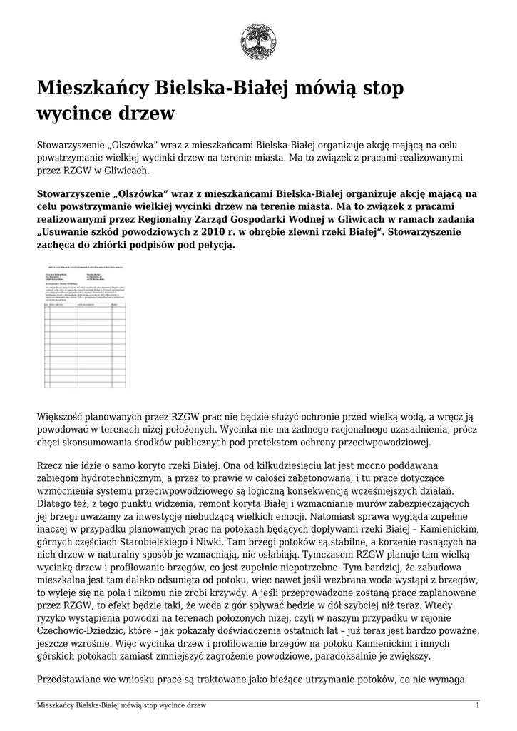 Mieszkańcy Bielska-Białej mówią stop wycince drzew Stowarzyszenie „Olszówka” wraz z mieszkańcami Bielska-Białej organizuje akcję mającą na celu powstrzymanie wielkiej wycinki drzew na terenie miasta. Ma to związek z pracami realizowanymi przez RZGW w Gliwicach. Stowarzyszenie „Olszówka” wraz z mieszkańcami Bielska-Białej organizuje akcję mającą na celu powstrzymanie wielkiej wycinki drzew na terenie miasta. Ma to związek z pracami realizowanymi przez Regionalny Zarząd Gospodarki Wodnej w Gliwicach w ramach zadania „Usuwanie szkód powodziowych z 2010 r. w obrębie zlewni rzeki Białej”. Stowarzyszenie zachęca do zbiórki podpisów pod petycją. Większość planowanych przez RZGW prac nie będzie służyć ochronie przed wielką wodą, a wręcz ją powodować w terenach niżej położonych. Wycinka nie ma żadnego racjonalnego uzasadnienia, prócz chęci skonsumowania środków publicznych pod pretekstem ochrony przeciwpowodziowej. Rzecz nie idzie o samo koryto rzeki Białej. Ona od kilkudziesięciu lat jest mocno poddawana zabiegom hydrotechnicznym, a przez to prawie w całości zabetonowana, i tu prace dotyczące wzmocnienia systemu przeciwpowodziowego są logiczną konsekwencją wcześniejszych działań. Dlatego też, z tego punktu widzenia, remont koryta Białej i wzmacnianie murów zabezpieczających jej brzegi uważamy za inwestycję niebudzącą wielkich emocji. Natomiast sprawa wygląda zupełnie inaczej w przypadku planowanych prac na potokach będących dopływami rzeki Białej – Kamienickim, górnych częściach Starobielskiego i Niwki. Tam brzegi potoków są stabilne, a korzenie rosnących na nich drzew w naturalny sposób je wzmacniają, nie osłabiają. Tymczasem RZGW planuje tam wielką wycinkę drzew i profilowanie brzegów, co jest zupełnie niepotrzebne. Tym bardziej, że zabudowa mieszkalna jest tam daleko odsunięta od potoku, więc nawet jeśli wezbrana woda wystąpi z brzegów, to wyleje się na pola i nikomu nie zrobi krzywdy. A jeśli przeprowadzone zostaną prace zaplanowane przez RZGW, to efekt będzie taki, że woda z gór spływać będzie w dół szybciej niż teraz. Wtedy ryzyko wystąpienia powodzi na terenach położonych niżej, czyli w naszym przypadku w rejonie Czechowic-Dziedzic, które – jak pokazały doświadczenia ostatnich lat – już teraz jest bardzo poważne, jeszcze wzrośnie. Więc wycinka drzew i profilowanie brzegów na potoku Kamienickim i innych górskich potokach zamiast zmniejszyć zagrożenie powodziowe, paradoksalnie je zwiększy. Przedstawiane we wniosku prace są traktowane jako bieżące utrzymanie potoków, co nie wymaga Mieszkańcy Bielska-Białej mówią stop wycince drzew 1 wykonania oceny oddziaływania inwestycji na środowisko. Tymczasem działania mają być prowadzone w miejscach, gdzie nikt wcześniej nie wprowadzał tam tzw. urządzeń hydrotechnicznych, bo nigdy nie były potrzebne. Mało tego potok Kamieniecki jest główną osią obszaru o wybitnych walorach przyrodniczych, co zostało podkreślone poprzez utworzenie tu w 2006 roku Zespołu Przyrodniczo-Krajobrazowego „Gościnna Dolina”. Zagrożony potok. Fot. Jacek Zachara Dodatkowego smaczku całej sprawie dodaje ogłoszenie przez Komisję Europejską w marcu br. swojego stanowiska, w którym informuje, że skierowano przeciwko Polsce zarzuty dotyczące łamania unijnego prawa związanego z gospodarką wodną. Zdaniem Komisji Europejskiej, prace realizowane na polskich rzekach, określane jako ich bieżące utrzymywanie, w rzeczywistości są znacznie szersze i wielokrotnie powodują trwałe przekształcenia koryta rzecznego oraz strefy brzegowej. A takie przekształcenia, zgodnie z unijnym prawem, wymagają uprzedniej oceny oddziaływania inwestycji na środowisko, która w Polsce nie jest robiona. Jeśli Komisja Europejska nie uwzględni wyjaśnień rządu na temat zarzutów, sprawa może trafić do Europejskiego Trybunału Sprawiedliwości. Zarzuty Komisji Europejskiej dowodzą, że administratorzy rzek i potoków, tacy jak gliwicki RZGW, robią źle, a ich postępowanie zostało dostrzeżone przez Unię Europejską. Będziemy podnosić ten argument sprzeciwiając się tym pracom na bielskich potokach, działania te uważamy bowiem za niepotrzebne i szkodliwe i powodujące nieodwracalne szkody w środowisku naturalnym, a także w sposób bezpośredni przyczyniają się powstawaniem zagrożenia powodziowe na niżej położonych terenach, miast im zapobiegać. Dobrzy by było, aby ogromne pieniądze publiczne, które idą na ten cel, szły na realną walkę z zagrożeniem powodziowym poprzez np. odbudowę lub budowę wałów w rejonie Czechowic-Dziedzic. Nie tak dawno temu (w roku 2010) cały ten teren był zatopiony m.in. dlatego, że uregulowane cieki wodne w wyżej położonych partiach szybko oddawały wodę na tereny niżej położone. W Europie zachodniej już dawno to zauważono. Tylko w Polsce są wprowadzane anachroniczne i pozbawione logiki działania, którymi z mocy prawa zarządzają RZGW. Mieszkańcy Bielska-Białej mówią stop wycince drzew 2 Szczegóły informacji: Jacek Zachara, Stowarzyszenie „Olszówka” tel. 693 315 998, e-mail: [email protected] Mieszkańcy Bielska-Białej mówią stop wycince drzew 3