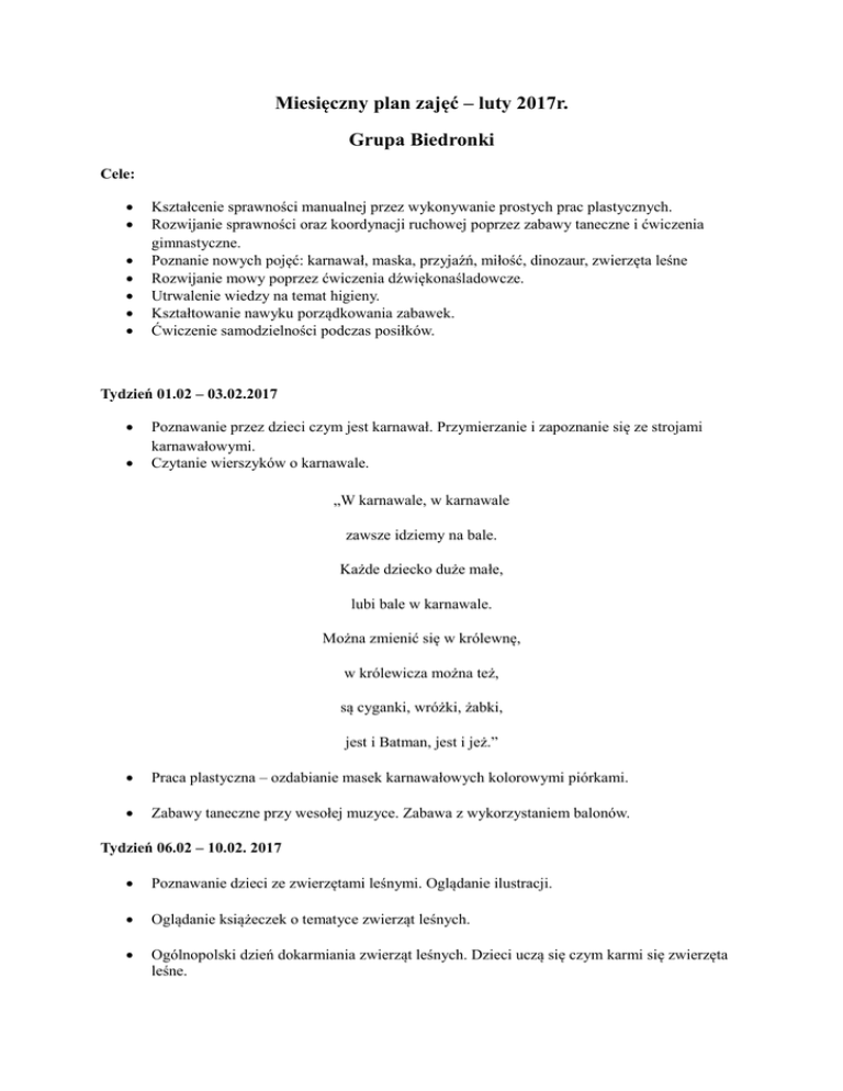 Miesięczny plan zajęć – luty 2017r. Grupa Biedronki