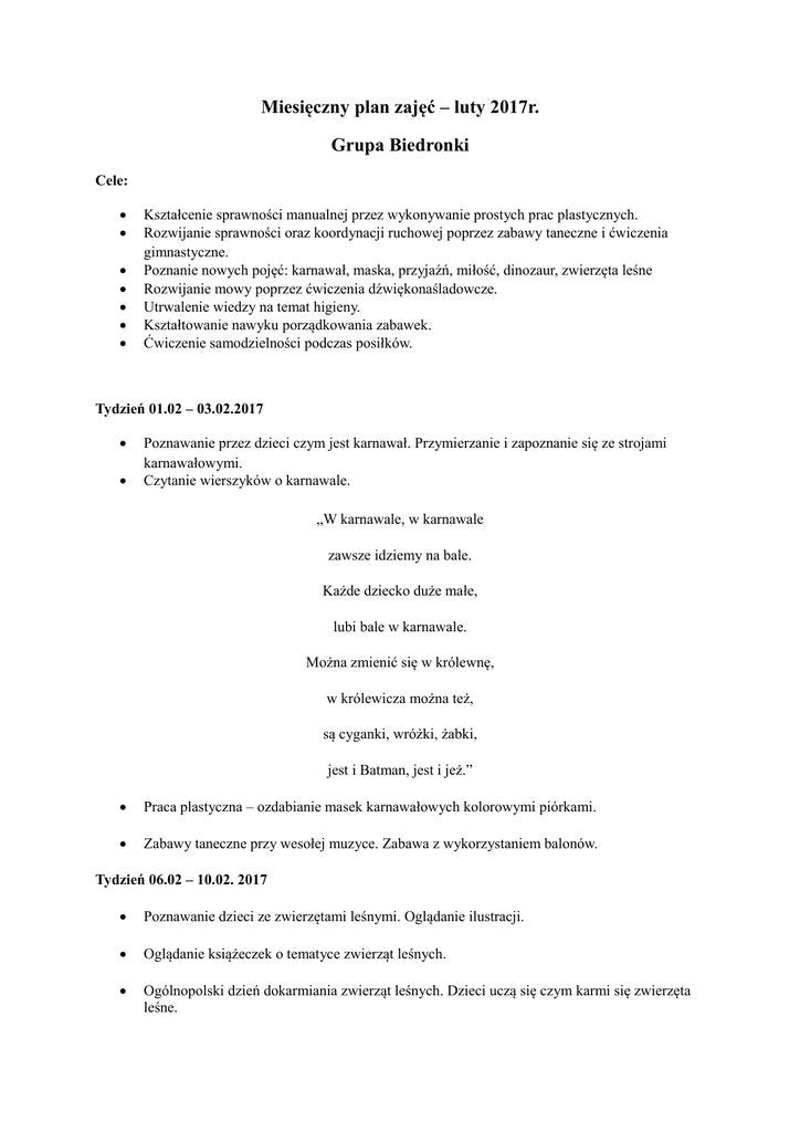 Miesięczny plan zajęć – luty 2017r. Grupa Biedronki Cele: Kształcenie sprawności manualnej przez wykonywanie prostych prac plastycznych. Rozwijanie sprawności oraz koordynacji ruchowej poprzez zabawy taneczne i ćwiczenia gimnastyczne. Poznanie nowych pojęć: karnawał, maska, przyjaźń, miłość, dinozaur, zwierzęta leśne Rozwijanie mowy poprzez ćwiczenia dźwiękonaśladowcze. Utrwalenie wiedzy na temat higieny. Kształtowanie nawyku porządkowania zabawek. Ćwiczenie samodzielności podczas posiłków. Tydzień 01.02 – 03.02.2017 Poznawanie przez dzieci czym jest karnawał. Przymierzanie i zapoznanie się ze strojami karnawałowymi. Czytanie wierszyków o karnawale. „W karnawale, w karnawale zawsze idziemy na bale. Każde dziecko duże małe, lubi bale w karnawale. Można zmienić się w królewnę, w królewicza można też, są cyganki, wróżki, żabki, jest i Batman, jest i jeż.” Praca plastyczna – ozdabianie masek karnawałowych kolorowymi piórkami. Zabawy taneczne przy wesołej muzyce. Zabawa z wykorzystaniem balonów. Tydzień 06.02 – 10.02. 2017 Poznawanie dzieci ze zwierzętami leśnymi. Oglądanie ilustracji. Oglądanie książeczek o tematyce zwierząt leśnych. Ogólnopolski dzień dokarmiania zwierząt leśnych. Dzieci uczą się czym karmi się zwierzęta leśne. Praca plastyczna – Wyklejanie kolorowym papierem dzika i przyklejanie pokarmów, które spożywa (jabłuszka, marchewki, ziarno z papieru). Słuchanie odgłosów zwierząt. Bajka pt. „Ptasie radio” J. Tuwima. Czytanie wierszyków J. Brzechwy pt. „Dzik”, „Wilk” „Dzik” Jan Brzechwa Dzik jest dziki, dzik jest zły, Dzik ma bardzo ostre kły. Kto spotyka w lesie dzika, Ten na drzewko szybko zmyka.” Zabawa ruchowa przy muzyce „ Stary niedźwiedź mocno śpi”. Tydzień 13.02 – 17.02.2017 Zapoznanie dzieci z pojęciem miłość i przyjaźń. Nauka prostych gestów – uściśnięcie dłoni, przytulenie. Rozwijanie wyobraźni, czytanie bajki pt. „ Bajka o przyjaźni”. Czytanie wierszyka pt. „ Całuski i buziaczki” A. Frączek Całuski i buziaczki Hipopotam, słoń czy smok Każdy czasem cmoka: cmok! Całus mamy pachnie groszkiem, bzem, budyniem i tym proszkiem, który sypie do szarlotki. To dlatego jest tak słodki! Buziak taty troszkę kłuje, więc gdy tatuś mnie całuje w nosek lub po bosych piętach, to ze śmiechu prawie pękam! Całus dziadka jest brodaty i ma kształt cukrowej waty, a w dodatku, jak mag z baśni, umie każdy mrok rozjaśnić! Babcia zaś całuje tak, jakby piórkiem muskał ptak delikatnie i mięciutko, ciepło i z uśmiechu nutką. Za to całus mego brata... to kataklizm! koniec świata!!! Gdy ten maluch cmoknie: Cmok!, człowiek ma we włosach sok, pół lizaka i obiadek, błoto, piach i czekoladę. Co innego, gdybym... gdybym... dostał kiedyś (choć na niby) garść buziaków od tej Zosi, która czapkę w groszki nosi... Eee... nie mówmy o tym. Psyt! Bo zrobiło mi się wstyd. Całus Reksia jest jak sztorm nie uznaje żadnych norm, atakuje niespodzianie, burzy mamie uczesanie, potem tatę liże w nos, a mnie w ucho... co za los! Jednak wszystkie te całusy: taty - szorstkie jak kaktusy, brata - lekko upaćkane, mamy - słodkie i kochane, psa - kudłate i szalone, darowane i kradzione pocałunki babć i Zoś, wszystkie z sobą łączy... coś. Co takiego ? Mówiąc w skrócie, to po prostu jest... UCZUCIE ! Misiu...? Misiu, nie uciekaj! Daj mi buzi! No...? Nie zwlekaj! Przecież każdy - miś czy smok czasem cmoka: cmok... cmok! cmok!!! Praca plastyczna – wyklejanie serca kulkami z bibuły. Słuchanie piosenek o miłości i przyjaźni: „Miłość rośnie wokół nas”, „ W przyjaźni jest siła”. Zabawy ruchowe z muzyką. Tydzień 20.02 – 25.02.2017 Dzień dinozaura. Opowiedzenie dzieciom co to jest dinozaur. Oglądanie ilustracji przedstawiających dinozaury. Pokazanie dzieciom zabawkowych dinozaurów. Zabawa nimi. Praca plastyczna – wykonanie dinozaura z papieru. Dzieci przyklejają głowę, tułów, ręce, nogi, oczy, zęby. Oglądanie książeczek o dinozaurach. Czytanie wierszyka Seweryna Topczewskiego pt. „ Dinozaury” Dinozaury Wiele temu długich lat Trochę inny był nasz Świat. Dinozaury na nim żyły, I królami Świata były. Tyrek, czyli Tyranozaur, Co zobaczył, wszystko pożarł. Wszyscy przed nim uciekali, Bo się go okropnie bali. Ceratozaur zwany Cerat Także mięsem się obżerał Miał na grzbiecie kostne tarczki, I był skory do utarczki. A Celofyz, krótko Celef Też kłopotów sprawiał wiele. Kości puste w środku miał, I przed siebie prędko gnał. Zaś Diplodok, słodki Dipo, Co miał uśmiechnięte lico, Trawą co dnia się objadał I nikomu nie przeszkadzał. Triceratops zwany Tricer, Choć rogate miał oblicze, Pośród traw wędrował stadem I nie szukał z nikim zwady. Platek, czyli Pleteozaur, Kontynenty wsze przemierzał, Sprawdzał jak smakują wszystkie, Świata trawy oraz liście. Sceli, czyli Scelidozaur, Też nikomu nie zagrażał. Spacerował po Europie, Ten roślinożerny chłopiec. Pterkiem zwany Pterodaktyl, Ryby lubił nie na żarty. Jako jeden umiał latać, Tak zobaczył kawał Świata. Świata, w którym meteoryt Zamęt zrobił całkiem spory! I miliony temu lat Zniszczył Dinozaurów Świat. Słuchanie piosenki pt. „ Dinozaury z Juraparku”. Zabawy taneczne i ruchowe - udajemy dinozaury. Tydzień 27.02 – 28.02.2017 Dzień niedźwiedzia polarnego. Oglądanie obrazków przedstawiających niedźwiedzia. Przypomnienie pory roku jaka panuje – zima. Praca plastyczna – wyklejanie watą niedźwiedzia polarnego. Wykonała Justyna Kałęka