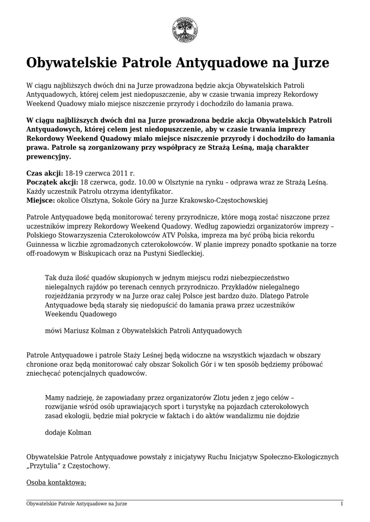 Obywatelskie Patrole Antyquadowe na Jurze W ciągu najbliższych dwóch dni na Jurze prowadzona będzie akcja Obywatelskich Patroli Antyquadowych, której celem jest niedopuszczenie, aby w czasie trwania imprezy Rekordowy Weekend Quadowy miało miejsce niszczenie przyrody i dochodziło do łamania prawa. W ciągu najbliższych dwóch dni na Jurze prowadzona będzie akcja Obywatelskich Patroli Antyquadowych, której celem jest niedopuszczenie, aby w czasie trwania imprezy Rekordowy Weekend Quadowy miało miejsce niszczenie przyrody i dochodziło do łamania prawa. Patrole są zorganizowany przy współpracy ze Strażą Leśną, mają charakter prewencyjny. Czas akcji: 18-19 czerwca 2011 r. Początek akcji: 18 czerwca, godz. 10.00 w Olsztynie na rynku – odprawa wraz ze Strażą Leśną. Każdy uczestnik Patrolu otrzyma identyfikator. Miejsce: okolice Olsztyna, Sokole Góry na Jurze Krakowsko-Częstochowskiej Patrole Antyquadowe będą monitorować tereny przyrodnicze, które mogą zostać niszczone przez uczestników imprezy Rekordowy Weekend Quadowy. Według zapowiedzi organizatorów imprezy – Polskiego Stowarzyszenia Czterokołowców ATV Polska, impreza ma być próbą bicia rekordu Guinnessa w liczbie zgromadzonych czterokołowców. W planie imprezy ponadto spotkanie na torze off-roadowym w Biskupicach oraz na Pustyni Siedleckiej. Tak duża ilość quadów skupionych w jednym miejscu rodzi niebezpieczeństwo nielegalnych rajdów po terenach cennych przyrodniczo. Przykładów nielegalnego rozjeżdżania przyrody w na Jurze oraz całej Polsce jest bardzo dużo. Dlatego Patrole Antyquadowe będą starały się niedopuścić do łamania prawa przez uczestników Weekendu Quadowego mówi Mariusz Kolman z Obywatelskich Patroli Antyquadowych Patrole Antyquadowe i patrole Staży Leśnej będą widoczne na wszystkich wjazdach w obszary chronione oraz będą monitorować cały obszar Sokolich Gór i w ten sposób będziemy próbować zniechęcać potencjalnych quadowców. Mamy nadzieję, że zapowiadany przez organizatorów Zlotu jeden z jego celów – rozwijanie wśród osób uprawiających sport i turystykę na pojazdach czterokołowych zasad ekologii, będzie miał pokrycie w faktach i do aktów wandalizmu nie dojdzie dodaje Kolman Obywatelskie Patrole Antyquadowe powstały z inicjatywy Ruchu Inicjatyw Społeczno-Ekologicznych „Przytulia” z Częstochowy. Osoba kontaktowa: Obywatelskie Patrole Antyquadowe na Jurze 1 Obywatelskie Patrole Antyquadowe Mariusz Kolman, tel. 668 014 909 Obywatelskie Patrole Antyquadowe na Jurze 2