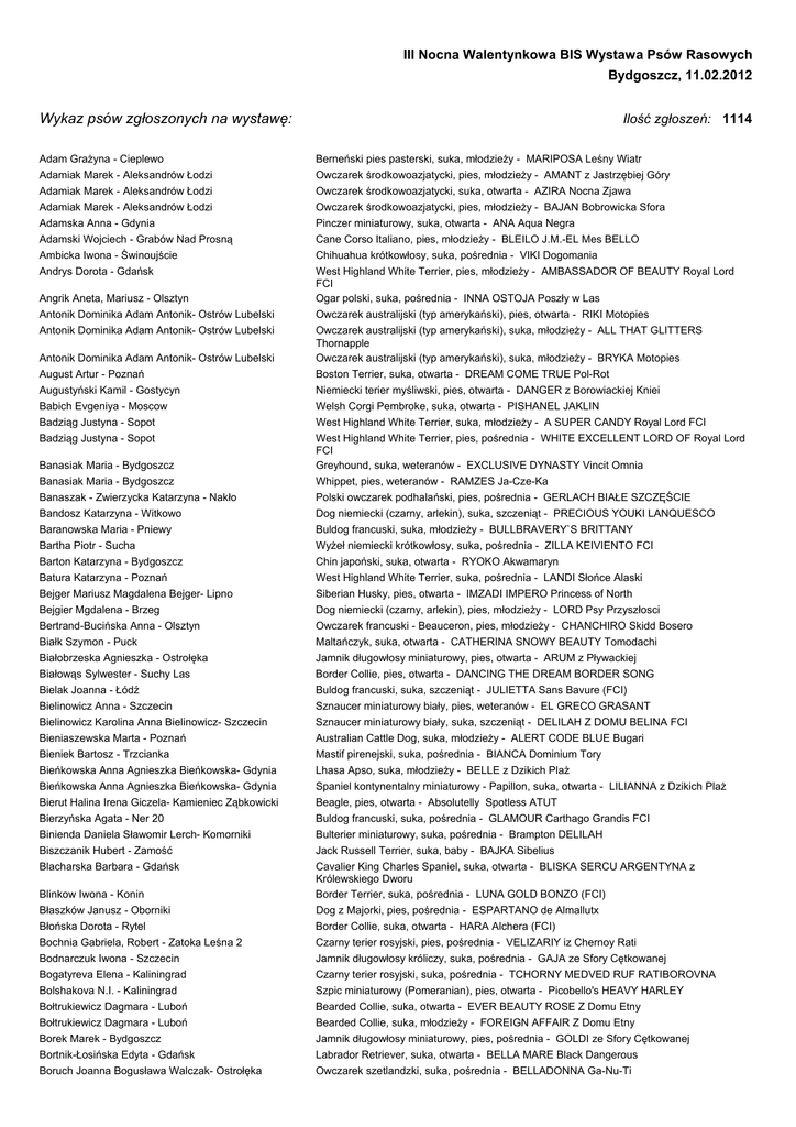 III Nocna Walentynkowa BIS Wystawa Psów Rasowych Bydgoszcz, 11.02.2012 Wykaz psów zgłoszonych na wystawę: Ilość zgłoszeń: 1114 Adam Grażyna - Cieplewo Berneński pies pasterski, suka, młodzieży - MARIPOSA Leśny Wiatr Adamiak Marek - Aleksandrów Łodzi Adamiak Marek - Aleksandrów Łodzi Owczarek środkowoazjatycki, pies, młodzieży - AMANT z Jastrzębiej Góry Owczarek środkowoazjatycki, suka, otwarta - AZIRA Nocna Zjawa Adamiak Marek - Aleksandrów Łodzi Owczarek środkowoazjatycki, pies, młodzieży - BAJAN Bobrowicka Sfora Adamska Anna - Gdynia Adamski Wojciech - Grabów Nad Prosną Pinczer miniaturowy, suka, otwarta - ANA Aqua Negra Cane Corso Italiano, pies, młodzieży - BLEILO J.M.-EL Mes BELLO Ambicka Iwona - Świnoujście Chihuahua krótkowłosy, suka, pośrednia - VIKI Dogomania Andrys Dorota - Gdańsk West Highland White Terrier, pies, młodzieży - AMBASSADOR OF BEAUTY Royal Lord FCI Ogar polski, suka, pośrednia - INNA OSTOJA Poszły w Las Owczarek australijski (typ amerykański), pies, otwarta - RIKI Motopies Angrik Aneta, Mariusz - Olsztyn Antonik Dominika Adam Antonik- Ostrów Lubelski Antonik Dominika Adam Antonik- Ostrów Lubelski Antonik Dominika Adam Antonik- Ostrów Lubelski August Artur - Poznań Owczarek australijski (typ amerykański), suka, młodzieży - ALL THAT GLITTERS Thornapple Owczarek australijski (typ amerykański), suka, młodzieży - BRYKA Motopies Boston Terrier, suka, otwarta - DREAM COME TRUE Pol-Rot Augustyński Kamil - Gostycyn Niemiecki terier myśliwski, pies, otwarta - DANGER z Borowiackiej Kniei Babich Evgeniya - Moscow Badziąg Justyna - Sopot Welsh Corgi Pembroke, suka, otwarta - PISHANEL JAKLIN West Highland White Terrier, suka, młodzieży - A SUPER CANDY Royal Lord FCI Badziąg Justyna - Sopot Banasiak Maria - Bydgoszcz Banasiak Maria - Bydgoszcz Banaszak - Zwierzycka Katarzyna - Nakło West Highland White Terrier, pies, pośrednia - WHITE EXCELLENT LORD OF Royal Lord FCI Greyhound, suka, weteranów - EXCLUSIVE DYNASTY Vincit Omnia Whippet, pies, weteranów - RAMZES Ja-Cze-Ka Polski owczarek podhalański, pies, pośrednia - GERLACH BIAŁE SZCZĘŚCIE Bandosz Katarzyna - Witkowo Baranowska Maria - Pniewy Dog niemiecki (czarny, arlekin), suka, szczeniąt - PRECIOUS YOUKI LANQUESCO Buldog francuski, suka, młodzieży - BULLBRAVERY`S BRITTANY Bartha Piotr - Sucha Barton Katarzyna - Bydgoszcz Batura Katarzyna - Poznań Wyżeł niemiecki krótkowłosy, suka, pośrednia - ZILLA KEIVIENTO FCI Chin japoński, suka, otwarta - RYOKO Akwamaryn West Highland White Terrier, suka, pośrednia - LANDI Słońce Alaski Bejger Mariusz Magdalena Bejger- Lipno Bejgier Mgdalena - Brzeg Bertrand-Bucińska Anna - Olsztyn Siberian Husky, pies, otwarta - IMZADI IMPERO Princess of North Dog niemiecki (czarny, arlekin), pies, młodzieży - LORD Psy Przyszłosci Owczarek francuski - Beauceron, pies, młodzieży - CHANCHIRO Skidd Bosero Białk Szymon - Puck Białobrzeska Agnieszka - Ostrołęka Białowąs Sylwester - Suchy Las Bielak Joanna - Łódź Bielinowicz Anna - Szczecin Bielinowicz Karolina Anna Bielinowicz- Szczecin Maltańczyk, suka, otwarta - CATHERINA SNOWY BEAUTY Tomodachi Jamnik długowłosy miniaturowy, pies, otwarta - ARUM z Pływackiej Border Collie, pies, otwarta - DANCING THE DREAM BORDER SONG Buldog francuski, suka, szczeniąt - JULIETTA Sans Bavure (FCI) Sznaucer miniaturowy biały, pies, weteranów - EL GRECO GRASANT Sznaucer miniaturowy biały, suka, szczeniąt - DELILAH Z DOMU BELINA FCI Bieniaszewska Marta - Poznań Bieniek Bartosz - Trzcianka Bieńkowska Anna Agnieszka Bieńkowska- Gdynia Bieńkowska Anna Agnieszka Bieńkowska- Gdynia Bierut Halina Irena Giczela- Kamieniec Ząbkowicki Bierzyńska Agata - Ner 20 Binienda Daniela Sławomir Lerch- Komorniki Biszczanik Hubert - Zamość Blacharska Barbara - Gdańsk Blinkow Iwona - Konin Błaszków Janusz - Oborniki Błońska Dorota - Rytel Bochnia Gabriela, Robert - Zatoka Leśna 2 Bodnarczuk Iwona - Szczecin Bogatyreva Elena - Kaliningrad Bolshakova N.I. - Kaliningrad Bołtrukiewicz Dagmara - Luboń Bołtrukiewicz Dagmara - Luboń Borek Marek - Bydgoszcz Australian Cattle Dog, suka, młodzieży - ALERT CODE BLUE Bugari Mastif pirenejski, suka, pośrednia - BIANCA Dominium Tory Lhasa Apso, suka, młodzieży - BELLE z Dzikich Plaż Spaniel kontynentalny miniaturowy - Papillon, suka, otwarta - LILIANNA z Dzikich Plaż Beagle, pies, otwarta - Absolutelly Spotless ATUT Buldog francuski, suka, pośrednia - GLAMOUR Carthago Grandis FCI Bulterier miniaturowy, suka, pośrednia - Brampton DELILAH Jack Russell Terrier, suka, baby - BAJKA Sibelius Cavalier King Charles Spaniel, suka, otwarta - BLISKA SERCU ARGENTYNA z Królewskiego Dworu Border Terrier, suka, pośrednia - LUNA GOLD BONZO (FCI) Dog z Majorki, pies, pośrednia - ESPARTANO de Almallutx Border Collie, suka, otwarta - HARA Alchera (FCI) Czarny terier rosyjski, pies, pośrednia - VELIZARIY iz Chernoy Rati Jamnik długowłosy króliczy, suka, pośrednia - GAJA ze Sfory Cętkowanej Czarny terier rosyjski, suka, pośrednia - TCHORNY MEDVED RUF RATIBOROVNA Szpic miniaturowy (Pomeranian), pies, otwarta - Picobello's HEAVY HARLEY Bearded Collie, suka, otwarta - EVER BEAUTY ROSE Z Domu Etny Bearded Collie, suka, młodzieży - FOREIGN AFFAIR Z Domu Etny Jamnik długowłosy miniaturowy, pies, pośrednia - GOLDI ze Sfory Cętkowanej Bortnik-Łosińska Edyta - Gdańsk Boruch Joanna Bogusława Walczak- Ostrołęka Labrador Retriever, suka, otwarta - BELLA MARE Black Dangerous Owczarek szetlandzki, suka, pośrednia - BELLADONNA Ga-Nu-Ti Bożko Piotr - Bielsk Podlaski Owczarek niemiecki krótkowłosy, pies, pośrednia - FRANZ Ardelia Bożko Piotr - Bielsk Podlaski Bożko Piotr - Bielsk Podlaski Owczarek niemiecki krótkowłosy, suka, pośrednia - DIMI Ardelia Owczarek niemiecki krótkowłosy, pies, otwarta - DAX Ardelia Bożko Piotr - Bielsk Podlaski Owczarek niemiecki krótkowłosy, suka, otwarta - FOSA Ardelia Bożko Piotr - Bielsk Podlaski Bra