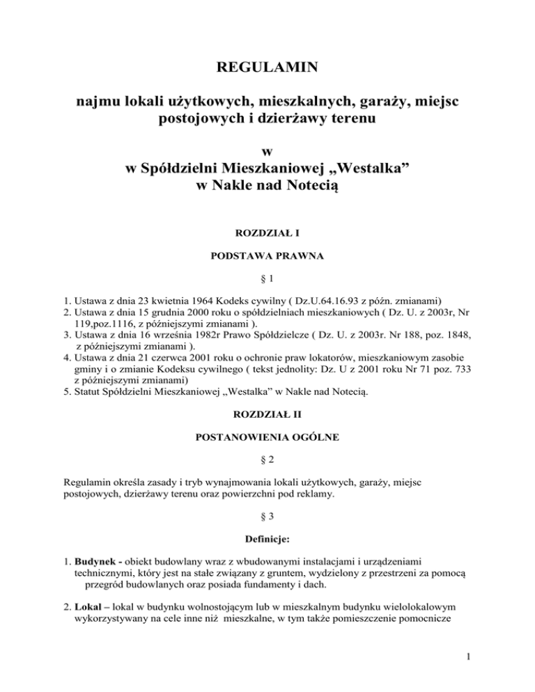 REGULAMIN najmu lokali użytkowych, mieszkalnych, garaży, miejsc