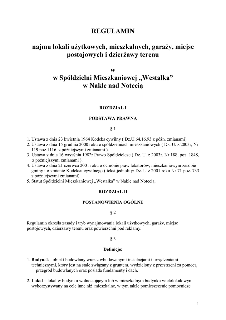REGULAMIN najmu lokali użytkowych, mieszkalnych, garaży, miejsc postojowych i dzierżawy terenu w w Spółdzielni Mieszkaniowej „Westalka” w Nakle nad Notecią ROZDZIAŁ I PODSTAWA PRAWNA §1 1. Ustawa z dnia 23 kwietnia 1964 Kodeks cywilny ( Dz.U.64.16.93 z późn. zmianami) 2. Ustawa z dnia 15 grudnia 2000 roku o spółdzielniach mieszkaniowych ( Dz. U. z 2003r, Nr 119,poz.1116, z późniejszymi zmianami ). 3. Ustawa z dnia 16 września 1982r Prawo Spółdzielcze ( Dz. U. z 2003r. Nr 188, poz. 1848, z późniejszymi zmianami ). 4. Ustawa z dnia 21 czerwca 2001 roku o ochronie praw lokatorów, mieszkaniowym zasobie gminy i o zmianie Kodeksu cywilnego ( tekst jednolity: Dz. U z 2001 roku Nr 71 poz. 733 z późniejszymi zmianami) 5. Statut Spółdzielni Mieszkaniowej „Westalka” w Nakle nad Notecią. ROZDZIAŁ II POSTANOWIENIA OGÓLNE §2 Regulamin określa zasady i tryb wynajmowania lokali użytkowych, garaży, miejsc postojowych, dzierżawy terenu oraz powierzchni pod reklamy. §3 Definicje: 1. Budynek - obiekt budowlany wraz z wbudowanymi instalacjami i urządzeniami technicznymi, który jest na stałe związany z gruntem, wydzielony z przestrzeni za pomocą przegród budowlanych oraz posiada fundamenty i dach. 2. Lokal – lokal w budynku wolnostojącym lub w mieszkalnym budynku wielolokalowym wykorzystywany na cele inne niż mieszkalne, w tym także pomieszczenie pomocnicze 1 wolne w sensie prawnym, które nie przynależy do lokalu mieszkalnego lub użytkowego. 3. Powierzchnia użytkowa lokalu - powierzchnia stanowiąca podstawę rozliczania kosztów i naliczania wymiaru opłat. Powierzchnia użytkowa lokalu wynika z prawomocnej Uchwały Zarządu określającej przedmiot odrębnej własności lokali w danej nieruchomości, zaś w przypadku braku takiej uchwały powierzchnia użytkowa lokalu zostanie ustalona na podstawie obmiaru dokonanego przez Spółdzielnię na wysokości jednego metra nad podłogą pomiędzy osiami ścian wydzielających lokal, przy czym do powierzchni lokalu zalicza się również powierzchnię zajętą przez jakiekolwiek ściany działowe, słupy bądź inne elementy konstrukcyjne znajdujące się w lokalu. 4. Reklama - wszelkiego rodzaju nośniki informacyjno- reklamowe, takie jak znaki graficzne i opisy umieszczone na tablicach informacyjnych, szyldy, billbordy i banery. 5. Opłaty niezależne od właściciela - opłaty za dostawę do lokalu energii elektrycznej, gazu, wody, odbioru ścieków, wywozu nieczystości. 6 .Kaucja - zabezpieczenie pieniężne, którego celem jest zabezpieczenie ewentualnych roszczeń Spółdzielni powstałych w związku z umową najmu lub dzierżawy. §4 Do zawierania umów ze strony Spółdzielni upoważniony jest Zarząd. Szczegółowe warunki najmu lokali użytkowych, garaży i miejsc postojowych oraz dzierżawy terenu oraz powierzchni pod reklamy, a także obowiązki Najemcy/Dzierżawcy i Spółdzielni określa umowa najmu/dzierżawy. §5 Przygotowaniem procedur dotyczących najmu lokali użytkowych, garaży, miejsc postojowych, miejsc pod reklamy i dzierżawy terenu zajmuje się Specjalista ds. rachunkowości, płac, kadr i administracji. §6 Protokół zdawczo- odbiorczy w imieniu Spółdzielni podpisują dwie osoby tj. Specjalista ds. rachunkowości, płac, kadr i administracji wraz z pracownikiem Działu Technicznego. Protokół stanowi integralną część umowy i jest podstawą rozliczeń przy zwrocie przedmiotu umowy. §7 Oferenci przystępujący do konkursu zobowiązani są do wpłaty wadium na rachunek bankowy lub w wysokości podanej w ogłoszeniu o składaniu ofert. Osobom, których oferty nie zostały wybrane, wpłacone wadium zwraca się w terminie 7 dni od daty rozstrzygnięcia konkursu. §8 2 Koszty przystosowania i adaptacji przedmiotu umowy ponosi Najemca/Dzierżawca, po uzgodnieniu zakresu robót ze Spółdzielnią. Koszty te nie podlegają rozliczeniu ze Spółdzielnią. §9 Wszelkie przekształcenia prawne lub organizacyjne zaistniałe po stronie Najemcy wymagają zawarcia nowej umowy. § 10 Najemca/Dzierżawca korzystający z przedmiotu umowy po jej rozwiązaniu lub wygaśnięciu zobowiązany jest do zapłaty odszkodowania w wysokości wynikającej z zawartej umowy. § 11 Najemca lokalu ma obowiązek, na żądanie Spółdzielni, umożliwić wejście do lokalu ilekroć jest to niezbędne do przeprowadzenia przeglądu, konserwacji, remontu, usunięcia awarii oraz dokonania odczytu urządzeń pomiarowych. ROZDZIAŁ III NAJEM LOKALI UŻYTKOWYCH § 12 Najemcy lokali wybierani są w drodze konkursu ofert, który ma na celu wyłonienie najkorzystniejszej oferty dla Spółdzielni. § 13 Rada Nadzorcza na wniosek Zarządu może określić dla wskazanych lokali szczególne warunki ich użytkowania, a także odstąpić od ogłaszania konkursu ofert, jeżeli przemawiają za tym uzasadnione względy społeczne. § 14 W konkursie nie będą rozpatrywane oferty Najemców, którzy w ostatnim roku nie regulowali w wyznaczonych terminach swoich zobowiązań wobec Spółdzielni. § 15 Osoby składające oferty mają prawo do zapoznania się z dokumentacją i stanem technicznym lokalu oraz ze wzorem umowy najmu. § 16 Oferty winny być składane w miejscu i terminie podanym w ogłoszeniu, w zamkniętych i opieczętowanych kopertach. 3 § 17 Zasady przeprowadzania konkursu ofert 1. Ogłoszenie o składaniu ofert dotyczących najmu lokali użytkowych, zamieszcza się na stronie internetowej Spółdzielni, a w uzasadnionych przypadkach dodatkowo w prasie lokalnej, co najmniej na 2 tygodnie przed wyznaczonym terminem konkursu. 2. Ogłoszenie dotyczące składania ofert powinno zawierać: a) nazwę i adres Spółdzielni, b) miejsce i termin składania ofert, c) opis i lokalizację lokalu, d) wysokość wadium, e) nr rachunku bankowego Spółdzielni, na które należy wpłacić wadium, f) informacje o warunkach jakie muszą spełniać uczestnicy konkursu, g) termin związania ofertą, h) adres strony internetowej Spółdzie