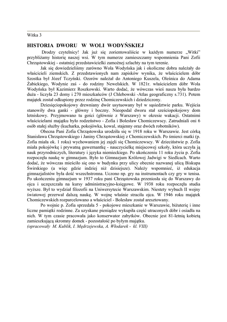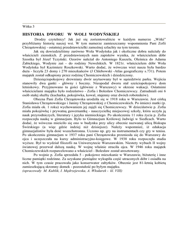 Witka 3 HISTORIA DWORU W WOLI WODYŃSKIEJ Drodzy czytelnicy! Jak już się zorientowaliście w każdym numerze „Witki” przybliżamy historię naszej wsi. W tym numerze zamieszczamy wspomnienia Pani Zofii Chrząstowskiej - ostatniej przedstawicielki zamożnej szlachty na tym terenie. Jak się dowiedzieliśmy zarówno Wola Wodyńska jak i okoliczne dobra należały do właścicieli ziemskich. Z przedstawionych nam zapisków wynika, że właścicielem dóbr Szostka był Józef Tczyński. Ozorów należał do Antoniego Kuszela, Oleśnica do Adama Żabickiego, Wodynie zaś - do rodziny Newelskich. W 1821r. właścicielem dóbr Wola Wodyńska był Kazimierz Roszkowski. Warto dodać, że wówczas wieś nasza była bardzo duża - liczyła 23 domy i 270 mieszkańców (J Chlebowski -Atlas geograficzny s.731). Potem majątek został odkupiony przez rodzinę Chomiczewskich i dziedziczony. Dziesięciopokojowy drewniany dwór usytuowany był w sąsiedztwie parku. Wejścia stanowiły dwa ganki - główny i boczny. Nieopodal dworu stał sześciopokojowy dom letniskowy. Przyjmowano tu gości (głównie z Warszawy) w okresie wakacji. Ostatnimi właścicielami majątku było rodzeństwo - Zofia i Bolesław Chomiczewscy. Zatrudniali oni 6 osób stałej służby (kucharka, pokojówka, kowal, stajenny oraz dwóch robotników). Obecna Pani Zofia Chrząstowska urodziła się w 1918 roku w Warszawie. Jest córką Stanisława Chrząstowskiego i Janiny Chrząstowskiej z Chomiczewskich. Po śmierci matki (p. Zofia miała ok. 1 roku) wychowaniem jej zajęli się Chomiczewscy. W dzieciństwie p. Zofia miała pokojówkę i prywatną guwernantkę - nauczycielkę miejscowej szkoły, która uczyła ją nauk przyrodniczych, literatury i języka niemieckiego. Po ukończeniu 11 roku życia p. Zofia rozpoczęła naukę w gimnazjum. Było to Gimnazjum Królowej Jadwigi w Siedlcach. Warto dodać, że wówczas mieściło się ono w budynku przy ulicy obecnie nazwanej ulicą Biskupa Świrskiego (a więc gdzie indziej niż dzisiejsze). Należy wspomnieć, iż edukacja gimnazjalistów była dość wszechstronna. Uczono np. gry na instrumentach czy gry w tenisa. Po ukończeniu gimnazjum w 1937 roku pani Chrząstowska przeniosła się do Warszawy do ojca i uczęszczała na kursy administracyjno-księgowe. W 1938 roku rozpoczęła studia wyższe. Był to wydział filozofii na Uniwersytecie Warszawskim. Niestety wybuch II wojny światowej przerwał dalszą naukę. W wojnę właśnie straciła ojca. W 1946 roku majątek Chomiczewskich rozparcelowano a właściciel - Bolesław został aresztowany. Po wojnie p. Zofia sprzedała 5 - pokojowe mieszkanie w Warszawie, biżuterię i inne liczne pamiątki rodzinne. Za uzyskane pieniądze wykupiła część utraconych dóbr i osiadła na nich. W tym czasie pracowała jako konserwator zabytków. Obecnie jest 81-letnią kobietą zamieszkującą skromny domek - pozostałość po byłym majątku. (opracowały M. Kublik, I. Mędrzejewska, A. Włodarek - kl. VIII) O S T A T N I A Jako nastolatka W czasie gry w tenisa – Siedlce 1934r. Przed dworem w Woli Wodyńskiej w towarzystwie przyjaciół z gimnazjum oraz dziedzica –1935r. Z D Z I E D Z I C Ó W. . . Dziedzic Bolesław Chomiczewski Spacer z ojcem po Warszawie-1936r Obecnie – rok 2000 Z O F I A C H R Z Ą S T O W S K A
