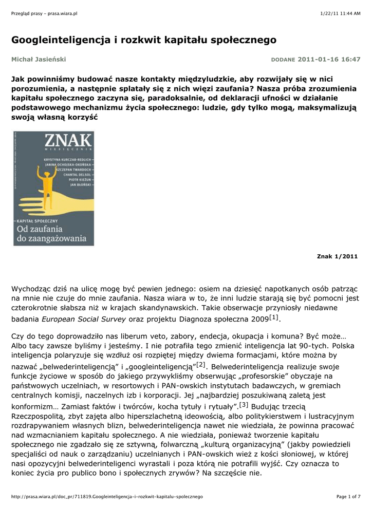 Przegląd prasy - prasa.wiara.pl 1/22/11 11:44 AM Googleinteligencja i rozkwit kapitału społecznego Michał Jasieński DODANE 2011-01-16 16:47 Jak powinniśmy budować nasze kontakty międzyludzkie, aby rozwijały się w nici porozumienia, a następnie splatały się z nich więzi zaufania? Nasza próba zrozumienia kapitału społecznego zaczyna się, paradoksalnie, od deklaracji ufności w działanie podstawowego mechanizmu życia społecznego: ludzie, gdy tylko mogą, maksymalizują swoją własną korzyść Znak 1/2011 Wychodząc dziś na ulicę mogę być pewien jednego: osiem na dziesięć napotkanych osób patrząc na mnie nie czuje do mnie zaufania. Nasza wiara w to, że inni ludzie starają się być pomocni jest czterokrotnie słabsza niż w krajach skandynawskich. Takie obserwacje przyniosły niedawne badania European Social Survey oraz projektu Diagnoza społeczna 2009[1] . Czy do tego doprowadziło nas liberum veto, zabory, endecja, okupacja i komuna? Być może… Albo tacy zawsze byliśmy i jesteśmy. I nie potrafiła tego zmienić inteligencja lat 90-tych. Polska inteligencja polaryzuje się wzdłuż osi rozpiętej między dwiema formacjami, które można by nazwać „belwederinteligencją” i „googleinteligencją” [2] . Belwederinteligencja realizuje swoje funkcje życiowe w sposób do jakiego przywykliśmy obserwując „profesorskie” obyczaje na państwowych uczelniach, w resortowych i PAN-owskich instytutach badawczych, w gremiach centralnych komisji, naczelnych izb i korporacji. Jej „najbardziej poszukiwaną zaletą jest konformizm… Zamiast faktów i twórców, kocha tytuły i rytuały”.[3] Budując trzecią Rzeczpospolitą, zbyt zajęta albo hiperszlachetną ideowością, albo politykierstwem i lustracyjnym rozdrapywaniem własnych blizn, belwederinteligencja nawet nie wiedziała, że powinna pracować nad wzmacnianiem kapitału społecznego. A nie wiedziała, ponieważ tworzenie kapitału społecznego nie zgadzało się ze sztywną, folwarczną „kulturą organizacyjną” (jakby powiedzieli specjaliści od nauk o zarządzaniu) uczelnianych i PAN-owskich wież z kości słoniowej, w której nasi opozycyjni belwederinteligenci wyrastali i poza którą nie potrafili wyjść. Czy oznacza to koniec życia pro publico bono i społecznych zrywów? Na szczęście nie. http://prasa.wiara.pl/doc_pr/711819.Googleinteligencja-i-rozkwit-kapitalu-spolecznego Page 1 of 7 Przegląd prasy - prasa.wiara.pl 1/22/11 11:44 AM Googleinteligencja to pojęcie, którego z lekkim przymrużeniem oka można użyć do opisania nowej jakości życia społecznego. Jest synonimem wyzwolenia z okowów hierarchii i gorsetów społecznych konwenansów - to nowy sposób na bycie inteligentem. Dla googleinteligenta nie jest żadnym problemem znaleźć tyle informacji ile mu potrzeba, samodzielnie przeanalizować dane i wyciągnąć wnioski. Cała wiedza jest „na kliknięcie” – rozsiana w bazach danych i dostępna dzięki słowom kluczowym i wydajnym algorytmom przeszukiwarek. Za Ralphem Waldo Emersonem, popieram pogląd Napoleona, że „żołnierz powinien otrzymać swój przydział kukurydzy, zmielić ją w swoim ręcznym młynku i samemu upiec swój chleb” [4] . Każdy googleinteligent sam decyduje o tym poprzez jakie medium i wygłasza swoje poglądy, a technologia informatyczna jest katapultą, a nie barierą. Grzybnia zaufania Zadziwiająco złożone zjawiska społeczne mogą być konsekwencjami prostych zachowań lub reakcji osobniczych[5] . Pozwala to wierzyć, że wystarczy wpłynąć w odpowiedni sposób na zachowania pojedynczych ludzi, a kapitał społeczny na poziomie społeczności lokalnej rozkwitnie. Ale jak to osiągnąć? Społeczeństwo wtedy jest silne i zdrowe, gdy przerośnięte jest grzybnią zaufania – jej strzępki symbolizują interakcje pomiędzy ludźmi; przepływa nimi nasza wiedza o tym jak zachowywaliśmy się wobec siebie. Życie tej grzybni polega na nieustannym tworzeniu i obumieraniu owych strzępek łączących ludzi. Obumierania nie da się uniknąć ani zakazać, a tworzenia nie da się zadekretować, tak jak nie można zaprzyjaźnić się na siłę. Chodzi o to, aby proces obumierania był wolniejszy niż rodzenia. A wszystko sprowadza się do wzmacniania relacji opartych na pomaganiu konkretnym ludziom, a nie urzeczywistnianiu wzniosłych idei. Jednym z założeń akcji „Szlachetna paczka” Stowarzyszenia Wiosna księdza Jacka Stryczka z Krakowa jest precyzyjne dopasowanie potrzeb beneficjentów z ofertami benefaktorów. Działania „w realu” wolontariuszy zbierających informacje o potrzebach rodzin ubogich (czyli potencjalnych odbiorców aktów altruizmu), połączone są z działaniami „w wirtualu”, gdzie uaktywniają się darczyńcy (czyli osoby pomagające konkretnej rodzinie) i dobroczyńcy (sponsorzy finansowi). Działania dobroczyńców nie są wprawdzie skierowane na konkretnego odbiorcę, ale za to – na bardzo konkretną organizację i akcję. Nie ma tutaj losowości i anonimowości akcji masowych, a jest, nastawiona na żywych ludzi, socjotechnika w najlepszym sensie tego słowa. Na pożywce z takich działań, grzybnia zaufania rozrasta się. Wet za wet? A więc, jak powinniśmy budować nasze kontakty międzyludzkie, aby rozwijały się w nici porozumienia, a następnie splatały się z nich więzi zaufania? Nasza próba zrozumienia kapitału społecznego zaczyna się, paradoksalnie, od deklaracji ufności w działanie podstawowego mechanizmu życia społecznego: ludzie, gdy tylko mogą, maksymalizują swoją własną korzyść. Dopiero gdy wiem, że za twoimi działaniami nie stoi nic innego niż za moimi własnymi poczynaniami, mogę zacząć proces budowania mojego zaufania tobie. http://prasa.wiara.pl/doc_pr/711819.Googleinteligencja-i-rozkwit-kapitalu-spolecznego Page 2 of 7 Przegląd prasy - prasa.wiara.pl 1/22/11 11:44 AM [1] J. Czapiński, Kapitał społeczny [w]: Diagnoza społeczna 2009. Warunki i jak