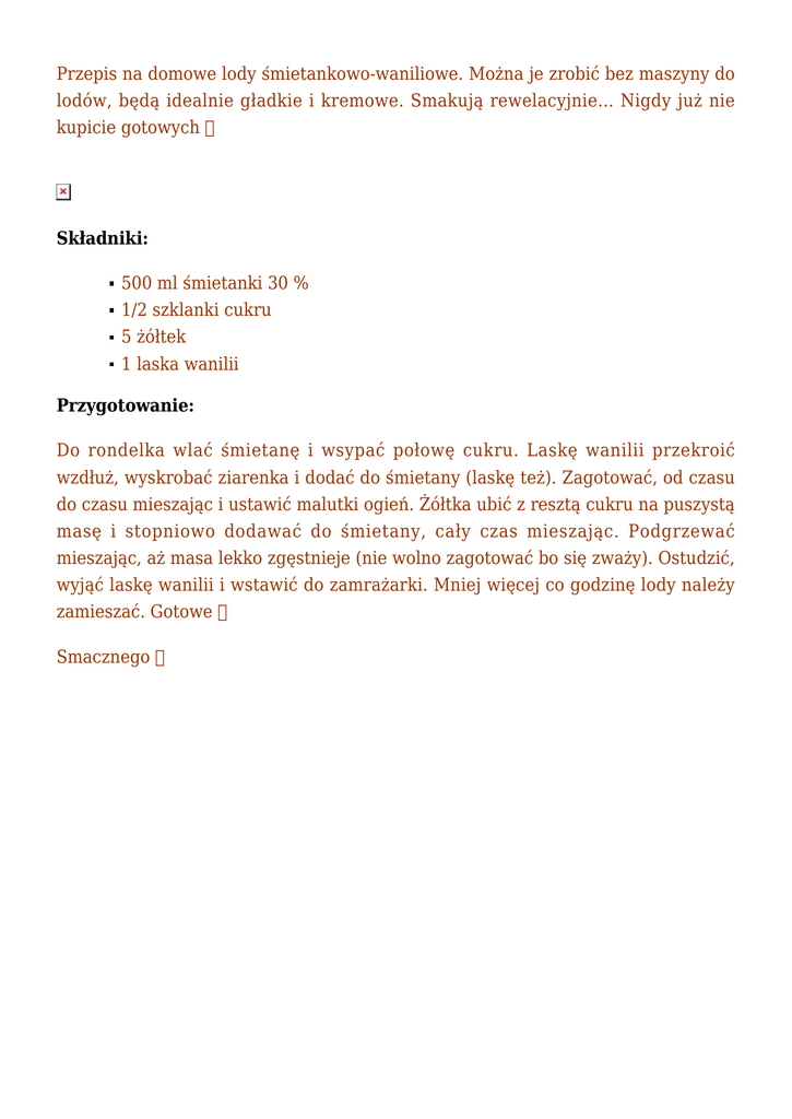 Przepis na domowe lody śmietankowo-waniliowe. Można je zrobić bez maszyny do lodów, będą idealnie gładkie i kremowe. Smakują rewelacyjnie… Nigdy już nie kupicie gotowych Składniki: 500 ml śmietanki 30 % 1/2 szklanki cukru 5 żółtek 1 laska wanilii Przygotowanie: Do rondelka wlać śmietanę i wsypać połowę cukru. Laskę wanilii przekroić wzdłuż, wyskrobać ziarenka i dodać do śmietany (laskę też). Zagotować, od czasu do czasu mieszając i ustawić malutki ogień. Żółtka ubić z resztą cukru na puszystą masę i stopniowo dodawać do śmietany, cały czas mieszając. Podgrzewać mieszając, aż masa lekko zgęstnieje (nie wolno zagotować bo się zważy). Ostudzić, wyjąć laskę wanilii i wstawić do zamrażarki. Mniej więcej co godzinę lody należy zamieszać. Gotowe Smacznego