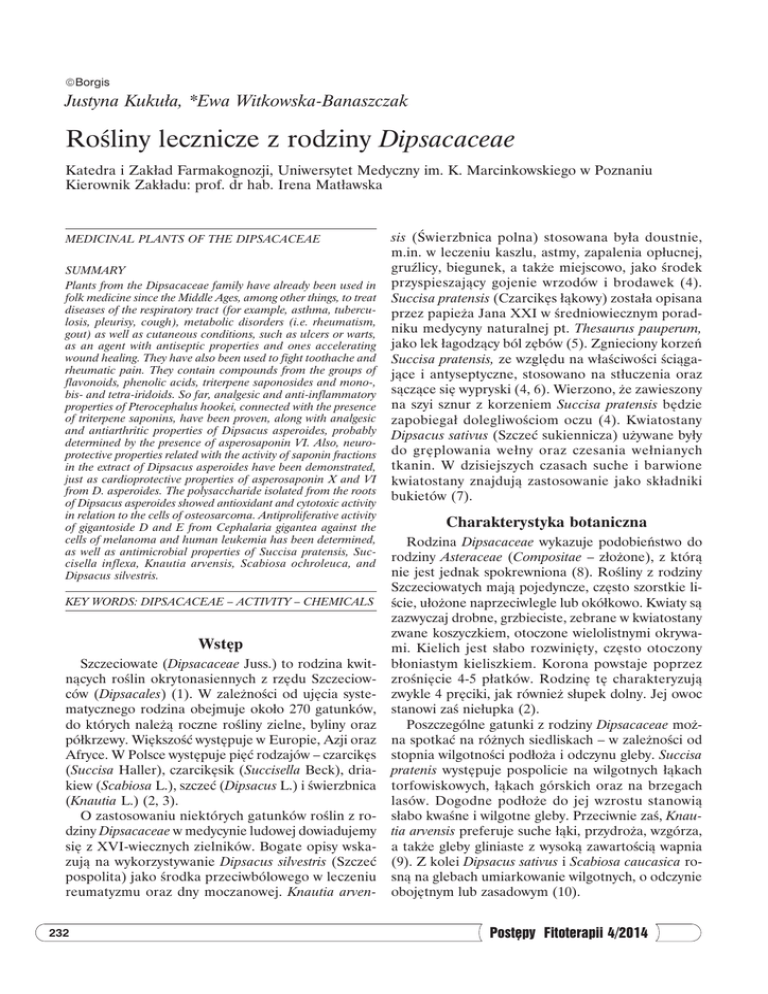 Borgis Justyna Kukuła, *Ewa Witkowska-Banaszczak Rośliny lecznicze z rodziny Dipsacaceae Katedra i Zakład Farmakognozji, Uniwersytet Medyczny im. K. Marcinkowskiego w Poznaniu Kierownik Zakładu: prof. dr hab. Irena Matławska MEDICINAL PLANTS OF THE DIPSACACEAE SUMMARY Plants from the Dipsacaceae family have already been used in folk medicine since the Middle Ages, among other things, to treat diseases of the respiratory tract (for example, asthma, tuberculosis, pleurisy, cough), metabolic disorders (i.e. rheumatism, gout) as well as cutaneous conditions, such as ulcers or warts, as an agent with antiseptic properties and ones accelerating wound healing. They have also been used to fight toothache and rheumatic pain. They contain compounds from the groups of flavonoids, phenolic acids, triterpene saponosides and mono-, bis- and tetra-iridoids. So far, analgesic and anti-inflammatory properties of Pterocephalus hookei, connected with the presence of triterpene saponins, have been proven, along with analgesic and antiarthritic properties of Dipsacus asperoides, probably determined by the presence of asperosaponin VI. Also, neuroprotective properties related with the activity of saponin fractions in the extract of Dipsacus asperoides have been demonstrated, just as cardioprotective properties of asperosaponin X and VI from D. asperoides. The polysaccharide isolated from the roots of Dipsacus asperoides showed antioxidant and cytotoxic activity in relation to the cells of osteosarcoma. Antiproliferative activity of gigantoside D and E from Cephalaria gigantea against the cells of melanoma and human leukemia has been determined, as well as antimicrobial properties of Succisa pratensis, Succisella inflexa, Knautia arvensis, Scabiosa ochroleuca, and Dipsacus silvestris. KEY WORDS: DIPSACACEAE – ACTIVITY – CHEMICALS Wstęp Szczeciowate (Dipsacaceae Juss.) to rodzina kwitnących roślin okrytonasiennych z rzędu Szczeciowców (Dipsacales) (1). W zależności od ujęcia systematycznego rodzina obejmuje około 270 gatunków, do których należą roczne rośliny zielne, byliny oraz półkrzewy. Większość występuje w Europie, Azji oraz Afryce. W Polsce występuje pięć rodzajów – czarcikęs (Succisa Haller), czarcikęsik (Succisella Beck), driakiew (Scabiosa L.), szczeć (Dipsacus L.) i świerzbnica (Knautia L.) (2, 3). O zastosowaniu niektórych gatunków roślin z rodziny Dipsacaceae w medycynie ludowej dowiadujemy się z XVI-wiecznych zielników. Bogate opisy wskazują na wykorzystywanie Dipsacus silvestris (Szczeć pospolita) jako środka przeciwbólowego w leczeniu reumatyzmu oraz dny moczanowej. Knautia arven232 sis (Świerzbnica polna) stosowana była doustnie, m.in. w leczeniu kaszlu, astmy, zapalenia opłucnej, gruźlicy, biegunek, a także miejscowo, jako środek przyspieszający gojenie wrzodów i brodawek (4). Succisa pratensis (Czarcikęs łąkowy) została opisana przez papieża Jana XXI w średniowiecznym poradniku medycyny naturalnej pt. Thesaurus pauperum, jako lek łagodzący ból zębów (5). Zgnieciony korzeń Succisa pratensis, ze względu na właściwości ściągające i antyseptyczne, stosowano na stłuczenia oraz sączące się wypryski (4, 6). Wierzono, że zawieszony na szyi sznur z korzeniem Succisa pratensis będzie zapobiegał dolegliwościom oczu (4). Kwiatostany Dipsacus sativus (Szczeć sukiennicza) używane były do gręplowania wełny oraz czesania wełnianych tkanin. W dzisiejszych czasach suche i barwione kwiatostany znajdują zastosowanie jako składniki bukietów (7). Charakterystyka botaniczna Rodzina Dipsacaceae wykazuje podobieństwo do rodziny Asteraceae (Compositae – złożone), z którą nie jest jednak spokrewniona (8). Rośliny z rodziny Szczeciowatych mają pojedyncze, często szorstkie liście, ułożone naprzeciwlegle lub okółkowo. Kwiaty są zazwyczaj drobne, grzbieciste, zebrane w kwiatostany zwane koszyczkiem, otoczone wielolistnymi okrywami. Kielich jest słabo rozwinięty, często otoczony błoniastym kieliszkiem. Korona powstaje poprzez zrośnięcie 4-5 płatków. Rodzinę tę charakteryzują zwykle 4 pręciki, jak również słupek dolny. Jej owoc stanowi zaś niełupka (2). Poszczególne gatunki z rodziny Dipsacaceae można spotkać na różnych siedliskach – w zależności od stopnia wilgotności podłoża i odczynu gleby. Succisa pratenis występuje pospolicie na wilgotnych łąkach torfowiskowych, łąkach górskich oraz na brzegach lasów. Dogodne podłoże do jej wzrostu stanowią słabo kwaśne i wilgotne gleby. Przeciwnie zaś, Knautia arvensis preferuje suche łąki, przydroża, wzgórza, a także gleby gliniaste z wysoką zawartością wapnia (9). Z kolei Dipsacus sativus i Scabiosa caucasica rosną na glebach umiarkowanie wilgotnych, o odczynie obojętnym lub zasadowym (10). Postępy Fitoterapii 4/2014 Rośliny lecznicze z rodziny Dipsacaceae Skład chemiczny Skład chemiczny jest stosunkowo słabo poznany. Dotychczas w roślinach z rodziny Dipsacaceae zidentyfikowano związki z grupy flawonoidów, kwasy fenolowe, saponozydy i irydoidy. W pięciu krajowych gatunkach: Dipsacus silvestris L., Knautia arvensis Coult., Scabiosa ochroleuca L., Succisa pratensis Moench. oraz Succisella inflexa Beck. zidentyfikowano związki polifenolowe z przewagą kompleksu flawonoidów, w tym luteoliny i jej 7-glukozydu, apigeniny, kwercetyny, kemferolu. Fenolokwasy, takie jak kwas chlorogenowy, protokatechowy, p-kumarowy i p-hydroksybenzoesowy, wyizolowano z surowców w dominującej ilości (11, 12). Saponozydy triterpenowe, charakterystyczne dla rodzaju Dipsacus, występują w formie wolnego kwasu oleanowego i ursolowego lub aglikonów hederageniny oraz kwasu oleanowego (13, 14). Monoirydoidy, zidentyfikowane do tej pory w Dipsacus asper Wall., to loganina, kwas loganinowy oraz swerozyd (13, 15). Obecność swerozydu potwierdzono również w Dipsacus lacinatus L. i Dipsacus silvestris L. (13). Zidentyfikowano bisirydoidy: kanteioz