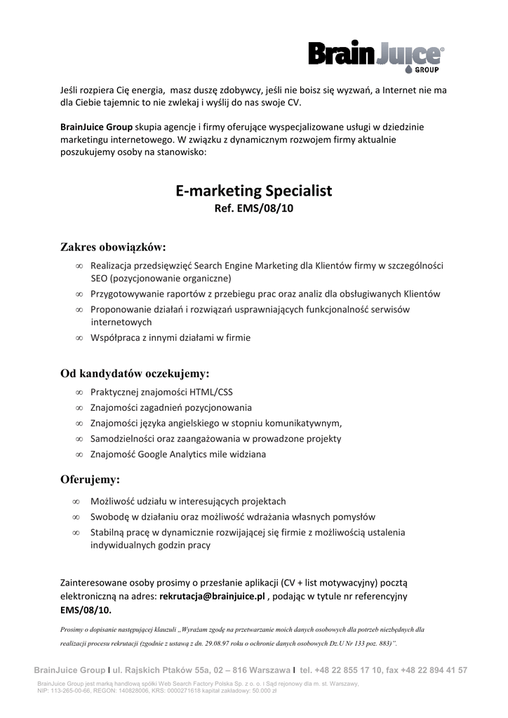 Jeśli rozpiera Cię energia, masz duszę zdobywcy, jeśli nie boisz się wyzwań, a Internet nie ma dla Ciebie tajemnic to nie zwlekaj i wyślij do nas swoje CV. BrainJuice Group skupia agencje i firmy oferujące wyspecjalizowane usługi w dziedzinie marketingu internetowego. W związku z dynamicznym rozwojem firmy aktualnie poszukujemy osoby na stanowisko: E-marketing Specialist Ref. EMS/08/10 Zakres obowiązków: • Realizacja przedsięwzięć Search Engine Marketing dla Klientów firmy w szczególności SEO (pozycjonowanie organiczne) • Przygotowywanie raportów z przebiegu prac oraz analiz dla obsługiwanych Klientów • Proponowanie działań i rozwiązań usprawniających funkcjonalność serwisów internetowych • Współpraca z innymi działami w firmie Od kandydatów oczekujemy: • Praktycznej znajomości HTML/CSS • Znajomości zagadnień pozycjonowania • Znajomości języka angielskiego w stopniu komunikatywnym, • Samodzielności oraz zaangażowania w prowadzone projekty • Znajomość Google Analytics mile widziana Oferujemy: • Możliwość udziału w interesujących projektach • Swobodę w działaniu oraz możliwość wdrażania własnych pomysłów • Stabilną pracę w dynamicznie rozwijającej się firmie z możliwością ustalenia indywidualnych godzin pracy Zainteresowane osoby prosimy o przesłanie aplikacji (CV + list motywacyjny) pocztą elektroniczną na adres: [email protected] , podając w tytule nr referencyjny EMS/08/10. Prosimy o dopisanie następującej klauzuli „Wyrażam zgodę na przetwarzanie moich danych osobowych dla potrzeb niezbędnych dla realizacji procesu rekrutacji (zgodnie z ustawą z dn. 29.08.97 roku o ochronie danych osobowych Dz.U Nr 133 poz. 883)”. BrainJuice Group Ι ul. Rajskich Ptaków 55a, 02 – 816 Warszawa Ι tel. +48 22 855 17 10, fax +48 22 894 41 57 BrainJuice Group jest marką handlową spółki Web Search Factory Polska Sp. z o. o. Ι Sąd rejonowy dla m. st. Warszawy, NIP: 113-265-00-66, REGON: 140828006, KRS: 0000271618 kapitał zakładowy: 50.000 zł