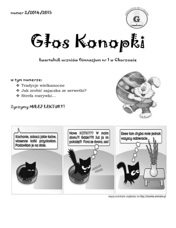numer 2/2014/2015 Głos Konopki kwartalnik uczniów Gimnazjum nr 1 w Chorzowie w tym numerze: Tradycje wielkanocne Jak zrobić zajączka ze serwetki? Strefa rozrywki... Życzymy MIŁEJ LEKTURY! Głos Konopki na Wielkanoc Świąteczny stół Świąteczny stół gospodynie przykrywały białym obrusem, na środku stawiały koszyk wypełniony kolorowymi kraszankami, czyli pisankami, kokoszką z kurczakami lub figurą baranka. Gospodynie nie zapominały też o wielkanocnym bukiecie. Od pokoleń na jego kompozycję składają się ulistnione gałązki brzozy oraz kwitnącej wierzby i leszczyny. Aby ozdobić bukiet, kobiety kładły kwitnące gałązki forsycji. Tak ozdobiony stół nawet przy najskromniejszym posiłku poprawił nastrój. Nie musiało być dostatnio, ale pięknie. Święcone, zwane też święconką, ma swoje prapoczątki w VIII wieku. Do Polski zwyczaj ten dotarł w XIV stuleciu. Najpierw do święcenia noszono tylko baranka z chleba, później dokładano kolejno: ser, masło, ryby, olej, mięso, ciasto, wino, jajka i inne pokarmy. Rodzaj święconych pokarmów był różny – w zależności od tradycji ludowych i chrześcijańskiej symboliki produktów, zmieniającej się na przestrzeni wieków. Teraz w zasadzie nie ma znaczenia, jakie pokarmy włożymy do koszyka. Ważne jest, żeby było w nim siedem podstawowych chleb, jajko, ser, wędlina, chrzan, ciasto i sól. Jajko - symbolizuje odrodzone, nowe życie (do koszyczka wkładamy je w postaci pisanek, a do tego dokładamy co najmniej jedno świeżo ugotowane na twardo, którym będziemy się łamać przy składaniu życzeń w czasie śniadania wielkanocnego. Według tradycji poświęcone w Wielką Sobotę jajka mają gwarantować obfitość dóbr, zapewniać dobre zdrowie i szczęście w miłości. Chleb - niezależnie od kultury, był i jest pokarmem niezbędnym do życia. Gwarantuje dobrobyt i pomyślność. Jeden z najważniejszych symboli w tradycji chrześcijańskiej - przedstawia bowiem Ciało Chrystusa. Wędlina - zapewnia zdrowie i płodność, a także dostatek, bo przecież w dawnych czasach nie każdy mógł sobie pozwolić na ten szczególny pokarm. Kiedyś był to choćby plaster szyneczki, a od XIX wieku słynna polska kiełbasa. Ser - jest, jako produkt mleczny pochodzący od krów, owiec i kóz, symbolem zawartej przyjaźni między człowiekiem a siłami przyrody, a przede wszystkim stanowi gwarancję rozwoju stada zwierząt domowych. Chrzan - zawsze był ludowym znamieniem wszelkiej siły i fizycznej krzepy. Współdziałając z innymi potrawami zapewniał ich skuteczność. Sól - to minerał życiodajny, dawniej posiadający moc odstraszania wszelkiego zła. Bez soli nie ma życia. To także oczyszczenie, samo sedno istnienia i prawdy. Stąd twierdzenie o "soli ziemi", jak to w Kazaniu na Górze powiedział Chrystus o swoich uczniach. Ciasto - do koszyka ze święconką "dostało się" jako ostatnie, jako symbol umiejętności i doskonałości. Zwykle reprezentowane bywa przez wielkanocne babki. Trzeba pamiętać, że winien to być wypiek własny, domowy, a nie kupiony w ciastkarni. Wystarczy zwykła domowa drożdżówka. Zwyczaj święconki w Polsce najpóźniej dotarł do mieszkańców Pomorza, a przynajmniej jego kaszubsko-kociewskiej części. Przywieźli go w 1920 roku przesiedleńcy ze środkowej Polski. Przed wielkanocnym śniadaniem stół kropił tu, przy pomocy witek z poświęconej palmy, najstarszy mężczyzna w rodzinie. Potem, kiedy zwyczaj święconki był już celebrowany na tych terenach, senior rodu kropił tylko te pokarmy, które pojawiły się na stole, a nie zostały poświęcone w kościele. Koszyki na święconkę wykonane były z prasowanej słomy, specjalnie dobieranej odcieniami koloru zbóż. Na zewnątrz koszyki ozdabiano gałązkami wiecznie zielonego bukszpanu, borówki bruszwicy albo barwinka pospolitego. Tak powinien być przystrojony koszyk ze święconką, któremu na stole przysługuje szczególne miejsce. Warto pamiętać, że dobór potraw w koszyku nigdy nie był przypadkowy. Od wieków każdy Boży dar symbolizował co innego, uznanego przez ludową, jak i chrześcijańską tradycję. Zestaw tych darów się zmieniał, ograniczano ich ilość, aż pozostało tylko sześć, by ostatecznie powiększyć do siedmiu. Ten zestaw, przyjęty w okresie wczesnego romantyzmu, obowiązuje do dziś. Potraw w koszyku może być więcej, ale tych siedem powinno się w nim znaleźć przede wszystkim. Symbolizują bowiem treść chrześcijaństwa. Symbole świąteczne Kolorowe jajko Malujemy je farbkami, flamastrami, barwimy na różne kolory, naklejamy wycinanki zdobienie pisanek ma w Polsce bardzo długą tradycję i jest nieodłączną częścią przygotowań do świąt wielkanocnych. Jajko pomalowane na czerwono miało odwracać od człowieka złe siły. Palma Palma to pamiątka uroczystego wjazdu Chrystusa do Jerozolimy. Palmy miały chronić przed chorobami i zapewnić dobre plony. Obecnie palmy robi się z suszonych kwiatów, mchów, traw. Wykorzystuje się gałązki wierzby, bukszpanu, borówek, które są znakiem pokoju, przynoszonego przez Chrystusa. W Polsce borowinkę, bukszpan wkłada się do koszyczka zamiast gałązki oliwnej. Zajączek wielkanocny Zwyczaj, pochodzenia niemieckiego, obdarzania dzieci w święta Wielkanocy słodyczami i innymi upominkami. Początkowo występował na Śląsku i Pomorzu. Koszyczki z niespodziankami od zajączka i z kolorowymi jajami wielkanocnymi, łakociami, a później także prezentami rzeczowymi, chowano w ogrodzie lub w różnych skrytkach domowych, a dzieci szukały ich od wczesnego ranka w Niedzielę Wielkanocną. Z czasem zwyczaj dawania dzieciom różnych prezentów na Wielkanoc przyjął się w innych regionach Polski. Królik ze serwetki Chcesz zachwycić rodzinę? Przygotuj na świąteczne śniadanie zajączki ze serwetek. Zobacz, jakie to proste! Strefa rozrywki 1. 2. 3. 4. 5. 6. 7. 8. 9. 1. 2. 3. 4. 5. 6. 7. 8. 9. ... Po