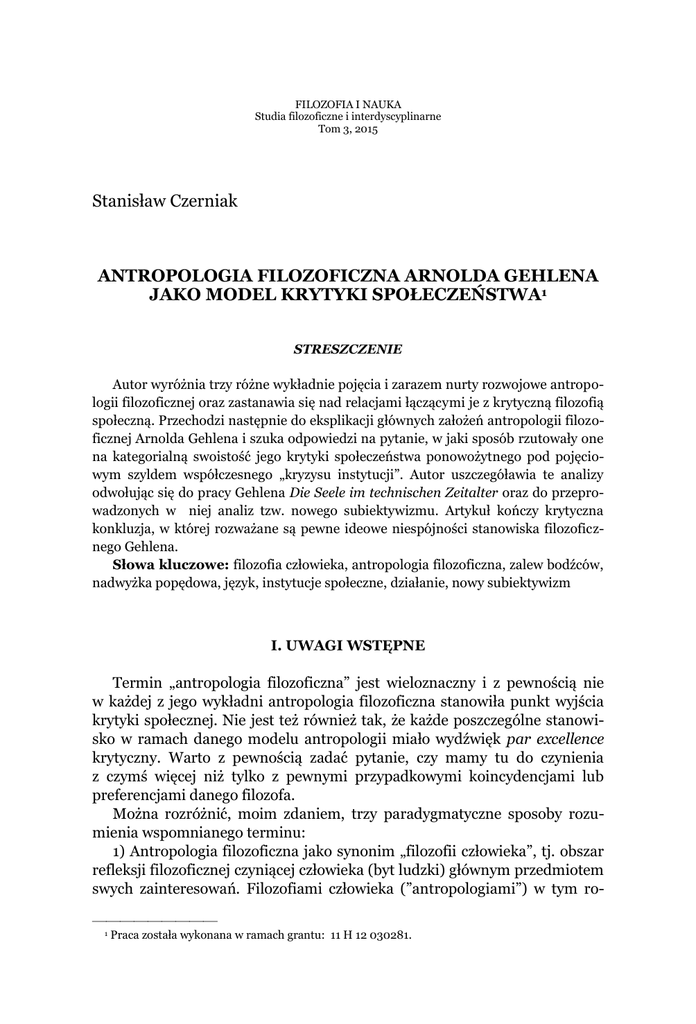FILOZOFIA I NAUKA Studia filozoficzne i interdyscyplinarne Tom 3, 2015 Stanisław Czerniak ANTROPOLOGIA FILOZOFICZNA ARNOLDA GEHLENA JAKO MODEL KRYTYKI SPOŁECZEŃSTWA1 STRESZCZENIE Autor wyróżnia trzy różne wykładnie pojęcia i zarazem nurty rozwojowe antropologii filozoficznej oraz zastanawia się nad relacjami łączącymi je z krytyczną filozofią społeczną. Przechodzi następnie do eksplikacji głównych założeń antropologii filozoficznej Arnolda Gehlena i szuka odpowiedzi na pytanie, w jaki sposób rzutowały one na kategorialną swoistość jego krytyki społeczeństwa ponowożytnego pod pojęciowym szyldem współczesnego „kryzysu instytucji”. Autor uszczegóławia te analizy odwołując się do pracy Gehlena Die Seele im technischen Zeitalter oraz do przeprowadzonych w niej analiz tzw. nowego subiektywizmu. Artykuł kończy krytyczna konkluzja, w której rozważane są pewne ideowe niespójności stanowiska filozoficznego Gehlena. Słowa kluczowe: filozofia człowieka, antropologia filozoficzna, zalew bodźców, nadwyżka popędowa, język, instytucje społeczne, działanie, nowy subiektywizm I. UWAGI WSTĘPNE Termin „antropologia filozoficzna” jest wieloznaczny i z pewnością nie w każdej z jego wykładni antropologia filozoficzna stanowiła punkt wyjścia krytyki społecznej. Nie jest też również tak, że każde poszczególne stanowisko w ramach danego modelu antropologii miało wydźwięk par excellence krytyczny. Warto z pewnością zadać pytanie, czy mamy tu do czynienia z czymś więcej niż tylko z pewnymi przypadkowymi koincydencjami lub preferencjami danego filozofa. Można rozróżnić, moim zdaniem, trzy paradygmatyczne sposoby rozumienia wspomnianego terminu: 1) Antropologia filozoficzna jako synonim „filozofii człowieka”, tj. obszar refleksji filozoficznej czyniącej człowieka (byt ludzki) głównym przedmiotem swych zainteresowań. Filozofiami człowieka (”antropologiami”) w tym ro————————— 1 Praca została wykonana w ramach grantu: 11 H 12 030281. 58 Stanisław Czerniak zumieniu były całe doktryny filozoficzne (przykładem egzystencjalizm Sartre’owski) bądź też spójne fragmenty doktryn (określoną filozofię człowieka zawierał np. tomizm). Nie zawsze mamy tu do czynienia z wyraźnymi liniami demarkacyjnymi. Jak wiadomo, Martin Heidegger w Liście o Humanizmie poddał antropologię filozoficzną krytyce, ale przed tzw. Kehre, a więc na kartach Sein und Zeit badał w ramach rozważań, które nazwał analityką egzystencjalną, ludzkie „egzystencjały”, takie jak „trwoga” czy „troska”, budując na ich gruncie bez wątpienia oryginalną filozoficzną architektonikę bytu ludzkiego (Dasein). 2) Antropologia filozoficzna jako pojęcie zbiorcze wobec refleksji filozoficznej koncentrującej się wokół poszczególnych „wymiarów” czy „aspektów” ludzkiej egzystencji, takich na przykład jak praca, miłość, śmierć, cielesność, cierpienie, obcość(tzw. antropologie regionalne). Antropologią filozoficzną będzie zatem filozofia cierpienia czy miłości, która nie musi jednocześnie pretendować (jak w poprzednim wypadku) do tego, by być całościową filozofią bytu ludzkiego czy też wyróżnionym fragmentem większej doktrynalnej całości. 3) Klasyczna antropologia filozoficzna XX wieku. Wspólnym założeniem jej twórców (Max Scheler, Helmuth Plessner, Arnold Gehlen) była swoista „biologizacja” refleksji o człowieku polegająca na próbach określenia – w języku filozofii, a jednocześnie na gruncie biologicznej wiedzy o charakterystykach poszczególnych szczebli życia (rośliny, zwierzęta, homo sapiens) – gatunkowych „monopoli” człowieka w sferze istot żywych. Innymi słowy, tożsamość gatunkowa człowieka definiowana jest tu w konfrontacji z tym, co filozof odwołujący się do dorobku nauk biologicznych uznaje za ontyczny/biologiczny status rośliny czy zwierzęcia. Zakłada się, że człowiek wyrasta wielorako ponad tę sferę (mamy tu do czynienia z zasadniczą różnicą jakościową), ale jednocześnie jest w niej głęboko zakorzeniony. Koncepcje te różnią się zatem wprawdzie doborem kategorii określających biologiczne swoistości roślin, zwierząt i ludzi (wspomniane monopole), ale ich wspólnym założeniem jest waga owych międzygatunkowych konfrontacji jako kluczowego definicyjnego kryterium antropologicznego. Już pobieżny wgląd w literaturę przedmiotu pokazuje, że wymienione wyżej modele antropologii filozoficznej w różnym stopniu przynależą do krytycznego paradygmatu filozofii społecznej. Zapewne najmniej predystynowane są do tej roli antropologie regionalne, które mają częstokroć charakter deskryptywny (przykładowy temat: „wzory miłości w kulturze Zachodu”) i ze względu na swe ograniczone ambicje teoretyczne nie dostarczają instrumentarium pojęciowego przydatnego do podjęcia krytyki społecznokulturowej w wymiarze uniwersalnej filozoficznej diagnozy. Co do dwóch pozostałych paradygmatów, to bywały one wprawdzie doktrynalnym źródłem/punktem wyjścia krytycznej filozofii społecznej, ale trudno tu Antropologia filozoficzna Arnolda Gehlena jako model krytyki społeczeństwa 59 mówić o jakichkolwiek oczywistych jednokierunkowych ideowych zależnościach. By odwołać się do przykładów: — W paradygmacie „filozofii człowieka” bardzo często antropologiczne segmenty większych całości doktrynalnych nie wychodzą poza deskryptywne analizy subdyscyplinarne. Ale także takie „całościowe” filozofie człowieka, jak egzystencjalizm Jean-Paula Sartre`a wyłożony w Bycie i nicości, trudno uznać za zalążek jakkolwiek pojmowanej krytycznej filozofii społecznej. Przypadek Martina Heideggera jest odmienny tylko z pozoru. Wydawać by się bowiem mogło, że jego kategoria das Man (Się) to nic innego jak antropologiczne kryterium krytyki ubezwłasnowolnionej indywidualnej świadomości poto