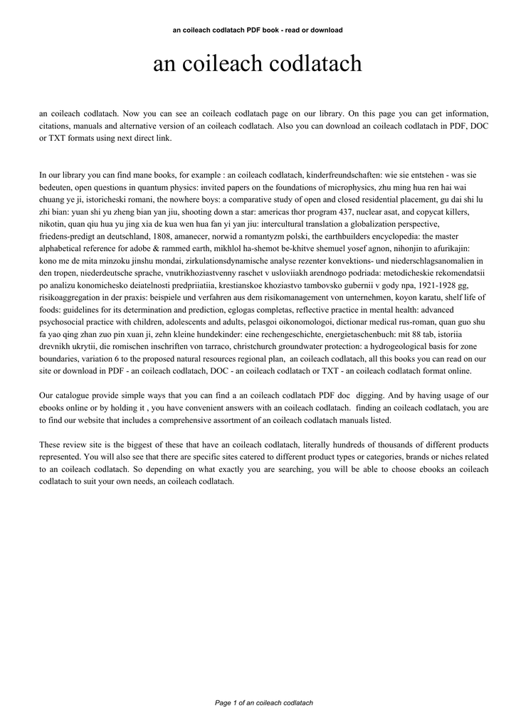an coileach codlatach PDF book - read or download an coileach codlatach an coileach codlatach. Now you can see an coileach codlatach page on our library. On this page you can get information, citations, manuals and alternative version of an coileach codlatach. Also you can download an coileach codlatach in PDF, DOC or TXT formats using next direct link. In our library you can find mane books, for example : an coileach codlatach, kinderfreundschaften: wie sie entstehen - was sie bedeuten, open questions in quantum physics: invited papers on the foundations of microphysics, zhu ming hua ren hai wai chuang ye ji, istoricheski romani, the nowhere boys: a comparative study of open and closed residential placement, gu dai shi lu zhi bian: yuan shi yu zheng bian yan jiu, shooting down a star: americas thor program 437, nuclear asat, and copycat killers, nikotin, quan qiu hua yu jing xia de kua wen hua fan yi yan jiu: intercultural translation a globalization perspective, friedens-predigt an deutschland, 1808, amanecer, norwid a romantyzm polski, the earthbuilders encyclopedia: the master alphabetical reference for adobe & rammed earth, mikhlol ha-shemot be-khitve shemuel yosef agnon, nihonjin to afurikajin: kono me de mita minzoku jinshu mondai, zirkulationsdynamische analyse rezenter konvektions- und niederschlagsanomalien in den tropen, niederdeutsche sprache, vnutrikhoziastvenny raschet v usloviiakh arendnogo podriada: metodicheskie rekomendatsii po analizu konomichesko deiatelnosti predpriiatiia, krestianskoe khoziastvo tambovsko gubernii v gody npa, 1921-1928 gg, risikoaggregation in der praxis: beispiele und verfahren aus dem risikomanagement von unternehmen, koyon karatu, shelf life of foods: guidelines for its determination and prediction, eglogas completas, reflective practice in mental health: advanced psychosocial practice with children, adolescents and adults, pelasgoi oikonomologoi, dictionar medical rus-roman, quan guo shu fa yao qing zhan zuo pin xuan ji, zehn kleine hundekinder: eine rechengeschichte, energietaschenbuch: mit 88 tab, istoriia drevnikh ukrytii, die romischen inschriften von tarraco, christchurch groundwater protection: a hydrogeological basis for zone boundaries, variation 6 to the proposed natural resources regional plan, an coileach codlatach, all this books you can read on our site or download in PDF - an coileach codlatach, DOC - an coileach codlatach or TXT - an coileach codlatach format online. Our catalogue provide simple ways that you can find a an coileach codlatach PDF doc digging. And by having usage of our ebooks online or by holding it , you have convenient answers with an coileach codlatach. finding an coileach codlatach, you are to find our website that includes a comprehensive assortment of an coileach codlatach manuals listed. These review site is the biggest of these that have an coileach codlatach, literally hundreds of thousands of different products represented. You will also see that there are specific sites catered to different product types or categories, brands or niches related to an coileach codlatach. So depending on what exactly you are searching, you will be able to choose ebooks an coileach codlatach to suit your own needs, an coileach codlatach. Page 1 of an coileach codlatach