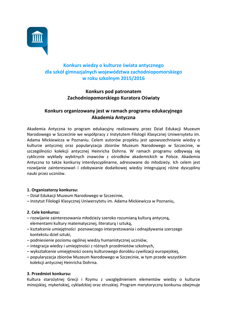 Konkurs wiedzy o kulturze świata antycznego dla szkół gimnazjalnych województwa zachodniopomorskiego w roku szkolnym 2015/2016 Konkurs pod patronatem Zachodniopomorskiego Kuratora Oświaty Konkurs organizowany jest w ramach programu edukacyjnego Akademia Antyczna Akademia Antyczna to program edukacyjny realizowany przez Dział Edukacji Muzeum Narodowego w Szczecinie we współpracy z Instytutem Filologii Klasycznej Uniwersytetu im. Adama Mickiewicza w Poznaniu. Celem autorów projektu jest upowszechnianie wiedzy o kulturze antycznej oraz popularyzacja zbiorów Muzeum Narodowego w Szczecinie, w szczególności kolekcji antycznej Heinricha Dohrna. W ramach programu odbywają się cyklicznie wykłady wybitnych znawców z ośrodków akademickich w Polsce. Akademia Antyczna to także konkursy interdyscyplinarne, adresowane do młodzieży. Ich celem jest rozwijanie zainteresowań i zdobywanie dodatkowej wiedzy integrującej różne dyscypliny nauki przez uczniów. 1. Organizatorzy konkursu: – Dział Edukacji Muzeum Narodowego w Szczecinie, – Instytut Filologii Klasycznej Uniwersytetu im. Adama Mickiewicza w Poznaniu, 2. Cele konkursu: – rozwijanie zainteresowania młodzieży szeroko rozumianą kulturą antyczną, elementami kultury matematycznej, literaturą i sztuką, – kształcenie umiejętności poznawczego interpretowania i odnajdywania szerszego kontekstu dzieł sztuki, – podniesienie poziomu ogólnej wiedzy humanistycznej uczniów, – integracja wiedzy i umiejętności z różnych przedmiotów szkolnych, – wykształcenie umiejętności oceny kulturowego dorobku cywilizacji europejskiej, – popularyzacja zbiorów Muzeum Narodowego w Szczecinie, w tym przede wszystkim kolekcji antycznej Heinricha Dohrna. 3. Przedmiot konkursu: Kultura starożytnej Grecji i Rzymu z uwzględnieniem elementów wiedzy o kulturze minojskiej, mykeńskiej, cykladzkiej oraz etruskiej. Program merytoryczny konkursu obejmuje wiedzę i umiejętności, których podstawą są przedmioty humanistyczne, elementy kultury matematycznej oraz materiał zawarty w podanej literaturze 4. Uczestnicy konkursu: W konkursie mogą brać udział uczniowie szkół gimnazjalnych z województwa zachodniopomorskiego. Udział w konkursie jest dobrowolny i bezpłatny 5. Organizacja: Konkurs jest dwuetapowy: I etap konkursu polega na przeprowadzeniu eliminacji szkolnych – rozwiązaniu testu który dostarczają organizatorzy konkursu i wykonaniu przez Uczestników Konkursu prac plastycznych. Tematyka prac plastycznych związana jest z kulturą starożytnej Grecji i Rzymu z uwzględnieniem kultury minojskiej, mykeńskiej, cykladzkiej, etruskiej oraz elementami kultury matematycznej. Każdy uczestnik zobowiązany jest do wykonania 2 prac plastycznych spośród czterech wskazanych tematów. W haśle tematy prac plastycznych są one szczegółowo omówione. Do każdej pracy należy przygotować opis. Format prac plastycznych: 30cm x 30cm; papier typu brystol lub papier z bloku technicznego Technika prac: uczestnik może połączyć w jednej pracy kilka technik plastycznych (np. wybrane techniki opisane w pkt.: a+b, a+c, b+c): a) Techniki rysunkowe: rysunek kredkami ołówkowymi, cienkopisami, tuszem (czarnym, kolorowym) za pomocą pędzla lub patyka b) Techniki malarskie: malowanie farbami plakatowymi, akwarelowymi, temperowymi c) Techniki dekoracyjne: mozaika - naklejanka z kawałków kolorowego papieru, wydzieranka z gazety, wycinanka z papieru, aplikacje z tkanin, włóczek, sznurków. Uwaga! W technikach dekoracyjnych warto zastosować kolorowy papier z bloku technicznego, szary papier pakowy, tektury lub papiery o różnej fakturze i grubości. Można wykorzystać również papier samodzielnie zabarwiony naturalnymi pigmentami, np. sokiem z owoców, herbatą, kawą, wywarem z cebuli. • Przyjmujemy prace bez oprawy w passe-partout • Jeden uczestnik może zgłosić do konkursu tylko jeden zestaw złożony z 2 prac Tematy prac plastycznych: W realizacji podanych poniżej tematów należy uwzględnić wybraną prawidłowość matematyczną, np. symetrię, złoty podział odcinka, translację: I. II. III. IV. Projekt pojedynczego motywu dekoracyjnego – ornamentu; Projekt wzoru dekoracyjnego np. na posadzkę, tkaninę, ścianę, elewację budynku; Projekt formy użytkowej wraz ze wzorem dekoracyjnym na jej powierzchni; Projekt budowli - całej bryły lub wybranego fragmentu, np. frontu biblioteki, ganka domu mieszkalnego. Do każdej pracy należy dołączyć opis zawierający: 2 Wybrany temat (I-IV) i wyjaśnienie zastosowanych pojęć lub twierdzeń matematycznych. Objętość opisu nie powinna przekraczać 1 strony A4; czcionka 12 pkt., interlinia: 1,5 wiersza Zgłoszenia należy dostarczyć do Działu Edukacji Muzeum Narodowego w Szczecinie do 29 stycznia 2016 roku. Karta zgłoszenia i regulamin będą dostępne na stronie internetowej: www.muzeum.szczecin.pl w zakładce Edukacja. Uwaga! Na tej stronie będą zamieszczane wszystkie informacje dotyczące Konkursu. Eliminacje szkolne organizuje i przeprowadza Szkolna Komisja Konkursu w składzie co najmniej trzech nauczycieli. Szkolną Komisję powołuje dyrektor szkoły, przewodniczącego wybierają spośród siebie członkowie. Eliminacje szkolne (egzamin pisemny – test, który dostarczają organizatorzy Konkursu) odbędą się 24 lutego 2016 roku. W dniu 24 lutego 2016 roku Uczniowie zobowiązani są dostarczyć Komisji Szkolnej prace plastyczne z opisem. Komisja Szkolna przesyła testy i prace plastyczne do Działu Edukacji Muzeum Narodowego w Szczecinie do 2 marca 2016 roku. Lista uczestników zakwalifikowanych do etapu II będzie dostępna na stronach internetowych organizatorów 9 marca 2016 roku. II etap odbędzie się 9 i 10 kwietnia 2016 roku w Gmachu Głównym Muzeum Narodowego w Szczecinie, ul. Wały Chrobrego 3. Etap II składa się z dwóch części: – części pisemnej, która odbędzie się 9 kwietnia 2016 (czwartek) o godzinie 9.00. Część pisemna
