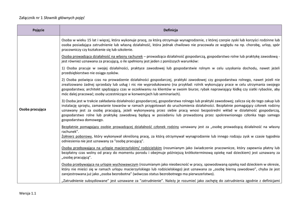Załącznik nr 1 Słownik głównych pojęć Pojęcie Definicja Osoba w wieku 15 lat i więcej, która wykonuje pracę, za którą otrzymuje wynagrodzenie, z której czerpie zyski lub korzyści rodzinne lub osoba posiadająca zatrudnienie lub własną działalność, która jednak chwilowo nie pracowała ze względu na np. chorobę, urlop, spór pracowniczy czy kształcenie się lub szkolenie. Osoba prowadząca działalność na własny rachunek – prowadząca działalność gospodarczą, gospodarstwo rolne lub praktykę zawodową jest również uznawana za pracującą, o ile spełniony jest jeden z poniższych warunków: 1) Osoba pracuje w swojej działalności, praktyce zawodowej lub gospodarstwie rolnym w celu uzyskania dochodu, nawet jeżeli przedsiębiorstwo nie osiąga zysków. 2) Osoba poświęca czas na prowadzenie działalności gospodarczej, praktyki zawodowej czy gospodarstwa rolnego, nawet jeżeli nie zrealizowano żadnej sprzedaży lub usług i nic nie wyprodukowano (na przykład: rolnik wykonujący prace w celu utrzymania swojego gospodarstwa; architekt spędzający czas w oczekiwaniu na klientów w swoim biurze; rybak naprawiający łódkę czy siatki rybackie, aby móc dalej pracować; osoby uczestniczące w konwencjach lub seminariach). Osoba pracująca 3) Osoba jest w trakcie zakładania działalności gospodarczej, gospodarstwa rolnego lub praktyki zawodowej; zalicza się do tego zakup lub instalację sprzętu, zamawianie towarów w ramach przygotowań do uruchomienia działalności. Bezpłatnie pomagający członek rodziny uznawany jest za osobę pracującą, jeżeli wykonywaną przez siebie pracą wnosi bezpośredni wkład w działalność gospodarczą, gospodarstwo rolne lub praktykę zawodową będącą w posiadaniu lub prowadzoną przez spokrewnionego członka tego samego gospodarstwa domowego. Bezpłatnie pomagający osobie prowadzącej działalność członek rodziny uznawany jest za „osobę prowadzącą działalność na własny rachunek”. Żołnierz poborowy, który wykonywał określoną pracę, za którą otrzymywał wynagrodzenie lub innego rodzaju zysk w czasie tygodnia odniesienia nie jest uznawany za "osobę pracującą". Osoba przebywająca na urlopie macierzyńskim/ rodzicielskim (rozumianym jako świadczenie pracownicze, który zapewnia płatny lub bezpłatny czas wolny od pracy do momentu porodu i obejmuje późniejszą krótkoterminową opiekę nad dzieckiem) jest uznawany za „osobę pracującą”. Osoba przebywająca na urlopie wychowawczym (rozumianym jako nieobecność w pracy, spowodowaną opieką nad dzieckiem w okresie, który nie mieści się w ramach urlopu macierzyńskiego lub rodzicielskiego) jest uznawana za „osobę bierną zawodowo”, chyba że jest zarejestrowana już jako „osoba bezrobotna” (wówczas status bezrobotnego ma pierwszeństwo). „Zatrudnienie subsydiowane” jest uznawane za "zatrudnienie”. Należy je rozumieć jako zachętę do zatrudnienia zgodnie z definicjami Wersja 1.1 Polityki Rynku Pracy: Zachęty do zatrudnienia obejmują środki, które ułatwiają rekrutację osób bezrobotnych i innych grup docelowych lub pomagają zapewnić ciągłość zatrudnienia osób narażonych na przymusowe zwolnienie z pracy. Zachęty do zatrudnienia odnoszą się do subsydiowania miejsc pracy na otwartym rynku prac, które mogą istnieć lub zostać stworzone bez dotacji publicznych i które, jak należy mieć nadzieję, utrzymają się po okresie subsydiowania. Miejsca pracy, które mogą być subsydiowane, dotyczą zwykle sektora prywatnego, ale do uzyskania wsparcia kwalifikują się również miejsca pracy z sektora publicznego i instytucji niekomercyjnych, przy czym rozróżnienie nie jest wymagane. Środki publiczne w postaci zachęt w zakresie zatrudnienia mają swój udział w kosztach zatrudnienia, przy czym większość tych kosztów nadal ponosi pracodawca. Nie wyklucza to jednak przypadków, kiedy wszystkie koszty pracy pokrywane są przez określony czas ze środków publicznych. Migrant, osoba obcego pochodzenia, mniejszości (w tym społeczności zmarginalizowane takie jak Romowie) Cudzoziemcy na stale mieszkający w danym państwie, obywatele obcego pochodzenia lub obywatele należący do mniejszości. Zgodnie z prawem krajowym mniejszości narodowe to mniejszość: białoruska, czeska, litewska, niemiecka, ormiańska, rosyjska, słowacka, ukraińska, żydowska. Mniejszości etniczne: karaimska, łemkowska, romska, tatarska. Osoby obcego pochodzenia to cudzoziemcy - każda osoba, która nie posiada polskiego obywatelstwa, bez względu na fakt posiadania lub nie obywatelstwa (obywatelstw) innych krajów lub osoba, której co najmniej jeden z rodziców urodził się poza terenem Polski. Osoba pochodząca z obszarów wiejskich Osoba przebywające na obszarach słabo zaludnionych zgodnie ze stopniem urbanizacji (DEGURBA kategoria 3). Obszary słabo zaludnione to obszary, na których więcej niż 50% populacji zamieszkuje tereny wiejskie. Przedsiębiorstwo Podmiot prowadzący działalność gospodarczą bez względu na jego formę prawną. Do podmiotu prowadzącego działalność gospodarczą zalicza się również przedsiębiorstwo spółdzielcze i przedsiębiorstwo ekonomii społecznej. Mikroprzedsiębiorstwo Przedsiębiorstwo zatrudniające mniej niż 10 pracowników, którego roczny obrót i/lub roczna suma bilansowa nie przekraczają 2 milionów EUR. W kategorii mikroprzedsiębiorstwa należy uwzględnić również osoby prowadzące działalność na własny rachunek. Małe przedsiębiorstwo Przedsiębiorstwo zatrudniające mniej niż 50 pracowników, którego roczny obrót i/lub roczna suma bilansowa nie przekraczają 10 milionów EUR Średnie przedsiębiorstwo Przedsiębiorstwa, które zatrudniają mniej niż 250 pracowników, których roczny obrót nie przekracza 50 milionów EUR i/lub roczna suma bilansowa nie przekracza 43 milionów EUR Duże przedsiębiorstwo Oznacza przedsiębiorstwo, które nie 