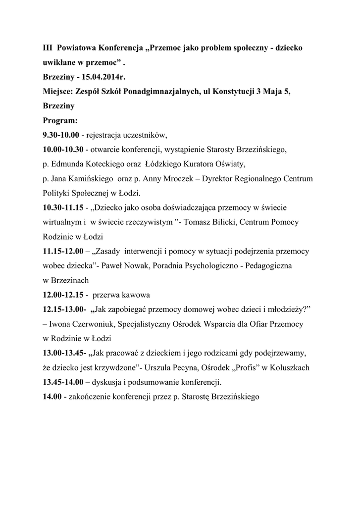 III Powiatowa Konferencja „Przemoc jako problem społeczny - dziecko uwikłane w przemoc” . Brzeziny - 15.04.2014r. Miejsce: Zespół Szkół Ponadgimnazjalnych, ul Konstytucji 3 Maja 5, Brzeziny Program: 9.30-10.00 - rejestracja uczestników, 10.00-10.30 - otwarcie konferencji, wystąpienie Starosty Brzezińskiego, p. Edmunda Koteckiego oraz Łódzkiego Kuratora Oświaty, p. Jana Kamińskiego oraz p. Anny Mroczek – Dyrektor Regionalnego Centrum Polityki Społecznej w Łodzi. 10.30-11.15 - „Dziecko jako osoba doświadczająca przemocy w świecie wirtualnym i w świecie rzeczywistym ”- Tomasz Bilicki, Centrum Pomocy Rodzinie w Łodzi 11.15-12.00 – „Zasady interwencji i pomocy w sytuacji podejrzenia przemocy wobec dziecka”- Paweł Nowak, Poradnia Psychologiczno - Pedagogiczna w Brzezinach 12.00-12.15 - przerwa kawowa 12.15-13.00- „Jak zapobiegać przemocy domowej wobec dzieci i młodzieży?” – Iwona Czerwoniuk, Specjalistyczny Ośrodek Wsparcia dla Ofiar Przemocy w Rodzinie w Łodzi 13.00-13.45- „Jak pracować z dzieckiem i jego rodzicami gdy podejrzewamy, że dziecko jest krzywdzone”- Urszula Pecyna, Ośrodek „Profis” w Koluszkach 13.45-14.00 – dyskusja i podsumowanie konferencji. 14.00 - zakończenie konferencji przez p. Starostę Brzezińskiego
