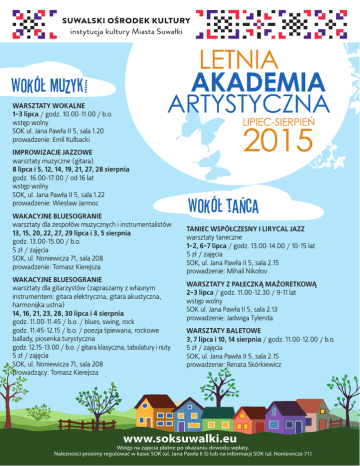 WARSZTATY WOKALNE 1-3 lipca / godz. 10.00-11.00 / b.o. wstęp wolny SOK ul. Jana Pawła II 5, sala 1.20 prowadzenie: Emil Kulbacki IMPROWIZACJE JAZZOWE warsztaty muzyczne (gitara) 8 lipca i 5, 12, 14, 19, 21, 27, 28 sierpnia godz. 16.00-17.00 / od 16 lat wstęp wolny SOK, ul. Jana Pawła II 5, sala 1.22 prowadzenie: Wiesław Jarmoc WAKACYJNE BLUESOGRANIE warsztaty dla zespołów muzycznych i instrumentalistów 13, 15, 20, 22, 27, 29 lipca i 3, 5 sierpnia godz. 13.00-15.00 / b.o. 5 zł / zajęcia SOK, ul. Noniewicza 71, sala 208 prowadzenie: Tomasz Kierejsza WAKACYJNE BLUESOGRANIE warsztaty dla gitarzystów (zapraszamy z własnym instrumentem: gitara elektryczna, gitara akustyczna, harmonijka ustna) 14, 16, 21, 23, 28, 30 lipca i 4 sierpnia godz. 11.00-11.45 / b.o. / blues, swing, rock godz. 11.45-12.15 / b.o. / poezja śpiewana, rockowe ballady, piosenka turystyczna godz. 12.15-13.00 / b.o. / gitara klasyczna, tabulatury i nuty 5 zł / zajęcia SOK, ul. Noniewicza 71, sala 208 prowadzący: Tomasz Kierejsza TANIEC WSPÓŁCZESNY I LIRYCAL JAZZ warsztaty taneczne 1-2, 6-7 lipca / godz. 13.00-14.00 / 10-15 lat 5 zł / zajęcia SOK, ul. Jana Pawła II 5, sala 2.15 prowadzenie: Mihail Nikolov WARSZTATY Z PAŁECZKĄ MAŻORETKOWĄ 2-3 lipca / godz. 11.00-12.30 / 9-11 lat wstęp wolny SOK ul. Jana Pawła II 5, sala 2.13 prowadzenie: Jadwiga Tylenda WARSZTATY BALETOWE 3, 7 lipca i 10, 14 sierpnia / godz. 11.00-12.00 / b.o. 5 zł / zajęcia SOK, ul. Jana Pawła II 5, sala 2.15 prowadzenie: Renata Skórkiewicz www.soksuwalki.eu Wstęp na zajęcia płatne po okazaniu dowodu wpłaty. Należności prosimy regulować w kasie SOK (ul. Jana Pawła II 5) lub na informacji SOK (ul. Noniewicza 71) TĘCZA WYOBRAŹNI warsztaty artystyczne 1-3, 6-8, 13-17, 20-24, 27-31 lipca 3-5, 10-14, 17-21, 24 sierpnia godz. 14.00-17.00 / 5-13 lat 5 zł / zajęcia SOK, ul. Jana Pawła II 5, sala 0.30 prowadzenie: Mieczysław Iwaszko TEATR LUSTRO warsztaty teatralne praca nad etiudą „Divertimento stomatologiczne”, „Hamlet chuligański” wg J. Przybory 24-28 sierpnia / godz. 10.00-12.00 / od 14 lat wstęp wolny SOK, ul. Noniewicza 71, sala grantowa prowadzenie: Grażyna Filipowicz-Karp GRAMATYKA WIZUALNA warsztaty artystyczne 1-3, 6-8, 13-17, 20-24, 27-31 lipca 3-5, 10-14, 17-21, 24 sierpnia godz. 17.00-19.00 / 13-30+ lat 5 zł / zajęcia SOK, ul. Jana Pawła II 5, sala 0.30 prowadzenie: Mieczysław Iwaszko DIVERTIMENTO STOMATOLOGICZNE, HAMLET CHULIGAŃSKI wg J. Przybory 29 sierpnia / godz. 18.00 wstęp wolny SOK, ul. Noniewicza 71, sala grantowa KOLOROWE LATO warsztaty artystyczne 10-13 sierpnia godz. 10.00-12.00 (7-10 lat), godz. 13.00-15.00 (10-13 lat) 10.08 – Kolory lata, warsztaty plastyczne oraz zabawy zespołowe 11.08 – Malowanie na szkle, projektowanie kompozycji kwiatowych: malowanie i rozpoznawanie kwiatów 12.08 – Wakacyjne obrazki z materiału naturalnego 13.08 – Zdobienie przedmiotów techniką serwetkową 5 zł / zajęcia SOK, ul. Jana Pawła II 5, sala 0.28 prowadzenie: Lidia Żyniewicz i Halina Lutyńska SIERPNIOWE DZIECIAKI warsztaty plastyczne 11-13, 18-20 sierpnia godz. 10.00-11.00 / 5-7 lat, godz. 12.00-13.00 / 8-11 lat 5 zł / zajęcia SOK, ul. Jana Pawła II 5, sala 1.26 prowadzenie: Kazimierz Gomułka SALONIK GIER I ZABAW PODWÓRKOWYCH czyli jak się bawić w prosty, kreatywny i tani sposób 20, 31 lipca i 14, 21 sierpnia / godz. 12.00-14.00 / b.o. wstęp wolny plac Marii Konopnickiej prowadzenie: Beata Kochańska TRZY FONTANNY akcja plastyczna 12-14 sierpnia / godz. 11.00-13.00 / b.o. 12.08 – MUZYKANCI: rysunek pastelami na dużych formatach oraz opowieści o przedziwnej treści 13.08 – KWIETNE DYWANY: projektowanie papierowych ogrodów oraz opowieści o przedziwnej treści 14.08 – DUŻE i MAŁE STWORY: projektowanie fantastycznych postaci na dużych formatach oraz opowieści o przedziwnej treści wstęp wolny plac przed SOK, ul. Jana Pawła II 5 prowadzenie: Halina Mackiewicz i Mirosława Krymska www.soksuwalki.eu Organizator zastrzega sobie możliwość wprowadzenia zmian w programie, w szczególności dotyczących terminu i miejsca.