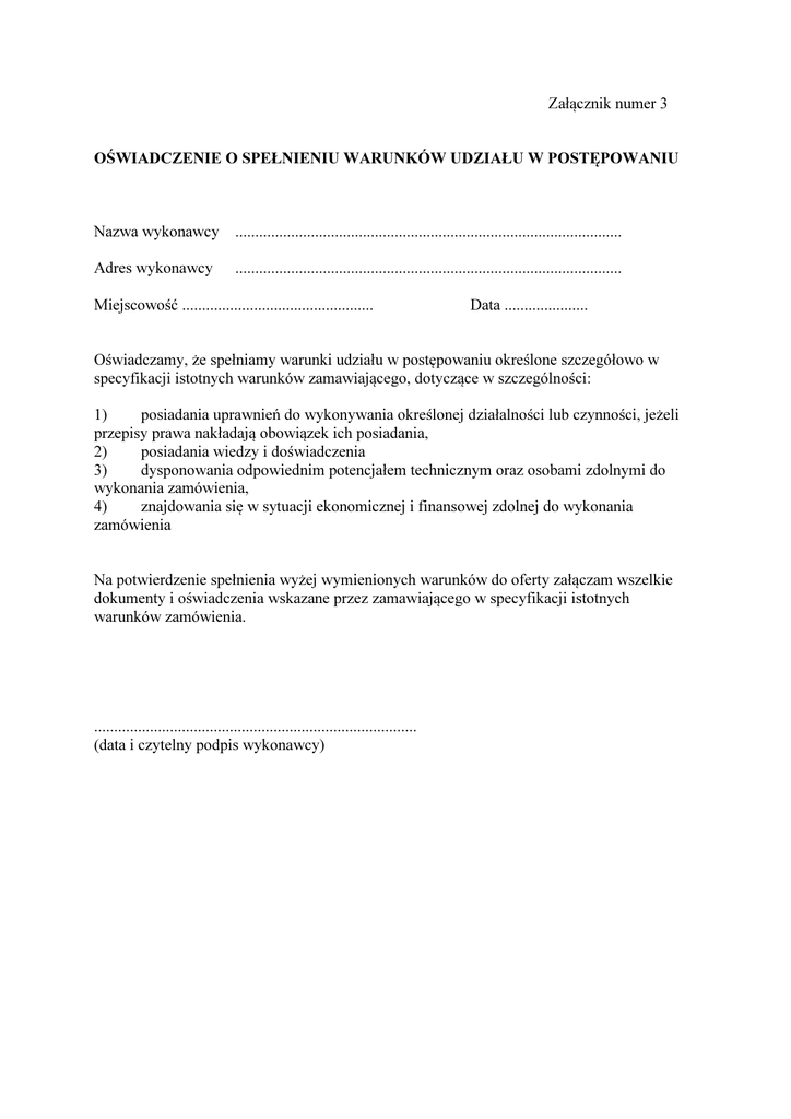 Załącznik numer 3 OŚWIADCZE IE O SPEŁ IE IU WARU KÓW UDZIAŁU W POSTĘPOWA IU Nazwa wykonawcy ................................................................................................. Adres wykonawcy ................................................................................................. Miejscowość ................................................ Data ..................... Oświadczamy, że spełniamy warunki udziału w postępowaniu określone szczegółowo w specyfikacji istotnych warunków zamawiającego, dotyczące w szczególności: 1) posiadania uprawnień do wykonywania określonej działalności lub czynności, jeżeli przepisy prawa nakładają obowiązek ich posiadania, 2) posiadania wiedzy i doświadczenia 3) dysponowania odpowiednim potencjałem technicznym oraz osobami zdolnymi do wykonania zamówienia, 4) znajdowania się w sytuacji ekonomicznej i finansowej zdolnej do wykonania zamówienia Na potwierdzenie spełnienia wyżej wymienionych warunków do oferty załączam wszelkie dokumenty i oświadczenia wskazane przez zamawiającego w specyfikacji istotnych warunków zamówienia. ................................................................................. (data i czytelny podpis wykonawcy)