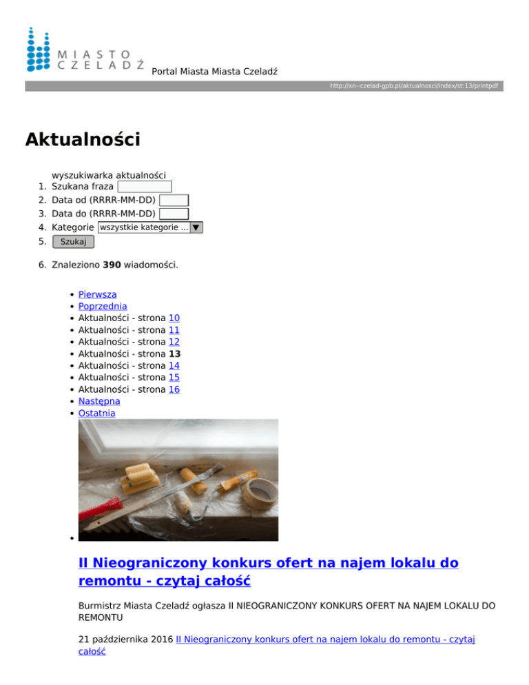Portal Miasta Miasta Czeladź http://xn--czelad-gpb.pl/aktualnosci/index/st:13/printpdf Aktualności wyszukiwarka aktualności 1. Szukana fraza 2. Data od (RRRR-MM-DD) 3. Data do (RRRR-MM-DD) 4. Kategorie wszystkie kategorie ... ▼ 5. Szukaj 6. Znaleziono 390 wiadomości. Pierwsza Poprzednia Aktualności - strona 10 Aktualności - strona 11 Aktualności - strona 12 Aktualności - strona 13 Aktualności - strona 14 Aktualności - strona 15 Aktualności - strona 16 Następna Ostatnia II Nieograniczony konkurs ofert na najem lokalu do remontu - czytaj całość Burmistrz Miasta Czeladź ogłasza II NIEOGRANICZONY KONKURS OFERT NA NAJEM LOKALU DO REMONTU 21 października 2016 II Nieograniczony konkurs ofert na najem lokalu do remontu - czytaj całość Puchar Śląskiego Kuratora Oświaty dla Czeladzi - czytaj całość W dniu dzisiejszym w Zawierciu odbyła się Wojewódzka Inauguracja Sportowego Roku Szkolnego 2016/17. Podczas tej uroczystości Miejski Zespół Szkół - Szkoła Podstawowa nr 2 nagrodzona została Pucharem Śląskiego Kuratora Oświaty w Katowicach 19 października 2016 Puchar Śląskiego Kuratora Oświaty dla Czeladzi - czytaj całość Imponująca rekonstrukcja wydarzeń powstańczych z przełomu lat 1806-07 - czytaj całość Pierwsza w dziejach Czeladzi niepowtarzalna inscenizacja została zorganizowana na pamiątkę zakończonych zwycięsko działań wojskowych wymierzonych przeciw Prusakom na obszarze tzw. Nowego Śląska, w skład którego od 1795 r. wchodziła także Czeladź. 18 października 2016 Imponująca rekonstrukcja wydarzeń powstańczych z przełomu lat 1806-07 - czytaj całość I Turniej Grand Prix Czeladzi w Badmintonie - czytaj całość Miejski Szkolny Związek Sportowy zaprasza mieszkańców na: I TURNIEJ GRAND PRIX CZELADZI W BADMINTONIE 17 października 2016 I Turniej Grand Prix Czeladzi w Badmintonie - czytaj całość 30 lat Młodzieżowego Koła Filatelistycznego - czytaj całość 30 lat Młodzieżowego Koła Filatelistycznego im. Czesława Słani w Czeladzi 17 października 2016 30 lat Młodzieżowego Koła Filatelistycznego - czytaj całość Uroczyście zakończyli Rok Pasieczny - czytaj całość W minioną sobotę, 15 października 2016 roku, Zagłębiowski Związek Pszczelarzy zorganizował uroczyste zakończenie Roku Pszczelego. 17 października 2016 Uroczyście zakończyli Rok Pasieczny - czytaj całość Kolejne wyróżnienia w dziedzinie edukacji - czytaj całość 12 października 2016 roku Burmistrz Miasta Czeladź Zbigniew Szaleniec odebrał, drugi raz z rzędu tytuł, "Samorządowego Lidera Edukacji". 14 października 2016 Kolejne wyróżnienia w dziedzinie edukacji - czytaj całość Nie tylko plac zabaw, czyli BO po nowemu - czytaj całość Budżet Obywatelski w Czeladzi, od początku funkcjonowania, jednoznacznie kojarzony jest z inwestycją ściśle związaną z wykorzystaniem działek, należących do samorządu. Tymczasem wydatkowanie środków z budżetu partycypacyjnego daje dużo więcej możliwości. 14 października 2016 Nie tylko plac zabaw, czyli BO po nowemu - czytaj całość Dzień Edukacji Narodowej - czytaj całość Najlepsze życzenia dla wszystkich nauczycieli i pracowników oświaty z okazji Dnia Edukacji Narodowej. 14 października 2016 Dzień Edukacji Narodowej - czytaj całość Czeladź wspiera małe i średnie przedsiębiorstwa - czytaj całość Miasto Czeladź zostało laureatem VI Edycji Programu "Samorząd, który wspiera MŚP". 14 października 2016 Czeladź wspiera małe i średnie przedsiębiorstwa - czytaj całość Pierwsza Poprzednia Aktualności - strona 10 Aktualności - strona 11 Aktualności - strona 12 Aktualności - strona 13 Aktualności - strona 14 Aktualności - strona 15 Aktualności - strona 16 Następna Ostatnia