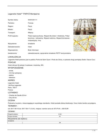 Legendre Hotel** PARYŻ Montperne Symbol oferty: 5443124/111 Państwo: Francja Region: Paryż Miasto: Paryż Transport: Własny Profil wyjazdu: Pobyt wypoczynkowy, Wyjazd dla dzieci i młodzieży, Pobyt leczniczy / zdrowotny, Wyjazd rodzinny, Wyjazd biznesowo motywacyjny, Inny Wyżywienie: śniadanie Zakwaterowanie: Hotel Wyposażenie: Brak informacji świadczenia: zakwaterowanie, opcjonalnie śniadanie PETIT kontynentalne LOKALIZACJA Legendre Hotel położony jest w pobliżu Porte de Saint Quen i Porte de Clichy, w połowie drogi pomiędzy Etoile i Sacre Cour. POKOJE Hotel oferuje 32 pokoje 2 osobowe z łazienką, WC. WYSPOSAŻENIE - winda - mini bar pokojowy - telefon - telewizor ADRES Legendre Hotel 149 Rue Legendre Paris, 75017 France LOTNISKO - Charles de Gaulle 20 km - Orly 20 km. OCENA Polecamy turystom, niewymagającym wysokiego standardu. Hotel posiada dobrą lokalizację. Cena hotelu bardzo przystępna. TERMINY: od: 2017-09-16 do: 2017-09-17 (2 dni), miejsca: zamów cena od: 872 PLN = 200 EUR CENNIK: Długość pobytu: 2 dni Grupa cenowa: A1 Wyżywienie (do wyboru) śniadanie 34 1/2 Pobyt w obiekcie (do wyboru) (*) Pokój dwuosobowy - duże łóżko standardowo dla osób: 2 Ubezpieczenie (do wyboru) ubezpieczenie NW KL Ubezpieczenie (opcjonalne) ubezpieczenie - od kosztów rezygnacji 400 4 3% Waluta: EUR Aktualne ceny z systemu S.A.R.T. (-) - cena usługi, podatku kalkulowana przy osobie lub gratis (*) - kwota wliczona w cenę standardową 2/2