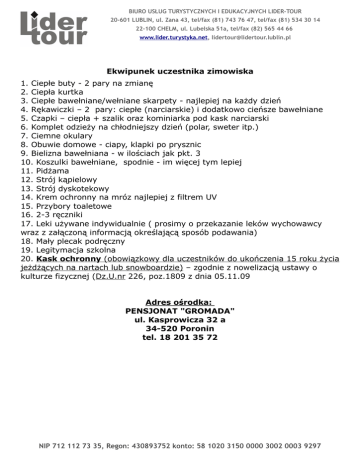 BIURO USŁUG TURYSTYCZNYCH I EDUKACYJNYCH LIDER-TOUR 20-601 LUBLIN, ul. Zana 43, tel/fax (81) 743 76 47, tel/fax (81) 534 30 14 22-100 CHEŁM, ul. Lubelska 51a, tel/fax (82) 565 44 66 www.lider.turystyka.net, [email protected] Ekwipunek uczestnika zimowiska 1. Ciepłe buty - 2 pary na zmianę 2. Ciepła kurtka 3. Ciepłe bawełniane/wełniane skarpety - najlepiej na każdy dzień 4. Rękawiczki – 2 pary: ciepłe (narciarskie) i dodatkowo cieńsze bawełniane 5. Czapki – ciepła + szalik oraz kominiarka pod kask narciarski 6. Komplet odzieży na chłodniejszy dzień (polar, sweter itp.) 7. Ciemne okulary 8. Obuwie domowe - ciapy, klapki po prysznic 9. Bielizna bawełniana - w ilościach jak pkt. 3 10. Koszulki bawełniane, spodnie - im więcej tym lepiej 11. Pidżama 12. Strój kąpielowy 13. Strój dyskotekowy 14. Krem ochronny na mróz najlepiej z filtrem UV 15. Przybory toaletowe 16. 2-3 ręczniki 17. Leki używane indywidualnie ( prosimy o przekazanie leków wychowawcy wraz z załączoną informacją określającą sposób podawania) 18. Mały plecak podręczny 19. Legitymacja szkolna 20. Kask ochronny (obowiązkowy dla uczestników do ukończenia 15 roku życia jeżdżących na nartach lub snowboardzie) – zgodnie z nowelizacją ustawy o kulturze fizycznej (Dz.U.nr 226, poz.1809 z dnia 05.11.09 Adres ośrodka: PENSJONAT "GROMADA" ul. Kasprowicza 32 a 34-520 Poronin tel. 18 201 35 72 NIP 712 112 73 35, Regon: 430893752 konto: 58 1020 3150 0000 3002 0003 9297
