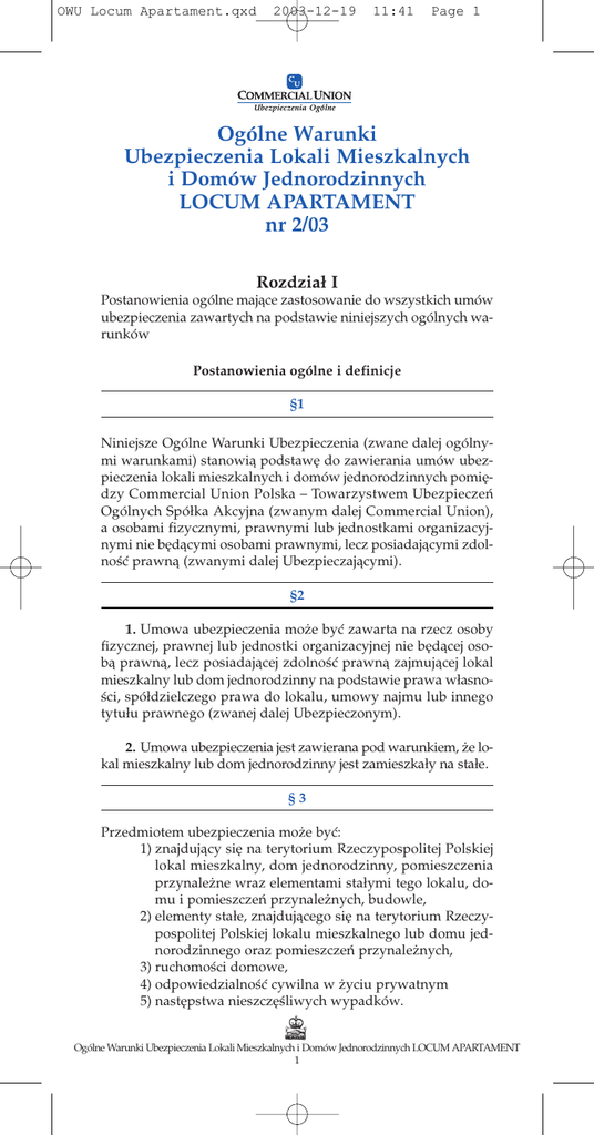 OWU Locum Apartament.qxd 2003-12-19 11:41 Page 1 Ogólne Warunki Ubezpieczenia Lokali Mieszkalnych i Domów Jednorodzinnych LOCUM APARTAMENT nr 2/03 Rozdzia³ I Postanowienia ogólne maj¹ce zastosowanie do wszystkich umów ubezpieczenia zawartych na podstawie niniejszych ogólnych warunków Postanowienia ogólne i definicje §1 Niniejsze Ogólne Warunki Ubezpieczenia (zwane dalej ogólnymi warunkami) stanowi¹ podstawê do zawierania umów ubezpieczenia lokali mieszkalnych i domów jednorodzinnych pomiêdzy Commercial Union Polska – Towarzystwem Ubezpieczeñ Ogólnych Spó³ka Akcyjna (zwanym dalej Commercial Union), a osobami fizycznymi, prawnymi lub jednostkami organizacyjnymi nie bêd¹cymi osobami prawnymi, lecz posiadaj¹cymi zdolnoœæ prawn¹ (zwanymi dalej Ubezpieczaj¹cymi). §2 1. Umowa ubezpieczenia mo¿e byæ zawarta na rzecz osoby fizycznej, prawnej lub jednostki organizacyjnej nie bêd¹cej osob¹ prawn¹, lecz posiadaj¹cej zdolnoœæ prawn¹ zajmuj¹cej lokal mieszkalny lub dom jednorodzinny na podstawie prawa w³asnoœci, spó³dzielczego prawa do lokalu, umowy najmu lub innego tytu³u prawnego (zwanej dalej Ubezpieczonym). 2. Umowa ubezpieczenia jest zawierana pod warunkiem, ¿e lokal mieszkalny lub dom jednorodzinny jest zamieszka³y na sta³e. §3 Przedmiotem ubezpieczenia mo¿e byæ: 1) znajduj¹cy siê na terytorium Rzeczypospolitej Polskiej lokal mieszkalny, dom jednorodzinny, pomieszczenia przynale¿ne wraz elementami sta³ymi tego lokalu, domu i pomieszczeñ przynale¿nych, budowle, 2) elementy sta³e, znajduj¹cego siê na terytorium Rzeczypospolitej Polskiej lokalu mieszkalnego lub domu jednorodzinnego oraz pomieszczeñ przynale¿nych, 3) ruchomoœci domowe, 4) odpowiedzialnoœæ cywilna w ¿yciu prywatnym 5) nastêpstwa nieszczêœliwych wypadków. Ogólne Warunki Ubezpieczenia Lokali Mieszkalnych i Domów Jednorodzinnych LOCUM APARTAMENT 1 OWU Locum Apartament.qxd 2003-12-19 11:41 Page 2 §4 1. Ochrona ubezpieczeniowa mo¿e obejmowaæ: 1) mienie od ryzyka zniszczenia, uszkodzenia lub utraty w wyniku dzia³ania ognia i innych zdarzeñ losowych, przy czym ochrona ubezpieczeniowa mo¿e zostaæ rozszerzona o ubezpieczenie: a) kosztów wynajêcia lokalu lub domu zastêpczego, b) kosztów zwi¹zanych z wynagrodzeniem ekspertów powo³anych przez Ubezpieczonego, c) kosztów poniesionych przez Ubezpieczonego w zwi¹zku z poszukiwaniem przyczyny szkody, 2) mienie od kradzie¿y z w³amaniem lub rozboju, przy czym ochrona ubezpieczeniowa mo¿e zostaæ rozszerzona o ubezpieczenie przedmiotów codziennego u¿ytku od rozboju, 3) odpowiedzialnoœæ cywiln¹ Ubezpieczonego i osób bliskich, 4) œmieræ lub kalectwo Ubezpieczonego wskutek nieszczêœliwych wypadków, 5) okna i drzwi zewnêtrzne lokalu mieszkalnego lub domu jednorodzinnego od dewastacji. 2. Przedmiot i zakres ubezpieczenia jest okreœlony w umowie ubezpieczenia. Zawarcie umowy ubezpieczenia w zakresie okreœlonym w ust. 1 pkt 2 – 5 jest mo¿liwe wy³¹cznie w przypadku zawarcia umowy ubezpieczenia mienia od ryzyka ognia i innych zdarzeñ losowych. §5 Przez u¿yte w niniejszych ogólnych warunkach pojêcia nale¿y rozumieæ: 1. Ubezpieczaj¹cy – osoba fizyczna, prawna lub jednostka organizacyjna niebêd¹ca osob¹ prawn¹ lecz posiadaj¹ca zdolnoœæ prawn¹, zawieraj¹ca umowê ubezpieczenia i zobowi¹zana do op³acenia sk³adki ubezpieczeniowej; 2. Ubezpieczony – osoba fizyczna, prawna lub jednostka organizacyjna niebêd¹ca osob¹ prawn¹ lecz posiadaj¹ca zdolnoœæ prawn¹, posiadaj¹ca tytu³ prawny do zajmowanego lokalu mieszkalnego lub domu jednorodzinnego, na rzecz której umowa ubezpieczenia jest zawierana; 3. osoby bliskie – ma³¿onek Ubezpieczonego lub osoba pozostaj¹ca faktycznie we wspólnym po¿yciu ma³¿eñskim z Ubezpieczonym, jego dzieci, pasierbowie, dzieci przysposobione albo przyjête na wychowanie, rodzice, przysposabiaj¹cy, rodzeñstwo, ojczym, macocha, teœciowie, dziadkowie, wnukowie, ziêciowie i synowe oraz pomoc domowa zatrudniona na podstawie umowy o pracê, umowy – zlecenia lub umowy o dzie³o; Ogólne Warunki Ubezpieczenia Lokali Mieszkalnych i Domów Jednorodzinnych LOCUM APARTAMENT 2 OWU Locum Apartament.qxd 2003-12-19 11:41 Page 3 4. Uposa¿ony – osoba wskazana przez Ubezpieczonego jako uprawniona do otrzymania, na zasadach opisanych w niniejszych ogólnych warunkach, œwiadczenia przewidzianego na wypadek œmierci Ubezpieczonego; 5. zdarzenie szkodowe – powsta³e w okresie ubezpieczenia nieoczekiwane, nag³e zdarzenie losowe, z którym zgodnie z obowi¹zuj¹cymi warunkami ubezpieczenia wi¹¿e siê obowi¹zek wyp³aty odszkodowania ze strony Commercial Union z tytu³u ubezpieczenia mienia lub powsta³e w okresie ubezpieczenia zdarzenie powoduj¹ce wyst¹pienie szkody osobowej lub rzeczowej w ubezpieczeniu odpowiedzialnoœci cywilnej; 6. szkoda osobowa – uszkodzenie cia³a, rozstrój zdrowia lub œmieræ oraz ich nastêpstwa; 7. szkoda rzeczowa -zaginiêcie, zniszczenie lub uszkodzenie, rzeczy ruchomej lub nieruchomoœci oraz ich nastêpstwa; 8. lokal mieszkalny – samodzielny lokal mieszkalny w domu wielorodzinnym, wraz z nale¿¹cymi do Ubezpieczonego czêœciami wspólnymi nieruchomoœci, w której znajduje siê ten lokal mieszkalny; 9. dom jednorodzinny – budynek w uk³adzie wolnostoj¹cym, szeregowym lub bliŸniaczym wraz z nale¿¹cymi do Ubezpieczonego czêœciami wspólnymi tego budynku; 10. pomieszczenia przynale¿ne – pomieszczenia domu wielorodzinnego, w którym mieœci siê wskazany w umowie ubezpieczenia lokal mieszkalny, s³u¿¹ce do wy³¹cznego u¿ytku Ubezpieczonego lub osób bliskich wspólnie z nim zamieszkuj¹cych, np. piwnica oraz budynki gospodarcze po³o¿one na terenie posesji, na której usytuowany jest wskazany w umowie ubezpieczenia dom jednorodzinny, jak te¿ gara¿ bez wzglêdu na jego lokalizacjê, pod warunkiem, ¿e Ubezpieczony posiada tytu³ prawny do powy¿szych pomieszczeñ; 11. budowle – ogrodzenia, mury, bramy