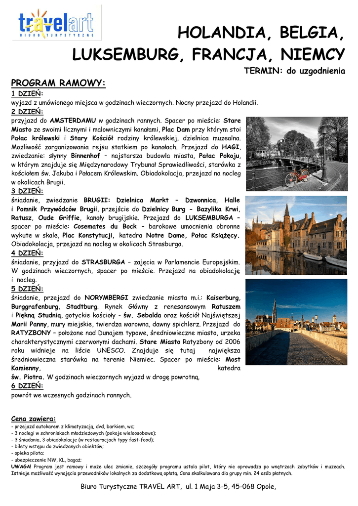 HOLANDIA, BELGIA, LUKSEMBURG, FRANCJA, NIEMCY TERMIN: do uzgodnienia PROGRAM RAMOWY: 1 DZIEŃ: wyjazd z umówionego miejsca w godzinach wieczornych. Nocny przejazd do Holandii. 2 DZIEŃ: przyjazd do AMSTERDAMU w godzinach rannych. Spacer po mieście: Stare Miasto ze swoimi licznymi i malowniczymi kanałami, Plac Dam przy którym stoi Pałac królewski i Stary Kościół rodziny królewskiej, dzielnica muzealna. Możliwość zorganizowania rejsu statkiem po kanałach. Przejazd do HAGI, zwiedzanie: słynny Binnenhof – najstarsza budowla miasta, Pałac Pokoju, w którym znajduje się Międzynarodowy Trybunał Sprawiedliwości, starówka z kościołem św. Jakuba i Pałacem Królewskim. Obiadokolacja, przejazd na nocleg w okolicach Brugii. 3 DZIEŃ: śniadanie, zwiedzanie BRUGII: Dzielnica Markt – Dzwonnica, Halle i Pomnik Przywódców Brugii, przejście do Dzielnicy Burg - Bazylika Krwi, Ratusz, Oude Griffie, kanały brugijskie. Przejazd do LUKSEMBURGA – spacer po mieście: Cosemates du Bock – barokowe umocnienia obronne wykute w skale, Plac Konstytucji, katedra Notre Dame, Pałac Książęcy. Obiadokolacja, przejazd na nocleg w okolicach Strasburga. 4 DZIEŃ: śniadanie, przyjazd do STRASBURGA – zajęcia w Parlamencie Europejskim. W godzinach wieczornych, spacer po mieście. Przejazd na obiadokolację i nocleg. 5 DZIEŃ: śniadanie, przejazd do NORYMBERGI zwiedzanie miasta m.i.: Kaiserburg, Burggrafenburg, Stadtburg. Rynek Główny z renesansowym Ratuszem i Piękną Studnią, gotyckie kościoły - św. Sebalda oraz kościół Najświętszej Marii Panny, mury miejskie, twierdza warowna, dawny spichlerz. Przejazd do RATYZBONY – położone nad Dunajem typowe, średniowieczne miasto, urzeka charakterystycznymi czerwonymi dachami. Stare Miasto Ratyzbony od 2006 roku widnieje na liście UNESCO. Znajduje się tutaj największa średniowieczna starówka na terenie Niemiec. Spacer po mieście: Most Kamienny, katedra św. Piotra. W godzinach wieczornych wyjazd w drogę powrotną. 6 DZIEŃ: powrót we wczesnych godzinach rannych. Cena zawiera: - przejazd autokarem z klimatyzacją, dvd, barkiem, wc; - 3 noclegi w schroniskach młodzieżowych (pokoje wieloosobowe); - 3 śniadania, 3 obiadokolacje (w restauracjach typy fast-food); - bilety wstępu do zwiedzanych obiektów; - opieka pilota; - ubezpieczenie NW, KL, bagaż; UWAGA! Program jest ramowy i może ulec zmianie, szczegóły programu ustala pilot, który nie oprowadza po wnętrzach zabytków i muzeach. Istnieje możliwość wynajęcia przewodników lokalnych za dodatkową opłatą. Cena skalkulowana dla grupy min. 24 osób płatnych. Biuro Turystyczne TRAVEL ART, ul. 1 Maja 3-5, 45-068 Opole, tel/fax. 0048 77 4546065, e-mail:[email protected] www.travelart.pl