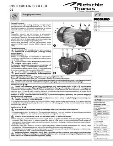 INSTRUKCJA OBSŁUGI A Thomas Industries Company VTE Pompy próżniowe Zakres Wykonania Niniejsza instrukcja obsługi dotyczy następujących, pracujących na sucho pomp łopatkowych: VTE 3 do VTE 10. Zależność wydatku od ciśnienia przedstawiona za pomocą krzywych znajduje się na wykresie w karcie D 187. Opis Wszystkie modele są ko mpletne, z przyłączem podciśnieniowym i tłumikiem wydmuchowym na wylocie. Przechodzące powietrze jest filtrowane poprzez wbudowany mikrofiltr. Wentylator silnika schładza silnik i obudowę pompy. Zarówno silnik jak i pompa mają wspólny wał. Wyposażenie dodatkowe (zależnie od wymogów): zawór regulacyjny (ZRV), zawór zwrotny (ZRK) i włącznik silnika (ZMS). VTE 3 N F VTE 6 VTE 8 VTE 10 E F Zakres Stosowania Q A C B P Urządzenia VTE nadają się do stosowania w instalacjach przemysłowych spełniając normy bezpieczeństwa EN DIN 294 tablica 4. Pompy VTE mogą być zastosowane do opróżniania zamkniętych systemów lub do wytwarzania stałej próżni: od 150 do 1000 mbar. Temperatura otoczenia i temperatura ssania muszą zawierać się pomiędzy 5 i 40 oC. W przypadku wystąpienia temperatur przekraczających ten przedział należy skontaktować się z dostawcą. d Ten typ pomp próżniowych pracujących na sucho nadaje się do powietrza o wilgotności względniej 30 do 90%. Nie wolno zasysać niebezpiecznych mieszanin gazów palnych i wybuchowych, bardzo wilgotnego powietrza, pary wodnej oraz gazów agresywnych, nie mogą też być zasysane opary olejów i smarów. Wykonania standardowe nie mogą być stosowane w strefach zagrożonych wybuchem. Wszystkie zastosowania gdzie niespodziewane wyłączenie zasilania elektrycznego mogłoby spowodować zagrożenie dla osób lub uszkodzenia urządzeń, wymagają zapewnienia zasilania awaryjnego. Ustawienie (rys. i ) Pompy, które osiągnęły temperaturę roboczą mogą mieć w przypadku modeli VTE 6 i VTE 8 temperaturę w miejscu oznaczonym (Q) powyżej 70 oC. Nie dotykać tych gorących miejsc (zobacz też znaki ostrzegające). Zachować min 20 cm odległości z przodu pokrywy obudowy (d) w celach serwisowych. Wloty powietrza chłodzącego (E) oraz jego wylot (F) muszą mieć minimalny odstęp 8 cm aby zapobiec jakimkolwiek uszkodzeniom. Wydmuchiwane powietrze chłodzące nie może być ponownie zasysane. Pompy VTE mogą pracować właściwie tylko gdy są ustawione w pozycji poziomej. Na życzenie mogą być dostarczone inne wykonania. W przypadku ustawienia powyżej 1000 m nad poziomem morza należy uwzględnić pogorszenie wydajności. Dalszych informacji udzieli dostawca. W przypadku posadowienia na solidnym i równym podłożu pompy nie wymagają zamocowania. W przypadku instalacji na standardowym podłożu zaleca się stosowanie mocowań antywibracyjnych. Ten typ pomp charakteryzuje się pracą praktycznie bez wibracji. Instalacja (rys. i ) Przy montażu i użytkowaniu należy przestrzegać lokalnych przepisów bezpieczeństwa. 1. Podłączenie próżniowe do króćca (A). Transportowane powietrze może być wydalane do atmosfery poprzez otwór wydechowy (B) lub poprzez zastosowanie połączenia rurowego lub rurociągu. Jeżeli rurociąg będzie zbyt cienki lub zbyt długi, obniży to wydajność pompy. 2. Dane elektryczne podano na tablicy znamionowej (P). Silniki są zgodne z DIN/VDE 0530 i posiadają stopień ochrony IP 54 oraz klasę izolacji B lub F. Schemat podłączeń znajduje się w puszce przyłączeniowej (nie dotyczy podłączeń specjalnych). Sprawdź dane elektryczne silnika oraz ich zgodność z dostępnym zasilaniem (napięcie, częstotliwość, prąd dopuszczalny, itp.). 3. Podłączyć silnik przez włącznik. Zaleca się użycie wyłącznika z zabezpieczeniem termicznym w celu ochrony silnika i przewodów. Okablowanie wykonać przy użyciu wysokiej jakości połączeń zaciskowych. Zaleca się stosowanie wyłączników przeciążeniowych ze zwłoką czasową, zależną od wielkości prądu przeciążeniowego. Prąd rozruchowy na krótki czas przekracza prąd nominalny. Niebezpieczeństwo zagrażające życiu jeśli instalacja została wykonana przez niewykwalifikowanego montera. Podłączenie elektryczne może być wykonane tylko przez uprawnionego elektryka stosownie do normy EN 60204. Należy zastosować wyłącznik główny. BK 187 1.7.99 Rietschle Thomas Memmingen GmbH Karatasstr. 4 87700 MEMMINGEN GERMANY Fon +49 8331 / 95 70-0 Fax +49 83 31 / 95 70-222 e-mail: [email protected] http://www.rtpumps.com GAREN POST ul. Zeromskiego 14 05-510 KONSTANCINJEZIORNA / POLAND Fon +48 / 22 7 17 56 47 Fax +48 / 22 7 17 56 48 e-mail: [email protected] http:// www.garenpost.com.pl Pierwsze Uruchomienie (rys. ) 1. Włączyć i wyłączyć pompę na kilka sekund w celu sprawdzenia kierunku obrotu w stosunku do strzałki wskazującej (patrz na dane silnika na płytce (P)). Uwaga: Nie należy podłączać rurociągu. Jeżeli pompa pracuje w odwrotnym kierunku może dojść do uszkodzenia łopatek. 2. Podłączyć rurę ciśnieniową do (A). 3. Zawór regulacyjny próżni (opcja dodatkowa): Próżnia może być regulowana poprzez przekręcenie zaworu regulacyjnego (C) zgodnie z symbolami podanymi na górze zaworu regulacyjnego. Y Z X O1 Potencjalne ryzyko dla personelu obsługi Emisja hałasu: Najgorsze poziomy hałasu odnośnie kierunku i intensywności mierzone zgodnie z normą DIN 45635 cześć g f e d 3 (stosownie do 3. GSGV) pokazane są w tabeli poniżej. W przypadku pracy ciągłej w pobliżu działającej pompy zalecamy zakładanie ochrony uszu w celu uniknięcia uszkodzenia słuchu. s Dozór i konserwacja W przypadku naprawy lub konserwacji bezwzględnie odłączyć zasilanie silnika pompy i zabezpieczyć przed przypadkowym włączeniem co mogłoby spowodować zranienie personelu obsługi. Konieczne jest zapobieżenie ponownemu włączeniu pompy podczas konserwacji. Nie serwisować urządzenia bezpośrednio po wyłączeniu ze względu na wysoką temperaturę elementów. 1. Sma