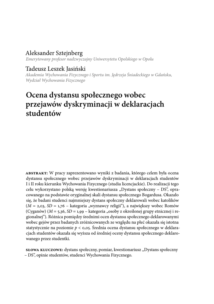 Aleksander Sztejnberg Emerytowany profesor nadzwyczajny Uniwersytetu Opolskiego w Opolu Tadeusz Leszek Jasiński Akademia Wychowania Fizycznego i Sportu im. Jędrzeja Śniadeckiego w Gdańsku, Wydział Wychowania Fizycznego Ocena dystansu społecznego wobec przejawów dyskryminacji w deklaracjach studentów abstrakt: W pracy zaprezentowano wyniki z badania, którego celem była ocena dystansu społecznego wobec przejawów dyskryminacji w deklaracjach studentów I i II roku kierunku Wychowania Fizycznego (studia licencjackie). Do realizacji tego celu wykorzystano polską wersję kwestionariusza „Dystans społeczny – DS”, opracowanego na podstawie oryginalnej skali dystansu społecznego Bogardusa. Okazało się, że badani studenci najmniejszy dystans społeczny deklarowali wobec katolików (M = 2,03, SD = 1,76 – kategoria „wyznawcy religii”), a największy wobec Romów (Cyganów) (M = 5,36, SD = 1,99 – kategoria „osoby z określonej grupy etnicznej i regionalnej”). Różnica pomiędzy średnimi ocen dystansu społecznego deklarowanymi wobec gejów przez badanych zróżnicowanych ze względu na płeć okazała się istotna statystycznie na poziomie p < 0,05. Średnia ocena dystansu społecznego w deklaracjach studentów okazała się wyższa od średniej oceny dystansu społecznego deklarowanego przez studentki. słowa kluczowe: dystans społeczny, pomiar, kwestionariusz „Dystans społeczny – DS”, opinie studentów, studenci Wychowania Fizycznego. Aleksander Sztejnberg Emerytowany prof. nadzwyczajny Uniwersytetu Opolskiego [email protected] Kontakt: Tadeusz Leszek Jasiński Akademia Wychowania Fizycznego i Sportu im. Jędrzeja Śniadeckiego w Gdańsku, Wydział Wychowania Fizycznego [email protected] Jak cytować: Sztejnberg, A., Jasiński, T. L. (2015). Ocena dystansu społecznego wobec przejawów dyskryminacji w deklaracjach studentów. Forum Oświatowe, 27(1), 103–118. Pobrane z: http://forumoswiatowe.pl/index.php/czasopismo/article/view/357 How to cite: Sztejnberg, A., & Jasiński, T. L. (2015). Ocena dystansu społecznego wobec przejawów dyskryminacji w deklaracjach studentów. Forum Oświatowe, 27(1), 103–118. Retrieved from http://forumoswiatowe.pl/index.php/czasopismo/article/view/357 wprowadzenie Koncepcja dystansu społecznego została opracowana przez socjologa amerykańskiego Roberta Ezra Parka w pierwszej połowie lat 30. XX w. Koncepcja ta zakłada, że „istnieją miary i stopnie rozumienia oraz bliskości, którymi zazwyczaj opisują relacje personalne i społeczne” (Park, 1924, s. 339; por. Błuszkowski, 2003, s. 28; Bodziany, 2012; Bogardus, 1925a). Niezwykle jasno założenia koncepcji Parka w literaturze polskojęzycznej opisał Robert Szwed (2004), przyjmując, że dystans jako zjawisko społeczne jest pewnym typem postawy, która – w odniesieniu do różnego rodzaju styczności, kontaktów i interakcji – stanowi continuum, rozciągające się – jak pisał Robert E. Park – „od kontaktów ścisłych, ciepłych i zażyłych, poprzez obojętność, aż do aktywnej antypatii, wrogości i potępienia na drugim jego krańcu”, stanowiąc skalę „pomiędzy intymnością, a całkowitą obcością społeczną” […]. Przyjęcie przez jednostkę określonej postawy na tym continuum wskazuje na jej społeczny dystans, a więc odległość określoną w społecznej przestrzeni, a jednocześnie określa jej miejsce na skali dystansu (duży lub mały dystans) i pośrednio stanowi przesłankę do wskazania kierunku kategoryzowania przez nią rzeczywistości („inny” – „odmienny”, „obcy”, „swój”) (s. 45–46). Koncepcja Parka stanowiła dla amerykańskiego socjologa, Emory’ego S. Bogardusa (1882–1973), podstawę teoretyczną dla opracowania skali dystansu społecznego (Bogardus, 1925a). Zawarte w niej pytania spełniają rolę wskaźników, odzwierciedlających różną wielkość dystansu społecznego (Bogardus, 1925a, 1925b, 1933; Kleg, Yamamoto, 1998; Wark, Galliher, 2007; Woosnam, Lee, 2011). Analiza literatury polskojęzycznej wskazuje, że niewiele badań było realizowanych w szkołach wyższych z wykorzystaniem skali Bogardusa. Interesującym było 104 Forum Oświatowe 27(1) Część ii. Z badań poznanie stopnia nasilenia dystansu społecznego deklarowanego przez studentów nie tylko wobec przedstawicieli grup etnicznych, regionalnych i narodowych, ale i w szerszej perspektywie. Zatem celem podjętych badań była ocena dystansu społecznego wobec przejawów dyskryminacji w deklaracjach studentów. Słowo „dyskryminacja” oznacza nierówne traktowanie. Doświadczają jej konkretne osoby lub grupy ze względu na cechy biologiczne (swoją płeć, wiek, kolor skóry, wygląd), pochodzenie narodowe lub etniczne, religię lub światopogląd (a także wyznanie lub bezwyznaniowość), stopień sprawności fizycznej, chorobę (zarówno fizyczną, jak psychiczną), orientację seksualną, niepełnosprawność, status społeczny i ekonomiczny, poglądy polityczne, styl życia, sytuację życiową (samotne rodzicielstwo, ubóstwo, bezdomność) (Rawłuszko, 2011; Winiarska, Klaus, 2011). „Dyskryminacja oznacza jakiekolwiek zróżnicowanie, wykluczenie lub ograniczenie ze względu na wymienioną cechę lub cechy, których wynikiem jest utrudnienie lub uniemożliwienie korzystania na równi z innymi z praw, wolności i innych dóbr” (Rawłuszko, 2011, s. 8). Tak nakreślony cel pracy starano się zrealizować poprzez pozyskanie odpowiedzi na następujące pytania: 1. Jak studenci oceniają dystans społeczny wobec określonego przejawu dyskryminacji? 2. Czy płeć osób badanych różnicuje oceny dystansu społecznego wobec różnych przejawów dyskryminacji? organizacja badań Badanie przeprowadzono w lutym 2015 roku. Objęto nim ogółem 107 osób, 78 studentów (72,90%) w wieku od 19 do 34 lat (M = 21,81, SD = 2,94) oraz 29 studentek (27,10%) w wieku od 19 do 36 lat (M = 21,17, SD = 3,32). Osoby badane studiowa