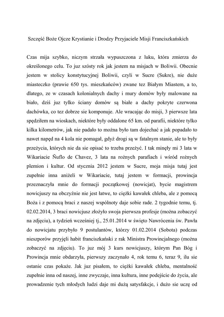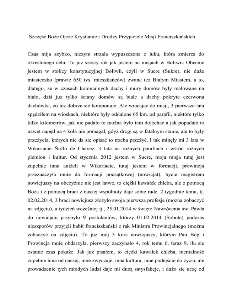 Szczęść Boże Ojcze Krystianie i Drodzy Przyjaciele Misji Franciszkańskich Czas mija szybko, niczym strzała wypuszczona z luku, która zmierza do określonego celu. To juz szósty rok jak jestem na misjach w Boliwii. Obecnie jestem w stolicy konstytucyjnej Boliwii, czyli w Sucre (Sukre), nie duże miasteczko (prawie 650 tys. mieszkańców) zwane tez Białym Miastem, a to, dlatego, ze w czasach kolonialnych dachy i mury domów były malowane na biało, dziś juz tylko ściany domów są białe a dachy pokryte czerwona dachówka, co tez dobrze sie komponuje. Ale wracając do misji, 3 pierwsze lata spędziłem na wioskach, niektóre były oddalone 65 km. od parafii, niektóre tylko kilka kilometrów, jak nie padało to można było tam dojechać a jak popadało to nawet napęd na 4 kola nie pomagał, gdyż drogi są w fatalnym stanie, ale to były przeżycia, których nie da sie opisać to trzeba przeżyć. I tak minęły mi 3 lata w Wikariacie Ñuflo de Chavez, 3 lata na rożnych parafiach i wśród rożnych plemion i kultur. Od stycznia 2012 jestem w Sucre, moja misja tutaj jest zupełnie inna aniżeli w Wikariacie, tutaj jestem w formacji, prowincja przeznaczyła mnie do formacji początkowej (nowicjat), bycie magistrem nowicjuszy na obczyźnie nie jest łatwe, to ciężki kawałek chleba, ale z pomocą Boża i z pomocą braci z naszej wspólnoty daje sobie rade. 2 tygodnie temu, tj. 02.02.2014, 3 braci nowicjusz złożyło swoja pierwsza profesje (można zobaczyć na zdjęciu), a tydzień wcześniej tj., 25.01.2014 w święto Nawrócenia św. Pawła do nowicjatu przybyło 9 postulantów, którzy 01.02.2014 (Sobota) podczas nieszporów przyjęli habit franciszkański z rak Ministra Prowincjalnego (można zobaczyć na zdjęciu). To juz mój 3 kurs nowicjuszy, którym Pan Bóg i Prowincja mnie obdarzyła, pierwszy zaczynało 4, rok temu 6, teraz 9, ilu sie ostanie czas pokaże. Jak juz pisałem, to ciężki kawałek chleba, mentalność zupełnie inna od naszej, inne zwyczaje, inna kultura, inne podejście do życia, ale prowadzenie tych młodych ludzi daje mi dużą satysfakcje, i dużo sie uczę od nich i myślę ze oni de mnie tez. Proszę Was, którzy czytacie teraz ten list o modlitwę za moich braci nowicjuszy i za mnie, imiona moich braci nowicjuszy to: Jorge (Jerzy), Roberto (Robert), Marcos (Marek), Nelson, Samuel, Emmanuel, Guillermo (Gilermo) Moisés (Mojzesz) i Paulo. Ten kurs jest dość zróżnicowany wiekowo i terytorialnie (pochodzenie) najmłodszy ma 20 lat a najstarszy ma 41, pochodzą z różnych stron Boliwii z różnych kultur i tradycji (kolia i kamba). To prawdziwa mozaika. Każdy dzień jest inny, tak jak inni jesteśmy my i dlatego Zycie jest piękne i piękne są misje. Radość, sile, pogodę ducha, Kochani moi, czerpie ze źródła, którym jest Jezus. To On mi wskazuje którędy Kroczyc i jak kochać ludzi, zwłaszcza dziś, w świecie gdzie Miłość nie jest kochana, jak mówił św. Franciszek z Asyżu. Kochani moi, w Polsce już po północy, czyli poniedziałek, u mnie 21: 55 za chwile idę spać. Życzę Wam dobrego tygodnia i niech Wam Dobry Bóg błogosławi. Do usłyszenia, zobaczenia. O. Kacper Nowakowski ofm.