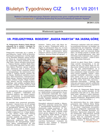 Biuletyn Tygodniowy CIZ 5-11 VII 2011 Biuletyn Centrum Informacyjnego Zakonów opracowywany przez zespół portalu internetowego www.zyciezakonne.pl i sekretariat Konferencji Wyższych Przełożonych Zakonów Męskich 28/2011 (123) Wiadomość tygodnia 19. PIELGRZYMKA RODZINY „RADIA MARYJA” NA JASNĄ GÓRĘ 19. Pielgrzymka Rodziny Radia Maryja odbywała się w sobote i niedzielę na Jasnej Górze z udziałem ok. 100 tys. osób. Pielgrzymka rozpoczęła się w sobotę, 9 lipca Mszą św. o godz. 18.00 na Szczycie. Eucharystii przewodniczył i homilię wygłosił bp Stanisław Stefanek, biskup łomżyński. Mszę św. koncelebrowali także m.in.: bp Ignacy Dec, biskup świdnicki; bp Wacław Depo, biskup zamojsko-lubaczowski; o. Tadeusz Rydzyk, dyrektor Radia Maryja; o. Zachariasz Jabłoński, definitor generalny Zakonu Paulinów; ojcowie redemtoryści. Zebranych witał w imieniu Jasnej Góry o. Łukasz Buzun, podprzeor klasztoru jasnogórskiego. Na zakończenie przemawiał o. Tadeusz Rydzyk, dyrektor Radia Maryja. Modlitewne spotkanie prowadził o. Piotr Andrukiewicz, redemptorysta z Radia Maryja. Oprawę muzyczną przygotowała orkiestra Kopalni Węgla Kamiennego „Staszic” pod dyr. Grzegorza Mierzwińskiego. Jako solistka wystąpiła Darina Petkowa z Bułgarii. Dzień zakończył Apel Jasnogórski, podczas którego rozważania wygłosił o. Tadeusz Rydzyk. leńskiem. Tablica przez całą Mszę św. stała na ołtarzu. Przekazanie tablicy nastąpiło na zakończenie Mszy św. na ręce o. Mieczysława Polaka, podprzeora Jasnej Góry. W trakcie przekazywania tablicy pielgrzymi zebrani na placu śpiewali hymn narodowy 'Jeszcze Polska nie zginęła'(…) „Pierwszym zadaniem radia jest podawanie prawdziwej informacji, nie obciętej i nie zniekształconej, ale integralnej. Tylko taka informacja może być rozumnie przyjęta i wykorzystana, pełni ona wówczas służbę dobru, do którego prawda w sposób naturalny jest przyporządkowana, tylko taka informacja służy budowaniu ładu społecznego opartego na miłości” - mówił w homilii abp Mieczysław Mokrzycki. „Kościół ma głosić Słowo Boże, i według niego oceniać rzeczywistość, a nie zajmować się tym, czy Słowo Boże ma według oceny ludzkiej wymiar polityczny czy nie. Tak więc podsumowałbym, że w Radiu Maryja znaczna część społeczeństwa pozbawiona dotąd wyrażenia możliwości swoich poglądów, nadziei i obaw, uzyskała możliwość zaistnienia w życiu, które stawia sobie za cel ciągłe dążenie do zadań, jakie wyznacza na nowo Słowo Boże, tak hojnie siane ręką Jezusową – podkreślał kaznodzieja – Zasługą tego radia jest poruszanie ważnych problemów społecznych i wskazywanie na zagrożenia dla życia wspólnoty narodowej”. Na jasnogórskim placu przygotowano też stoiska z książkami i materiałami oraz ustawiono telebimy, aby ułatwić pielgrzymom uczestnictwo w uroczystościach. Medialnie spotkanie relacjonowały Radio Maryja i Telewizja Trwam. (…) Przybyli pielgrzymi uczestniczyli we Mszy św. celebrowanej na jasnogórskim Szczycie. Eucharystia rozpoczęła się o godz. 11.00, a przewodniczył jej i homilię wygłosił abp Mieczysław Mokrzycki, metropolita lwowski, wieloletni sekretarz błogosławionego Jana Pawła II. W niedzielę mimo porannych grzmotów, błyskawic i ulewnej burzy, już od samego rana rzesze pielgrzymów gromadziły się na jasnogórskich błoniach. Na doroczne spotkanie słuchacze i sympatycy Radia Maryja przybyli z najdalszych stron Polski, a także z zagranicy m.in. z Rosji, Białorusi, Litwy, Ukrainy, Anglii i Walii. Parkingi wokół sanktuarium bardzo szybko i szczelnie zapełniły się autokarami z logiem Radia. Najważniejszym punktem tegorocznej pielgrzymki było oficjalne przekazanie dla jasnogórskiego sanktuarium tablicy upamiętniającej 96 ofiar katastrofy polskiego samolotu pod Smo- Wszystkich zebranych powitał o. Mieczysław Polak, podprzeor Jasnej Góry. Mówił „Z Jasnogórskiego Sanktuarium nadziei i zawierzenia pragnę pozdrowić 19. Pielgrzymkę Rodziny Radia Maryja, która przez ręce Matki Bożej, Królowej Polski zanosi gorące błaganie do Boga za Kościół, Ojczyznę, Radio Maryja. I przynosi tu tajemnicę swoich serc, swoje bóle i cierpienia, nadzieje i oczekiwania, prosi o wielu ewangelicznych siewców, współpracowników, duchownych i świeckich, dla ratowania dusz ludzkich w Ojczyźnie naszej i na całym świecie”. 1 „W czasie 19. Pielgrzymki Radia Maryja na Jasną Górę musimy pamiętać, że nie przybyliśmy tutaj tylko po to, żeby powiedzieć sobie: ‘jesteśmy z siebie zadowoleni’. Mamy sobie uświadomić konieczność dawania świadectwa: ‘Błogosławieni pokój czyniący’” – mówił kaznodzieja. (…) Na zakończenie Mszy św. miało miejsce ponowienie Aktu Oddania Matce Bożej. O. Tadeusz Rydzyk podziękował wszystkim za udział i organizację uroczystości. Uczestnicy pielgrzymki wystosowali telegram do Ojca Świętego Benedykta XVI Symbolem tegorocznej pielgrzymki stały się miniaturowe, biało-czerwone bereciki na znak miłości do Boga, Kościoła i Ojczyzny. Mszę św. poprzedziły koncerty: Zespołu Muzyki Sakralnej „Lumen” oraz Orkiestry „Victoria”. O. Stanisław Tomoń. Za: www.jasnagora.com Wiadomości krajowe Wielki Odpust Tuchowski zakończony Niedziela, 10.07. to ostatni dzień Wielkiego Odpustu Tuchowskiego. Mszy Świętej wieńczącej Odpust przewodniczył i homilię wygłosił pomocniczy biskup tarnowski Andrzej Jeż. Mówił o mocy słowa Bożego, które stworzyło świat i człowieka. To samo słowo słyszymy w Piśmie Świętym, liturgii, w świecie. Kaznodzieja mówił o Kościele, jako tajemnicy, której nie sposób zrozumieć bez łaski wiary. Tegoroczny Odpust rozpoczął się 01.07 i przeżywany był pod hasłem Z Maryją do pełni komunii z Bogiem, nawiązującym do przeżywanego w Polsce roku duszpasterskiego. Podczas dziesięciu dni Odpustu do Tuchowa przybyło 