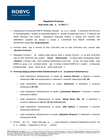 Regulamin Promocji „Kup teraz, zap a w 2017 r.” 1. Organizatorem Promocji jest ROBYG Marketing i Sprzeda Al. Rzeczypospolitej 1 wpisana do Krajowego Rejestru S Miasta Warszawy XIII Wydzia 0000286512 o kapitale zak sp. z o.o. z siedzib dowego prowadzonego przez S Gospodarczy Krajowego Rejestru S adowym w wysoko w Warszawie (02-972) przy d Rejonowy dla dowego pod numerem KRS ci 1.250.000,00 PLN, REGON 141043968, NIP 5252407459, zwana dalej „Organizatorem”. 2. Promocja obowi zuje w terminie od dnia 10.09.2016 roku do dnia 18.09.2016 roku, zwanym dalej „Okresem Promocji”. 3. Adresatami Promocji s pe noletnie osoby fizyczne, które w Okresie Promocji – tj. od dnia 10.09.2016 roku do dnia 18.09.2016 roku podpisz „Umowa”) w jednej z gda ROBYG, tj. grupy, w sk posiada/posiada Umow rednio lub po spó ze spó ek z grupy kapita ki celowe w których ROBYG S.A. z siedzib rednio swoje udzia 4. Promocja dotyczy jedynie lokali zlokalizowanych w ni Lokali mieszkalnych zlokalizowanych na osiedlu „S • na zakup lokalu mieszkalnego (dalej: skich inwestycji realizowanych przez jedn ad której wchodz bezpo Rezerwacyjn owej w Warszawie y. ej opisanych Budynkach tj.: oneczna Morena” w Budynku o numerze realizacyjnym W1 oraz apartamentów w budynkach o numerach realizacyjnych A7, A8; Lokali mieszkalnych zlokalizowanych na osiedlu „Morenova” w Budynkach o numerach • realizacyjnych R4, R5; Lokali mieszkalnych zlokalizowanych na osiedlu „Lawendowe Wzgórza” w Budynku o numerze • realizacyjnym C15-1; Lokali mieszkalnych zlokalizowanych na osiedlu „Stacja Nowy Gda • sk” w Budynkach o numerach realizacyjnych C6, C7, C8, C9, C10 oraz C11; Lokali mieszkalnych zlokalizowanych na osiedlu „Mila Baltica” w Budynkach o numerach • realizacyjnych D i E oraz Lokali mieszkalnych zlokalizowanych na osiedlu „Zajezdnia Wrzeszcz” w Budynkach o numerach • realizacyjnych A i B. 5. Promocj b d obj podlega te s Osoby, które spe y wskazanym w nim wy ni cznie wskazane w niniejszym Regulaminie warunki i nie czeniom. ROBYG Marketing i Sprzedaż sp. z o.o. z siedzibą w Warszawie (02-972) przy Al. Rzeczypospolitej 1, wpisana do Krajowego Rejestru Sądowego prowadzonego przez Sąd Rejonowy dla Miasta Warszawy XII Wydział Gospodarczy Krajowego Rejestru Sądowego pod numerem KRS 0000286512 o kapitale zakładowym w wysokości 1.250.000,00 PLN opłacony w całości, REGON 141043968, NIP 525-24-074-459 Tel.: +48 22 419 11 00; fax.: +48 22 419 11 03; e-mail: [email protected] Osoby, które w Okresie Promocji: • podpisz z jedn ze spó ek z grupy kapita owej ROBYG Umow rezerwacyjn na zakup Lokalu mieszkalnego w jednym z Budynków, o których mowa w pkt 4 nin. Regulaminu, • wp ac • a nast op at rezerwacyjn pnie, zgodnie z tre zgodnie z postanowieniami zawartej Umowy, ci Umowy zawr umow dewelopersk w terminie najpó niej do dnia 31 stycznia 2017 r. tj. osoby, które spe pierwszej wp ni wszystkie wy ej opisane warunki b d uprawnione do uregulowania aty na poczet zakupionego Lokalu mieszkalnego, zgodnie z harmonogramem umowy deweloperskiej tj. w 2017 roku. 6. Uczestnik Promocji przyjmuje do wiadomo Promocji zobowi zany b ci i akceptuje fakt, dzie do uiszczenia pierwszej wp e w przypadku wzi cia udzia u w aty na poczet ceny zakupionego Lokalu mieszkalnego w terminie maksymalnie 21 dni od dnia podpisania Umowy Deweloperskiej. 7. Organizator zastrzega sobie mo 8. Organizator zastrzega mo przysz o liwo liwo odwo ania Promocji w ka dym czasie. zmiany warunków Promocji w ka dym czasie ze skutkiem na . 9. Poprzez przyst pienie do uczestnictwa w Promocji Uczestnik Promocji potwierdza zapoznanie si niniejszym Regulaminem i wyra z a zgod na przetwarzanie i wykorzystywanie jego danych osobowych oraz ich upublicznianie w zakresie okre lonym niniejszym Regulaminem. Dane osobowe Uczestników Promocji b d przetwarzane zgodnie z przepisami ustawy z dnia 29 sierpnia 1997 r. o ochronie danych osobowych. Poprzez przyst si pienie do uczestnictwa w Promocji Uczestnik Promocji potwierdza zapoznanie z niniejszym Regulaminem i wyra a zgod osobowych oraz ich upublicznianie w zakresie okre Informacje dotycz ce Uczestników Promocji mog na przetwarzanie i wykorzystywanie jego danych lonym niniejszym Regulaminem przez Organizatora. by przekazane do Urz du Skarbowego oraz innych uprawnionych organów na podstawie odpowiednich przepisów prawa. 10. Administratorem danych osobowych Uczestników Promocji jest Organizator. Dane osobowe Uczestników Promocji przetwarzane b d wy cznie w celach zwi celów marketingowych oraz w celach zwi Ka okre dy Uczestnik Promocji ma prawo dost zanych z przeprowadzeniem Promocji oraz dla zanych wykonaniem obowi zków w ramach niniejszej Promocji. pu do swoich danych oraz do ich poprawiania na warunkach lonych w ustawie o ochronie danych osobowych. Wszelk z przetwarzaniem danych osobowych prosimy kierowa korespondencj w sprawach zwi zanych na adres Organizatora z dopiskiem „Dane Osobowe”. 11. Wszelkie reklamacje dotycz ce Promocji powinny by zg oszone w formie pisemnej wraz z uzasadnieniem na adres mailowy: [email protected] w terminie do dnia 28 lutego 2017 roku. 2 12. Organizator zobowi zany jest rozpatrzy reklamacj w terminie 14 dni od daty otrzymania reklamacji. 13. Reklamacja sprzeczna z niniejszym Regulaminem Promocji, w szczególno 14. Wszelkie spory powsta e na tle Promocji b d rozpatrywane przez w 15. Promocja nie dotyczy obecnych pracowników i wspó 16. Promocja obj ta niniejszym Regulaminem nie Organizatora i spó ki z grupy ROBYG. Udzia pracowników spó czy si ci z pkt 11 podlega odrzuceniu. a ciwy S d powszechny. ek z grupy kapita owej ROBYG. z innymi promocjami przeprowadzanymi przez w promocji jest dobrowolny. 3