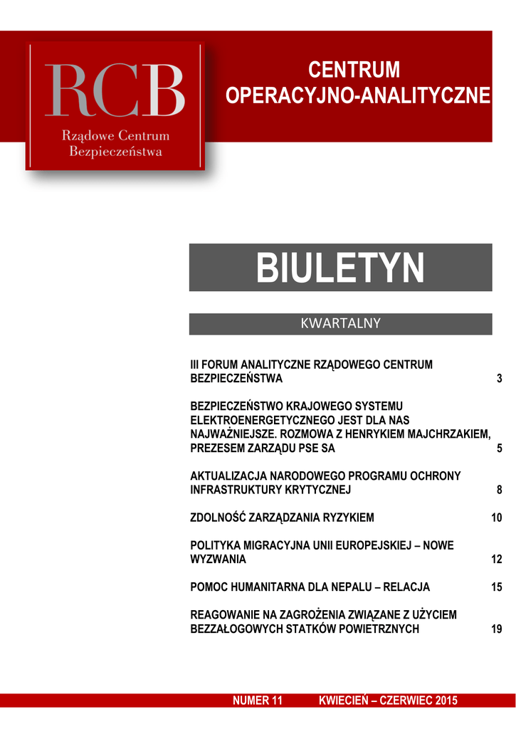 CENTRUM OPERACYJNO-ANALITYCZNE BIULETYN KWARTALNY III FORUM ANALITYCZNE RZĄDOWEGO CENTRUM BEZPIECZEŃSTWA 3 BEZPIECZEŃSTWO KRAJOWEGO SYSTEMU ELEKTROENERGETYCZNEGO JEST DLA NAS NAJWAŻNIEJSZE. ROZMOWA Z HENRYKIEM MAJCHRZAKIEM, PREZESEM ZARZĄDU PSE SA 5 AKTUALIZACJA NARODOWEGO PROGRAMU OCHRONY INFRASTRUKTURY KRYTYCZNEJ 8 ZDOLNOŚĆ ZARZĄDZANIA RYZYKIEM 10 POLITYKA MIGRACYJNA UNII EUROPEJSKIEJ – NOWE WYZWANIA 12 POMOC HUMANITARNA DLA NEPALU – RELACJA 15 REAGOWANIE NA ZAGROŻENIA ZWIĄZANE Z UŻYCIEM BEZZAŁOGOWYCH STATKÓW POWIETRZNYCH 19 NUMER 11 KWIECIEŃ – CZERWIEC 2015 [BIULETYN] 1 lipca 2015 Zespół redakcyjny Biuletynu kwartalnego Rządowego Centrum Bezpieczeństwa: Martyna Olejnik Anna Zasadzińska-Baraniewska Recenzenci: Krzysztof Malesa – Zastępca Dyrektora RCB Grzegorz Świszcz – Szef Centrum Operacyjno-Analitycznego RCB 2|Strona Rządowe Centrum Bezpieczeństwa Al. Ujazdowskie 5, 00-583 Warszawa | tel./fax +48 22 236 59 75 e-mail: [email protected] | w w w . r c b . g o v . p l [BIULETYN] 1 lipca 2015 III Forum Analityczne Rządowego Centrum Bezpieczeństwa 18 czerwca br. w Rządowym Centrum Bezpieczeństwa odbyło się III Forum Analityczne, cykliczne spotkanie służące wymianie doświadczeń z zakresu szeroko pojętej analizy środowiska, bezpieczeństwa i potencjalnych zagrożeń w zmieniających się warunkach globalnych. Wśród prelegentów i zaproszonych gości znaleźli się przedstawiciele ministerstw, urzędów centralnych, służb, sił zbrojnych, spółek skarbu państwa, biznesu i ośrodków analitycznych. Problematyka III Forum Analitycznego koncentrowała się na trzech zagadnieniach: nowych narzędziach i kanałach przekazywania informacji w sytuacjach kryzysowych, polityce migracyjnej Unii Europejskiej oraz rozwiązaniach i dobrych praktykach z zakresu zapewnienia ciągłości działania i współzależności systemów informatycznych. W pierwszym panelu tematycznym, zatytułowanym Komunikacja w sytuacjach kryzysowych – nowe sytuacje – nowe narzędzia, specjaliści z zakresu komunikowania kryzysowego Rządowego Centrum Bezpieczeństwa przedstawili doświadczenia Centrum z nawiązanej przed kilkoma miesiącami współpracy ze Społeczną Krajową Siecią Ratunkową (SKSR). Współdziałanie między RCB a SKSR dotyczy przekazywania przez CB-Radio, czyli radiostacje pasma obywatelskiego pracujące w zakresie od 26,960 MHz do 27,410 MHz, ostrzeżeń i informacji dla społeczeństwa o występujących zagrożeniach i istotnych utrudnieniach. Jest to dla RCB nowy kanał przekazywania doraźnych informacji do obywateli, sprawdzający się głównie w przypadkach nagłych utrudnień komunikacyjnych lub zjawisk atmosferycznych mających wpływ na warunki drogowe, ale stwarzający także rozległe możliwości komunikowania w innych sytuacjach. Również wykorzystywany od niedawna przez RCB Twitter okazał się nośnym i skutecznym sposobem przekazywania informacji o potencjalnych lub faktycznych zagrożeniach, ale także efektywnym narzędziem przeciwdziałania dezinformacji, o którą w zarządzaniu kryzysowym nietrudno. Inny aspekt przekazywania informacji w sytuacjach zagrożenia pokazują dwa systemy omówione na Forum przez przedstawicieli Rządowego Centrum Bezpieczeństwa oraz Ministerstwa Administracji i Cyfryzacji. RCB, MAiC i Podlaski Urząd Wojewódzki – na mocy podpisanego w czerwcu porozumienia – wdrażają Centralną Aplikację Raportującą (CAR) umożliwiającą przesyłanie raportów doraźnych, sytuacyjnych i dobowych między jednostkami systemu zarządzania kryzysowego począwszy od szczebla gminy aż do poziomu centralnego. Zasady raportowania, którego narzędziem informatycznym jest CAR, określa Procedura obiegu informacji pomiędzy krajowymi organami i strukturami zarządzania kryzysowego, stanowiąca załącznik do aktualizowanego właśnie Krajowego Planu Zarządzania Kryzysowego (KPZK). Z kolei Ministerstwo Administracji i Cyfryzacji we współpracy z Telewizją Polską i przy merytorycznym wsparciu RCB realizuje projekt Regionalny System Ostrzegania (RSO), którego cele i zakres funkcjonowania został przedstawiony uczestnikom Forum przez prelegenta z MAiC. RSO to usługa, która umożliwia powiadamianie obywateli o lokalnych zagrożeniach poprzez komunikaty i ostrzeżenia publikowane na stronach internetowych urzędów wojewódzkich 3|Strona Rządowe Centrum Bezpieczeństwa Al. Ujazdowskie 5, 00-583 Warszawa | tel./fax +48 22 236 59 75 e-mail: [email protected] | w w w . r c b . g o v . p l III Forum Analityczne Rządowego Centrum Bezpieczeństwa Anna Zasadzińska-Baraniewska Rządowe Centrum Bezpieczeństwa [BIULETYN] 1 lipca 2015 oraz w naziemnej telewizji cyfrowej, a także dostępne w bezpłatnej aplikacji na telefon. Poprzez RSO rozpowszechniane są także poradniki postępowania w sytuacjach kryzysowych. W trakcie drugiego panelu dyskusyjnego w centrum zainteresowania znalazły się kwestie o znaczeniu europejskim i globalnym – problemy presji migracyjnej z krajów Afryki północnej i Bliskiego Wschodu w kontekście rozwiązań proponowanych przez Komisję Europejską. Wyzwania związane z masowym napływem imigrantów do krajów Unii Europejskiej i konieczność wypracowania mechanizmów reagowania na tę sytuację są w ostatnich miesiącach jednym z najbardziej palących problemów polityki europejskiej. Chodzi o jak najsprawniejsze zaakceptowanie w drodze konsensusu praktycznych rozwiązań możliwych do zastosowania przez wszystkie państwa członkowskie. Polskie stanowisko wobec działań planowanych na szczeblu unijnym przedstawili eksperci z Ministerstwa Spraw Wewnętrznych oraz Urzędu do spraw Cudzoziemców. Trzeci blok tematyczny Forum Analitycznego obejmował zagadnienia związane z zapewnieniem ciągłości działania i zagrożeniami wynikającymi ze współzależności systemów informatycznych. Przedstawiciel RCB omówił potencjalne ryzyka związane z postępującą rozbudową współzależnoś