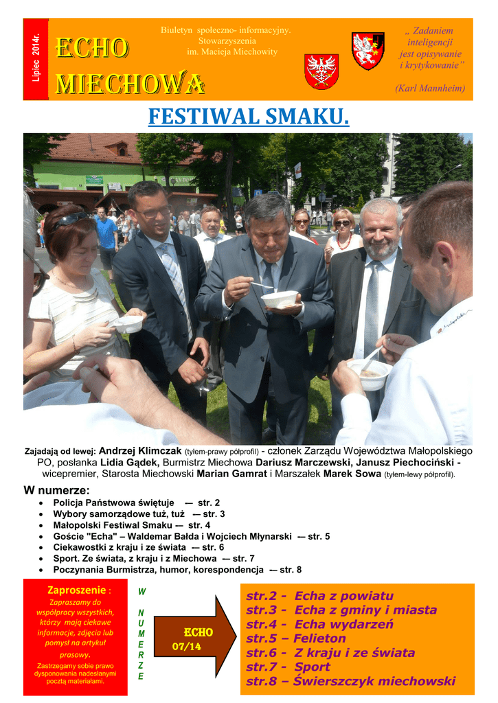 Lipiec 2014r. „ Zadaniem inteligencji jest opisywanie i krytykowanie” Biuletyn społeczno- informacyjny. Stowarzyszenia im. Macieja Miechowity Echo Miechowa (Karl Mannheim) FESTIWAL SMAKU. Andrzej Klimczak (tyłem-prawy półprofil) - członek Zarządu Województwa Małopolskiego PO, posłanka Lidia Gądek, Burmistrz Miechowa Dariusz Marczewski, Janusz Piechociński wicepremier, Starosta Miechowski Marian Gamrat i Marszałek Marek Sowa (tyłem-lewy półprofil). Zajadają od lewej: W numerze: Policja Państwowa świętuje -– str. 2 Wybory samorządowe tuż, tuż -– str. 3 Małopolski Festiwal Smaku -– str. 4 Goście "Echa" – Waldemar Bałda i Wojciech Młynarski -– str. 5 Ciekawostki z kraju i ze świata -– str. 6 Sport. Ze świata, z kraju i z Miechowa -– str. 7 Poczynania Burmistrza, humor, korespondencja -– str. 8 Zaproszenie : Zapraszamy do współpracy wszystkich, którzy mają ciekawe informacje, zdjęcia lub pomysł na artykuł prasowy. Zastrzegamy sobie prawo dysponowania nadesłanymi pocztą materiałami. W N U M E R Z E ECHO 07/14 (92) str.2 str.3 str.4 str.5 str.6 str.7 str.8 – – Echa z powiatu Echa z gminy i miasta Echa wydarzeń Felieton Z kraju i ze świata Sport Świerszczyk miechowski ECHA Z POWIATU 95 lat Policji Państwowej. W lipcu 100 tysięczna rzesza polskich policjantów obchodzi doroczne Święto Policji. W Miechowie uroczystości związane ze Świętem Policji i 95 rocznicą powstania Policji Państwowej odbyły się 18 lipca. Komendę Wojewódzką reprezentował w Miechowie ins. Jacek Fabisiak, z-ca małopolskiego komendanta wojewódzkiego policji a Sejm RP posłanka Lidia Gądek. Z-ca komendanta wojewódzkiego poinformował, że lada dzień zostanie rozstrzygnięty przetarg na budowę nowej siedziby miechowskiej policji (wpłynęło siedem ofert wykonawców). Miechów zasługuje, by mieć nową komendę. Mam nadzieję, że powstanie ona już w przyszłym roku – mówił podczas Święta Policji, insp. Jacek Fabisiak. W czasie uroczystości podziękowano przedstawicielom powiatu i gmin, z których spłynęły pieniądze na inwestycję. W sumie wszystkie samorządy przekazały 250 tysięcy złotych, a powiat dodatkowo działkę o wartości około 180 tysięcy złotych. Budowa komendy ma kosztować kilkanaście milionów zł. Starosta Gamrat zapewnił, że gdy powstanie budynek dla komendy, „powiat z drugiej strony wybuduje piękne boisko”. Święto było również okazją do uhonorowania samorządowców współpracujących z policją i policjantów służących w powiecie miechowskim. 27 funkcjonariuszy mianowano na wyższe stopnie. Komendant Bogusław Słupczyński podkreślił, że w pierwszym półroczu br., w miechowskiej jednostce, wykrywalność ogólna była na poziomie 75–proc., a kryminalna – 68 proc. Insp. Jacek Fabisiak wręczył także odznaczenia. MIANOWANI NA WYŻSZE STOPNIE - na nadkomisarza: Ryszard Kopeć, na aspiranta sztabowego: Zbigniew Bieliński, Piotr Michta, Artur Studziński, Rafał Zelek, Robert Kotyza, na starszego aspiranta: Piotr Magiera, Zbigniew Sokół, Tomasz Żmuda, Waldemar Dudek, Marcin Jamroży, na aspiranta: Witold Wolka, na młodszego aspiranta: Jerzy Machejek, Rafał Bratek, Renata Szwaja, na sierżanta sztabowego: Michał Antolski, Mateusz Niemiec, Grzegorz Mucha, na sierżanta: Kamil Rusek, Marcin Poseł, Elżbieta Maślanka, na starszego posterunkowego: Lidia Kyzioł, Paweł Piętak. ODZNACZENI - medal srebrny za długoletnią służbę: sierż. szt. Grzegorz Gąsiorek, st.asp. Stefan Kwiecień, asp.szt. Piotr Partyka, medal brązowy: Edyta Grela, brązowy medal za zasługi dla Policji: Lesław Blacha, Tomasz Moskwa. odznaka brązowa „Zasłużony Policjant: st.asp. Marcin Chaba. zdj.-1 - Obecna siedziba Komendy Powiatowej Policji w Miechowie. zdj.-2 - Dowódca uroczystości st. asp. Stefan Kwiecień składa meldunek o gotowości do uroczystości ins. Jackowi Fabisiakowi. zdj.-3,4 - Na początek goście i policjanci wysłuchali Mazurka Dąbrowskiego. zdj.-5 - Wśród gości: posłanka Lidia Gądek, Starosta Marian Gamrat, Burmistrz Dariusz Marczewski i proboszcz ks. Mirosław Kaczmarczyk. zdj.-6, 7, 8 - Ins. Jacek Fabisiak wręcza ordery zasłużonym i nominacje miechowskim policjantom. zdj.-9 - Nominacje na wyższy stopień otrzymało 27 miechowskich policjantów. zdj.-10 - Swoje odznaczenia wręczyli także strażacy z PSP w Miechowie. zdj.-11 - Nie zabrakło również odznaczeń dla samorządowców ziemi miechowskiej. 2-gi z lewej Burmistrz Dariusz Marczewski. zdj.-12 - Posłanka Lidia Gądek gratulowała policjantom i życzyła dalszych lat owocnej służby w nowym budynku komendy. Komendanci Państwowej Straży Pożarnej w Miechowie – st.bryg. Grzegorz Kosiński i mł.bryg. Mirosław Pogoń wyróżnili medalami za zasługi dla pożarnictwa, na podst. decyzji Prezydium Zarządu Oddziału Wojewódzkiego ZOSP RP następujących policjantów: srebrnymi medalami – asp. sztab. Pawła Reguckiego i asp. Grzegorza Idzika; brązowymi medalami – asp. sztab. Roberta Kotyzę, asp. Arkadiusza Kowalskiego, sierż. sztab. Marka Pawłowskiego i st. sierż. Andrzeja Janusa. Z OSTATNIEJ CHWILI: 21 lipca został rozstrzygnięty przetarg na budowę nowej siedziby Komendy Powiatowej Policji w Miechowie. Wykonawcą będzie „Grand” – Zakład Usługowo-Produkcyjno-Handlowy z Jasionnej. Przetarg zorganizowała Komenda Wojewódzka Policji w Krakowie. Wpłynęło siedem ofert; jedna była nieważna. Budowa ruszy jeszcze w tym roku. Brawo Gołcza. Gmina Gołcza po raz kolejny została laureatem prestiżowego, ogólnopolskiego Rankingu Samorządów Rzeczpospolitej 2014. Gołcza znalazła się na 30. miejscu wśród gmin wiejskich z całej Polski. To spory skok, bo w ubiegłym roku była sklasyfikowana na 87. pozycji. Nagrodę dla samorządu odebrali podczas gali w Warszawie wójt Lesław Blacha i przewodniczący Rady Gminy Andrzej Dziubka. Ranking Rzeczpospolitej powstaje dwuetapowo. W części pierw