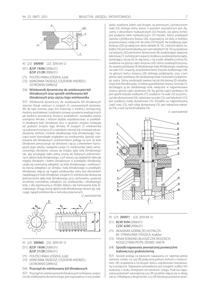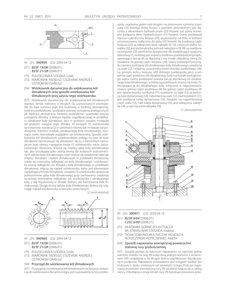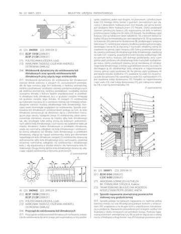Nr 22 (987) 2011 BIULETYN URZĘDU PATENTOWEGO A1 (21) 390959 (22) 2010 04 12 (51) B23F 19/06 (2006.01) B23F 21/28 (2006.01) (71) POLITECHNIKA ŁÓDZKA, Łódź (72) MARCINIAK TADEUSZ; CISZEWSKI ANDRZEJ; OSTROWSKI DARIUSZ (54) Wiórkownik dynamiczny do wiórkowania kół ślimakowych oraz sposób wiórkowania kół ślimakowych przy użyciu tego wiórkownika (57) Wiórkownik dynamiczny do wiórkowania kół ślimakowych stanowi ślimak walcowy o zwojach (1), usytuowanych prostopadle do kąta wzniosu jego linii śrubowej, o średnicy zewnętrznej, średnicy podziałowej i podziałce osiowej uzwojenia analogicznych jak średnica zewnętrzna, średnica podziałowa i podziałka osiowa uzwojenia ślimaka, z którym będzie współpracować w przekładni obrabiane koło ślimakowe, lecz o grubości zwojów mniejszej od grubości zwojów tego ślimaka. W zwojach (1) wiórkownika są wykonane wycięcia (2) o szerokości równej lub mniejszej od podwojonej wartości modułu obrabianego koła ślimakowego, tworzące rowki równoległe względem osi wiórkownika. Sposób wiórkowania kół ślimakowych wiórkownikiem polega na tym, że koło ślimakowe zamocowuje się obrotowo i łączy z elementem hamującym jego obroty, następnie zwoje (1) wiórkownika, także zamocowanego obrotowo, wsuwa się między zęby koła ślimakowego tak, aby przylegały tylko jedną stroną do kolejnych jednoimiennych zębów koła ślimakowego, czyli tworzy się zazębienie takie jak między ślimakiem i kołem ślimakowym w przekładni ślimakowej, ustala się nominalną odległość osi koła ślimakowego i wiórkownika równą odległości osi ślimaka i koła ślimakowego w przekładni ślimakowej, włącza się napęd wiórkownika, który jest elementem napędzającym koło ślimakowe, zwojami (1) wiórkownika skrawa się jednostronnie zęby koła ślimakowego przy zachowaniu ustalonej wcześniej nominalnej odległości osi wiórkownika i obrabianego koła, z siłą regulowaną w drodze doboru siły hamowania koła ślimakowego. Drugą stronę zębów koła ślimakowego skrawa się, włączając napęd wiórkownika w kierunku przeciwnym. (2 zastrzeżenia) A1 (21) 390960 (22) 2010 04 12 (51) B23F 19/06 (2006.01) B23F 21/28 (2006.01) (71) POLITECHNIKA ŁÓDZKA, Łódź (72) MARCINIAK TADEUSZ; CISZEWSKI ANDRZEJ; OSTROWSKI DARIUSZ (54) Przyrząd do wiórkowania kół ślimakowych (57) Przyrząd do wiórkowania kół ślimakowych na frezarce, zwłaszcza do wiórkowania dynamicznego, jest wyposażony w trzy podze- 7 społy, osadzone, jeden nad drugim, na pionowym, cylindrycznym wale (12), którego dolny koniec z gwintem zewnętrznym jest złączony z siłownikiem hydraulicznym (22) frezarki, zaś górny koniec jest podparty kłem hydraulicznym (11) frezarki. Dolny podzespół stanowi cylindryczny korpus (20), wyposażony od dołu w kołnierz przymocowany rozłącznie do stołu (21) frezarki. Na środkową część korpusu (20) są nakręcone dwie nakrętki (9, 10), z których dolna nakrętka (10) jest kontrnakrętką zaś nad nakrętkami (9, 10) są osadzone na korpusie (20) pierścienie dystansowe (8), podpierające sprężynę talerzową (7), na której jest wsparty środkowy podzespół przyrządu, zawierający tarczę (6) ze złączoną z nią trwale okładziną cierną (5), osadzone na górnej części korpusu (20). Górny podzespół przyrządu zawiera podstawę (4) obrabianego koła ślimakowego, osadzoną na wale (12) i wspartą, za pośrednictwem łożyska wzdłużnego (18), na górnym końcu korpusu (20) dolnego podzespołu, przy czym górna część podstawy (4) obrabianego koła ma kształt wydrążonego walca. Górny podzespół zawiera tarczę dociskową (2) obrabianego koła ślimakowego, w której są przelotowe otwory na śruby (1), dociskające ją do obrabianego koła, wkręcane w nagwintowane otwory górnej części podstawy (4). Na górnej części podstawy (4) jest oparte łożysko wzdłużne (17), osadzone na wale (12) za pomocą tulei dystansowej (16), natomiast na wale (12), nad łożyskiem (17), jest osadzona tuleja dystansowa (15). Ponadto na nagwintowaną część wału (12), nad tuleją dystansową (15), jest nakręcona nakrętka (14), a nad nią kontrnakrętka (13). (1 zastrzeżenie) A1 (21) 390971 (22) 2010 04 13 (51) B23K 9/04 (2006.01) C23C 6/00 (2006.01) (71) AKADEMIA GÓRNICZO-HUTNICZA IM. STANISŁAWA STASZICA, Kraków (72) TASAK EDMUND; BŁAJSZCZAK WOJCIECH; NOSZCZYŃSKI PIOTR; ZIEWIEC ANETA (54) Sposób napawania zewnętrznej powierzchni stalowej rury grubościennej (57) Sposób polega na łukowym napawaniu co najmniej jednej warstwy metalu na rurę (R) połączoną jednym końcem z wrzecionem (W) urządzenia a na drugim końcu współosiowo łożyskowaną w podporze. Napawanie prowadzone jest ściegiem wzdłuż linii śrubowej o skoku mniejszym od szerokości ściegu. Podczas napawania przestrzeń wewnętrzną rury (R) szczelnie włącza się w obieg cieczy chłodzącej a drugi koniec rury (R) łożyskuje poosiowo-prze- 8 BIULETYN URZĘDU PATENTOWEGO Nr 22 (987) 2011 suwnie ze sprężystym dociskiem osiowym (F). Sposób jest szczególnie korzystny dla procesu regeneracji zużytych rolek samotoku z walcowni stali. (1 zastrzeżenie) A1 (21) 390991 (22) 2010 04 15 (51) B28B 7/00 (2006.01) (71) SIENKIEWICZ MAT-BUD SPÓŁKA Z OGRANICZONĄ ODPOWIEDZIALNOŚCIĄ, Warszawa (72) ŁAZĘCKI JAKUB (54) Sposób wytwarzania formy do odlewania rdzeni, kształtujących podstawę studni (57) Sposób wytwarzania formy do odlewania rdzeni, kształtujących podstawę studni, polega na tym, że w styropianowej kostce (1) kształtowym drutem oporowym wycina się pochyło gałęzie (7, 8) i wyjmuje się je kolejno po wycięciu z kostki (1), a następnie od strony wybrania wykonuje się w kostce (1) stożkowe wycięcie. Wybranie szlifuje się i pokrywa warstwowo żywicą epoksydową, tkaniną szklaną oraz szpachlówką epoksydową i maluje lakierem poliuretanowym. (3 zastrzeżenia) studni, gdzie z prostopa