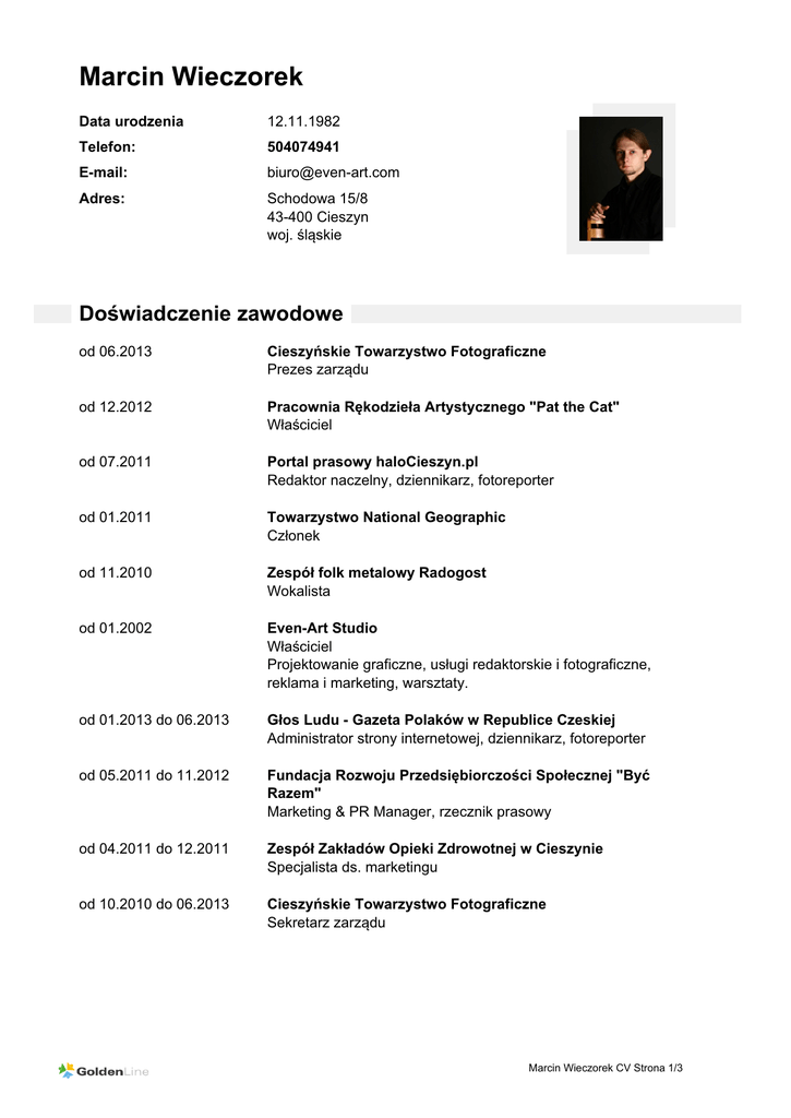 Marcin Wieczorek Data urodzenia 12.11.1982 Telefon: 504074941 E-mail: [email protected] Adres: Schodowa 15/8 43-400 Cieszyn woj. śląskie Doświadczenie zawodowe od 06.2013 Cieszyńskie Towarzystwo Fotograficzne Prezes zarządu od 12.2012 Pracownia Rękodzieła Artystycznego "Pat the Cat" Właściciel od 07.2011 Portal prasowy haloCieszyn.pl Redaktor naczelny, dziennikarz, fotoreporter od 01.2011 Towarzystwo National Geographic Członek od 11.2010 Zespół folk metalowy Radogost Wokalista od 01.2002 Even-Art Studio Właściciel Projektowanie graficzne, usługi redaktorskie i fotograficzne, reklama i marketing, warsztaty. od 01.2013 do 06.2013 Głos Ludu - Gazeta Polaków w Republice Czeskiej Administrator strony internetowej, dziennikarz, fotoreporter od 05.2011 do 11.2012 Fundacja Rozwoju Przedsiębiorczości Społecznej "Być Razem" Marketing & PR Manager, rzecznik prasowy od 04.2011 do 12.2011 Zespół Zakładów Opieki Zdrowotnej w Cieszynie Specjalista ds. marketingu od 10.2010 do 06.2013 Cieszyńskie Towarzystwo Fotograficzne Sekretarz zarządu Marcin Wieczorek CV Strona 1/3 Doświadczenie zawodowe od 04.2010 do 06.2010 Zespół Pieśni i Tańca Ziemi Cieszyńskiej im. Janiny Marcinkowej Redaktor, grafik Redakcja, opracowanie graficzne, skład i łamanie albumu "Na cieszyńską nutę" wydanego z okazji jubileuszu 60-lecia Zespołu Pieśni i Tańca Ziemi Cieszyńskiej im. Janiny Marcinkowej od 04.2008 do 04.2011 Tygodnik "Głos Ziemi Cieszyńskiej" Dziennikarz, fotoreporter, redaktor techniczny od 11.2007 do 03.2008 Hurtownia Warzyw i Owoców Pod Plusem Fakturzysta/sprzedawca - zarządzanie kadrą i magazynem - sprzedaż - fakturowanie od 01.2007 do 12.2007 Polsko-czeska grupa poezji śpiewanej Członek-założyciel, gitarzysta, wokalista Wokalista, gitarzysta, pomocnik ds. organizacji imprez (przygotowanie imprezy od strony technicznej i artystycznej). od 01.2005 do 12.2005 Grupa "Kontrapunkt" Członek-założyciel Wokalista, gitarzysta, pomocnik ds. organizacji imprez (przygotowanie imprezy od strony technicznej i artystycznej). od 01.2005 do 12.2005 Grupa Artystyczna "A(ni)matorzy" Członek-założyciel, gitarzysta, wokalista Wokalista, gitarzysta, pomocnik ds. organizacji imprez (przygotowanie imprezy od strony technicznej i artystycznej). od 01.2004 do 12.2004 Grupa Animacyjna "Patefon" Członek-założyciel, techniczny Pomocnik ds. organizacji imprez (przygotowanie imprezy od strony technicznej i artystycznej, nadzorowanie prawidłowego przebiegu imprezy pod względem wizualnym i dźwiękowym). od 07.2001 do 12.2007 Zespół metalowy Goddess of Sin Członek-założyciel, gitarzysta, wokalista Wokalista, gitarzysta oraz lider i menadżer zespołu (komponowanie utworów, pisanie tekstów, dbanie o stronę wizualną zespołu, wykonanie i prowadzenie strony internetowej zespołu, organizacja koncertów, produkcja płyt) Marcin Wieczorek CV Strona 2/3 Wykształcenie od 10.2002 do 06.2007 Uniwersytet Śląski w Katowicach Animacja Społeczno-Kulturalna magisterskie Informacje dodatkowe Przebyte kursy: 2007 - Warsztaty szkoleniowe ,,Jak przygotować projekt i wypełnić wniosek o dotację" zrealizowane przez Centrum Rozwoju Inicjatyw Społecznych 2007 - Kierownik wycieczki szkolnej 2007 - Wychowawca w placówkach wypoczynku dzieci i młodzieży Języki: angielski - komunikatywny czeski - komunikatywny Hobby: Muzyka, fotografia, literatura, film, teatr, grafika komputerowa, śpiew Podsumowanie zawodowe: Nie ma rzeczy niemożliwych Wyrażam zgodę na przetwarzanie moich danych osobowych w celach rekrutacji, zgodnie z Ustawą z dn. 29 sierpnia 1997 r. o ochronie danych osobowych (Dz. U. z 2002 r. Nr 101, poz. 926 z późniejszymi zmianami) Marcin Wieczorek CV Strona 3/3