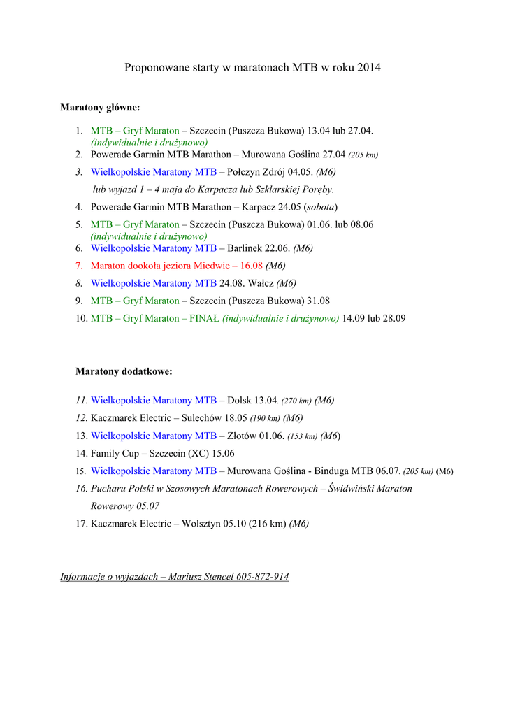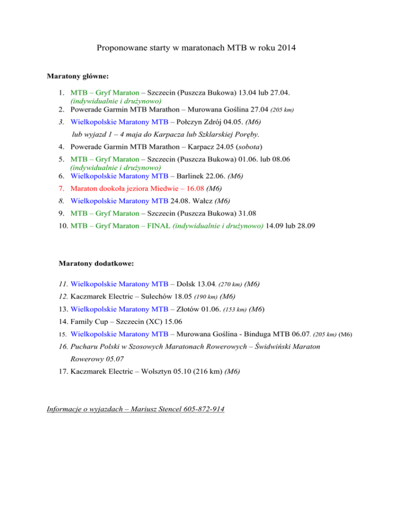 Proponowane starty w maratonach MTB w roku 2014 Maratony główne: 1. MTB – Gryf Maraton – Szczecin (Puszcza Bukowa) 13.04 lub 27.04. (indywidualnie i drużynowo) 2. Powerade Garmin MTB Marathon – Murowana Goślina 27.04 (205 km) 3. Wielkopolskie Maratony MTB – Połczyn Zdrój 04.05. (M6) lub wyjazd 1 – 4 maja do Karpacza lub Szklarskiej Poręby. 4. Powerade Garmin MTB Marathon – Karpacz 24.05 (sobota) 5. MTB – Gryf Maraton – Szczecin (Puszcza Bukowa) 01.06. lub 08.06 (indywidualnie i drużynowo) 6. Wielkopolskie Maratony MTB – Barlinek 22.06. (M6) 7. Maraton dookoła jeziora Miedwie – 16.08 (M6) 8. Wielkopolskie Maratony MTB 24.08. Wałcz (M6) 9. MTB – Gryf Maraton – Szczecin (Puszcza Bukowa) 31.08 10. MTB – Gryf Maraton – FINAŁ (indywidualnie i drużynowo) 14.09 lub 28.09 Maratony dodatkowe: 11. Wielkopolskie Maratony MTB – Dolsk 13.04. (270 km) (M6) 12. Kaczmarek Electric – Sulechów 18.05 (190 km) (M6) 13. Wielkopolskie Maratony MTB – Złotów 01.06. (153 km) (M6) 14. Family Cup – Szczecin (XC) 15.06 15. Wielkopolskie Maratony MTB – Murowana Goślina - Binduga MTB 06.07. (205 km) (M6) 16. Pucharu Polski w Szosowych Maratonach Rowerowych – Świdwiński Maraton Rowerowy 05.07 17. Kaczmarek Electric – Wolsztyn 05.10 (216 km) (M6) Informacje o wyjazdach – Mariusz Stencel 605-872-914 Miejsce Kwiecień Termin Nazwa Imprezy Status Odległość zawodów Gł. Dod. 13 Wielkopolskie Maratony MTB Dolsk (M6) 13 Szczecin G 27 Gryf Maraton (indywidualnie i drużynowo) Powerade Volvo Marathon G 205 km 04 Wielkopolskie Maratony MTB Murowana Goślina Połczyn Zdrój G 100 km 27 D Paździe Wrzesień Sierpień rnik Lipiec Czerwiec Maj 01- Wyjazd treningowo – rekreacyjny Karpacz / 04 tereny górskie Szklarska Poręba 18 Kaczmarek Electric Sulechów 24 Powerade Volvo MTB Marathon Karpacz 01 Wielkopolskie Maratony MTB D D Złotów D Szczecin 22 Wielkopolskie Maratony MTB Barlinek 05 Maraton Szosowy Świdwin D 06 Wielkopolskie Maratony MTB Murowana Goślina D 16 Maraton dookoła jeziora Miedwie Morzyczyn G 24 Wielkopolskie Maratony MTB Wałcz G 31 Gryf Maraton (indywidualnie i drużynowo) Szczecin G 14 Gryf Maraton - FINAŁ lub (indywidualnie i drużynowo) 27 Szczecin G 05 Wolsztyn 153 km G Szczecin Informacje o wyjazdach – Mariusz Stencel 605-872-914 190 km 380 km G 01 Gryf Maraton lub (indywidualnie i drużynowo) 08 15 Family Cup (XC) Kaczmarek Electric 270 km D 50 km G 205 km 120 km D 216 km