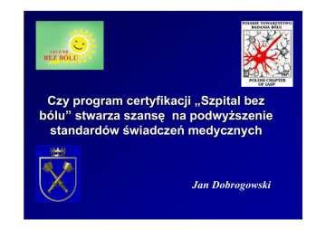 Czy program certyfikacji „Szpital bez bólu” stwarza szansę na podwyŜszenie standardów świadczeń medycznych Jan Dobrogowski Obecna sytuacja Szacuje się, iŜ ból pooperacyjny jest niewłaściwie uśmierzany u ponad połowy pacjentów Przyczyny: - problemy organizacyjne - mała wiedza o uśmierzaniu bólu - brak czasu - złoŜoność postępowania przeciwbólowego Często głównym kryterium wyboru leku przeciwbólowego jest cena (bez liczenia całkowitych kosztów), przyzwyczajenie i dostępność leków przeciwbólowych Zdarza się, Ŝe pielęgniarki a nie lekarze decydują o rodzaju podanego leku przeciwbólowego (terapia na Ŝądanie) Ponadto istnieją co najmniej dwie przeszkody we wdroŜeniu optymalizacji uśmierzania bólu pooperacyjnego: 1. MoŜna i naleŜy to zrealizować, ale bez dodatkowych kosztów (PŁATNIK) 2. Przeszkody psychologiczne : jeŜeli wynik operacji jest dobry, to ból ustępuje w ciągu kilku dni i szybko jest zapominany. Po co zatem stosować wymyślne, skomplikowane i kosztowne techniki uśmierzania bólu, które przecieŜ nie są wolne od powikłań? (PŁATNIK, CHIRURG) WIELOSPECJALISTYCZNY ZESPÓŁ UŚMIERZANIA BÓLU POOPERACYJNEGO (Acute Pain Service) Anestezjolog Pielęgniarka Chirurg Farmakolog Zastosowanie technik znieczulenia regionalnego Zastosowanie i obsługa pomp PCA Nadzór nad prawidłowym stosowaniem analgezji multimodalnej Edukacja personelu medycznego Audyt oceniający wyniki postępowania Obecna sytuacja w Wielkiej Brytanii, Kanadzie i Francji Wielka Brytania i Kanada – w około 90% szpitali istnieją APS Brak środków i refundacji powoduje, Ŝe zmagają się z trudnościami i walczą o przetrwanie Rząd Francji od roku 1994 zwraca uwagę na obowiązek lekarzy i pielęgniarek, a w szczególności anestezjologów, zapewnienia adekwatnego uśmierzania bólu pooperacyjnego. Podkreśla równieŜ prawo pacjenta do otrzymania informacji dotyczących bólu ostrego i jego skutecznego uśmierzania. Nagi H: Acute pain services in the United Kingdom. Acute Pain 2004 Breivik H: Management of acute postoperative pain: Still a long way to go! Pain 2008 PATHOS Postoperative Analgesic THerapy Observational Survey – Obserwacyjne badanie pooperacyjnego leczenia przeciwbólowego Europejskie badanie dotyczące POP (1558 anestezjologów i chirurgów z 746 instytucji w 7 krajach w 2005r.) Dokonano oceny pięciu obszarów, waŜnych dla właściwego uśmierzania bólu pooperacyjnego: • szkolenie personelu, • informowanie pacjentów, • stosowane schematy leczenia, • prowadzenie dokumentacji oraz • monitorowanie bólu Wyniki tego szeroko zakrojonego badania dowodzą, Ŝe nadal istnieją znaczne moŜliwości poprawy w zakresie pooperacyjnego uśmierzania bólu w całej Europie, pomimo rozpowszechnienia w latach 90-tych krajowych i międzynarodowych zaleceń i wytycznych. ORGANIZATORZY PROJEKTU „SZPITAL BEZ BÓLU” Polskie Towarzystwo Badania Bólu - inicjator projektu Polskie Towarzystwo Anestezjologii i Intensywnej Terapii Towarzystwo Chirurgów Polskich Polskie Towarzystwo Ginekologiczne Polskie Towarzystwo Ortopedyczne i Traumatologiczne Grupa Ekspertów Nad merytoryczną częścią projektu czuwa interdyscyplinarna Grupa Ekspertów złoŜona z przedstawicieli wymienionych powyŜej Towarzystw Naukowych oraz Konsultant Krajowy w dziedzinie anestezjologii i intensywnej terapii OPIS I CELE PROJEKTU „SZPITAL BEZ BÓLU” Program polega na nadawaniu certyfikatu „Szpital bez bólu” szpitalom, które spełnią kryteria określone przez Polskie Towarzystwo Badania Bólu. Certyfikat otrzymają szpitale, które będą zapewniać pacjentom najwyŜszy poziom uśmierzania bólu pooperacyjnego. Program ma się przyczynić do poprawy jakości uśmierzania bólu pooperacyjnego w Polsce. KORZYŚCI Z UZYSKANIA CERTYFIKATU • Promocja szpitali/oddziałów, związana z medialnym nagłośnieniem programu „Szpital bez bólu” • Podniesienie wizerunku szpitala/oddziału • Redukcja kosztów hospitalizacji pacjentów dzięki zmniejszeniu częstości występowania powikłań pooperacyjnych oraz wcześniejszemu wypisowi ze szpitala • W przyszłości umoŜliwienie ubiegania się o dodatkowe środki finansowe z NFZ na uśmierzanie bólu pooperacyjnego • ZASADY PRZYZNAWANIA CERTYFIKATU • Wypełnienie kwestionariusza zgłoszeniowego dostępnego na stronie www.szpitalbezbolu.pl • Wprowadzenie niezbędnych procedur w ciągu 3 miesięcy • Wystąpienie z pisemnym wnioskiem do PTBB o nadanie certyfikatu • Kontrola spełnienia wyznaczonych kryteriów przez PTBB • Nadanie certyfikatu na okres 3 lat KRYTERIA PRZYZNAWANIA CERTYFIKATU 1. Uczestnictwo personelu medycznego w szkoleniach z zakresu uśmierzania bólu pooperacyjnego (np. Szkoła Bólu) 2. Prowadzenie monitoringu natęŜenia bólu u wszystkich operowanych pacjentów, co najmniej 4 razy na dobę 3. Informowanie pacjentów o moŜliwości i metodach uśmierzania bólu pooperacyjnego przed zabiegiem 4. Prowadzenie dokumentacji dotyczącej pomiarów bólu i zastosowanego postępowania zgodnie z rekomendacjami uśmierzania bólu 5. Monitorowanie ewentualnych działań niepoŜądanych zastosowanego leczenia na specjalnym formularzu zgłaszania działań niepoŜądanych leków SZKOLENIA DLA PERSONELU MEDYCZNEGO Uczestnictwo personelu medycznego raz w roku w szkoleniu z zakresu bólu pooperacyjnego np. Szkolenie to po powinno obejmować m.in. następujące zagadnienia: • Definicja i patofizjologia bólu, • Konsekwencje źle uśmierzanego bólu pooperacyjnego, • Metody uśmierzania bólu pooperacyjnego, • Informowanie pacjentów o moŜliwościach postępowania w bólu pooperacyjnym. ZALECENIA UŚMIERZANIA BÓLU POOPERACYJNEGO • rekomendowane przez PTBB oraz Konsultanta Krajowego w dziedzinie AiIT • zalecenie to ma siłę decydującą o właściwie realizowanym na terenie szpitala systemie zarządzania jakością • wdroŜenie zaleceń do praktyki klinicznej będzie postrzegane przez płatn