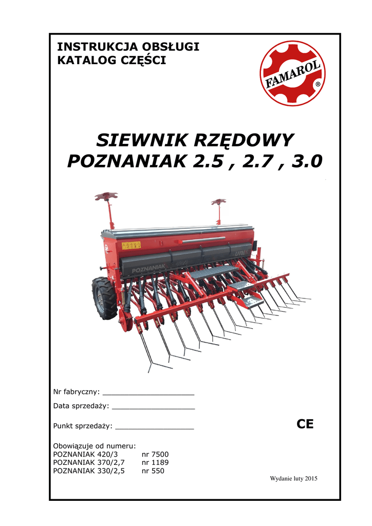 INSTRUKCJA OBSŁUGI KATALOG CZĘŚCI SIEWNIK RZĘDOWY POZNANIAK 2.5 , 2.7 , 3.0 Nr fabryczny: _____________________ Data sprzedaży: ___________________ Punkt sprzedaży: __________________ CE Obowiązuje od numeru: POZNANIAK 420/3 nr 7500 POZNANIAK 370/2,7 nr 1189 POZNANIAK 330/2,5 nr 550 Wydanie luty 2015 Instrukcja obsługi i katalog części- POZNANIAK UWAGA! Do napraw stosować tylko oryginalne części wymienne UNIA-FAMAROL. Tylko one spełniają wymogi bezpieczeństwa i gwarantują długotrwałe użytkowanie maszyn. Na rynku dostępnych jest dużo nieoryginalnych części wymiennych. Zastosowanie tych części może pogorszyć bezpieczeństwo użytkowania i może być przyczyną uszkodzenia maszyny. UNIA-FAMAROL nie bierze odpowiedzialności za naprawy i nie uznaje roszczeń gwarancyjnych dla maszyn, w których zostały zastosowane nieoryginalne części wymienne. 2 Instrukcja obsługi i katalog części- POZNANIAK SPIS TREŚCI 1. IDENTYFIKACJA MASZYNY .................................................................................................................................... 4 2. WPROWADZENIE ...................................................................................................................................................... 4 2.1. Przeczytaj instrukcje obsługi .............................................................................................................................. 4 2.2 Przeznaczenie maszyny ......................................................................................................................................... 5 2.3. Co ważne jest przy zakupie ................................................................................................................................. 5 2.4. Gwarancja................................................................................................................................................................. 6 3. BEZPIECZEŃSTWO I HIGIENA PRACY ................................................................................................................ 7 3.1. Zasady ogólne ......................................................................................................................................................... 7 3.2 Bezpieczeństwo podczas użytkowania ............................................................................................................. 8 3.3 Konserwacja ............................................................................................................................................................. 9 3.4 Układ hydrauliczny.................................................................................................................................................. 9 3.5 Znaki bezpieczeństwa i napisy ostrzegawcze umieszczane na siewniku .............................................. 10 3.6 Jazda transportowa. ............................................................................................................................................. 11 4. CHAREKTYRYSTYKA MASZYNY ........................................................................................................................ 12 4.1 Charakterystyka ogólna ....................................................................................................................................... 12 4.2 Budowa siewnika ................................................................................................................................................... 12 4.3 Wyposażenie siewnika ......................................................................................................................................... 13 4.4 Charakterystyka techniczna ............................................................................................................................... 13 5. OBSŁUGA SIEWNIKA ............................................................................................................................................. 14 5.1 Transport i dostawa .............................................................................................................................................. 14 5.2 Przed przystąpieniem do pracy ......................................................................................................................... 14 5.3 Zawieszenie siewnika na ciągniku .................................................................................................................... 15 5.4 Regulacja głębokości siewu ............................................................................................................................... 16 5.5 Znaczniki boczne ................................................................................................................................................... 17 5.6 Regulacja aparatów wysiewających ................................................................................................................. 18 5.7 Regulacja wielkości wysiewu ............................................................................................................................. 19 5.8 Próba wysiewu ....................................................................................................................................................... 21 5.9 Opróżnianie zbiornika po siewie ....................................................................................................................... 22 5.10 Zespół sterowania ścieżkami ........................................................................................................................... 23 6. PRACA SIEWNIKIEM ............................................................................................................................................... 27 6.4 Ustawienie spulchniacza śladów ciągnika ..........................................................................................