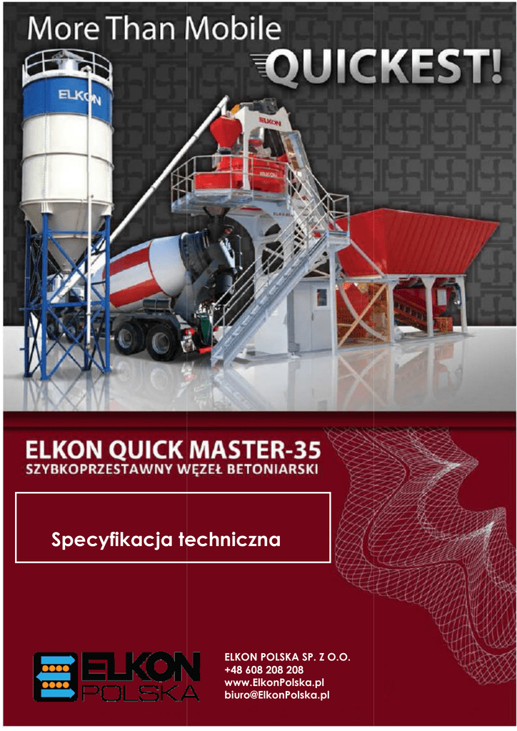 Specyfikacja techniczna ELKON POLSKA SP. Z O.O. +48 608 208 208 www.ElkonPolska.pl [email protected] ELKON POLSKA SP. Z O.O. ul. Puławska 14 lok. 9 02-512 Warszawa Adres : Dawidowska 10 05-500 Piaseczno-Zamienie Produkcja: Cherkezkoy-Turcja Tel : +48 22 332 22 79 Fax: +48 22 332 22 76 Kom. + 48 608 208 208 Web : www.elkonpolska.pl e-mail: [email protected] Nr Opis Ilość ELKON ELKOMIX-35 QUICK MASTER W Pełni Automatyczna Szybko Przestawna Betoniarnia MOBILNA 1 Certyfikaty: CE, ISO 9001 : 2008 (TUV - Niemcy, AQA - Stany Zjednoczone), CE, GOST-R i UKRSerpo Spełnia normy produkcji betonu według normy EN-206-1 Wydajność: do 25-30 m3/godz wibrowanego betonu* Moc instalacyjna wersja standard: 50 kW w wersji letniej Czas produkcji wersji standard: 3-4 tygodnie Specyfikacja 1.1 1.2 1.3 1.4 1.5 1.6 1.7 1.8 1.9 Kieszeniowy zbiornik na kruszywo 4 x 7,5 m3 ( załadunek z dwóch stron, Pojemność nominalna ) (w opcji większa pojemność zasobników na życzenie klienta np. 4x11 m3) lub Rzędowy zasobnik na kruszywo 3-8 x 10 m3 (załadunek z dowolnej strony) Waga Kruszyw (0-2000 kg) (Oparta na 4 tensometrach ważących) Przenośnik taśmowy kruszywa zintegrowany z wagą kruszyw Kosz zasypowy kruszyw + wciągarka skipu ( Skip działa jako zasobnik buforowy dla mieszalnika, 2 prędkości pracy ) Mieszalnik talerzowy lub planetarny 750/500 l. (Brand: ELKON) ( 0,5 m3 gotowego betonu/zarób )(Własna produkcja mieszalników gwarantuje pełną zgodność z całym węzłem) Waga cementu (0-300 kg) ( Oparta na 1 tensometrze ważącym ) Waga wody (0-200 kg) (galwanizowana) (Oparta na 1 tensometrze ważącym) Waga dodatków chemicznych 2-12 x 15 l. (galwanizowana, standardowa waga 2x15l oparta na 1 tensometrze ważącym, pompy chemii dla każdego rodzaju dodatku) Sprężarka powietrza (Brand: HERTZ) 1 1 1 1 1 1 1 1 1 1.10 Konstrukcja wsporna ( wyładunek betonu na wysokości 4m, drabinki, podesty do konserwacji i serwisowania zgodne z BHP ) 1 1.11 Elektroniczny system ważący zgodny z międzynarodowym OIML ( certyfikowane tensometry ważące oraz wskaźniki wagowe, możliwa legalizacja WE lub wzorcowanie wag przez GUMiW) 1 1.12 1.13 1.14 1.15 Panel sterowania PLC oparty na sterowniku przemysłowym + dotykowy ekran sterowania (podzespoły Siemens) Klimatyzowana kabina operatora zintegrowana z konstrukcją węzła Automatyczny system produkcji betonu ELKON GEOTEK + zestaw komputerowy Dokumentacja techniczna węzła betoniarskiego w j. polskim 1 1 1 1 Strona 2 / 22 • ELKON do dnia dzisiejszego zainstalował ponad 1400 wytwórni betonu w 72 krajach świata na 5 kontynentach. W samej Rosji ponad 500 betoniarni. Do chwili obecnej w Polsce zostało zainstalowanych 9 jednostek. ELKON POLSKA SP. Z O.O. ul. Puławska 14 lok. 9 02-512 Warszawa Adres : Dawidowska 10 05-500 Piaseczno-Zamienie Produkcja: Cherkezkoy-Turcja Tel : +48 22 332 22 79 Fax: +48 22 332 22 76 Kom. + 48 608 208 208 Web : www.elkonpolska.pl e-mail: [email protected] OPCJE DODATKOWE ( na życzenie klienta ) 2.1 Sonda pomiaru wilgotności FRANZ LUDWIG do pomiaru wilgotności kruszywa dla 1 komory z piaskiem 2.2 Sonda pomiaru wilgotności i temperatury mieszanki betonowej FRANZ LUDWIG w mieszalniku 2.3 Kraty przesiewowe na zasobnikach kruszyw 2.4 System Recyklingu Betonu 2.5 Podajnik ślimakowy (Ø165, Ø220) Marka: ELKON 2.6 Skręcane silosy na cement (50,75,100,150,300,450,1000 ton) Marka: ELKON lub Monolityczne silosy na cement według życzenia klienta 2.7 Filtr do silosa Marka: WAM 2.8 Akcesoria do silosa (wskaźnik poziomu min-max, system aeracji, ciśnieniowy zawór bezpieczeństwa, Panel wskaźnika max-min. z systemem alarmowym) Dodatkowe akcesoria na życzenie klienta 2.9 Pakiet części zamiennych ( mechanicznych i elektrycznych ) 2.10 Filtr bloku mieszalnika Marka: WAM 2.11 Automatyczny system załadunku kruszyw do zasobnika kruszyw 2.12 Stalowa mobilna rampa dla ładowarki kruszyw ( w zależności od konfiguracji zasobników kruszyw) 2.13 Zabudowa węzła do pracy w zimie 2.14 Kontener grzewczy wraz z dyszami do zasobników kruszyw do pracy w zimie 2.15 Montaż węzła u klienta pod klucz 2.16 Zmiana sterowania zgodnie z życzeniem klienta ( np. na automatykę AKCES, PROFISYSTER itp) Strona 3 / 22 • ELKON do dnia dzisiejszego zainstalował ponad 1400 wytwórni betonu w 72 krajach świata na 5 kontynentach. W samej Rosji ponad 500 betoniarni. Do chwili obecnej w Polsce zostało zainstalowanych 9 jednostek. ELKON POLSKA SP. Z O.O. ul. Puławska 14 lok. 9 02-512 02 512 Warszawa Adres : Dawidowska 10 05-500 Piaseczno-Zamienie Zamienie Produkcja: Cherkezkoy-Turcja Cherkezkoy Tel : +48 22 332 22 79 Fax: +48 22 332 22 76 Kom. + 48 608 208 208 Web : www.elkonpolska.pl e-mail: [email protected] ELKON QUICK MASTER-35 ELKO W PEŁNI AUTOMATYCZNA SZYBKO PRZESTAWNA MOBILNA BETONIARNIA Pozycja robocza ELKON QUICK MASTER -35 z 2 silosami na cement 50t Mrągowo Polska W PEŁNI AUTOMATYCZNA SZYBKOPRZESTAWNA BETONIARNIA Produkt ten został uhonorowany najwyższym wyróżnieniem dla “Innowacyjnego produktu” w rozwojowym konkursie przemysłu tureckiego,, ustanowionym ustanowion w ramach państwowej certyfikacji jakości ® TURQALITY. Szybko montowany węzeł betoniarski serii QUICK MASTER stanowi nowi wyrafinowany produkt poparty wieloma badaniami w branży betoniarskiej. Kluczowym elementem całego węzła jest jego zwartość i kompaktowość, w związku z minimalną formą transportu ( główna jednostka transportowana jest za pomocą tylko 1 TIR ), a także szybkość montażu i demontażu ( który może być wykonany w ciągu zaledwie jednego dnia). Nie ma także potrzeby wykonywania fundamentów a także wbudowywania torowiska skipu pod poziom gruntu. Węzeł może być ustawiony na płytach drogowych na wypoziomowanym i zagęszczonym gruncie, co czyni ten węzeł nie tylko szybko przestawnym ale także ekonomicznym. Dlatego też betoniarnie serii QUICK MASTER łączą cechy instalacji zarówno stacjonarnych i mobilnych. Konstrukcja urządze