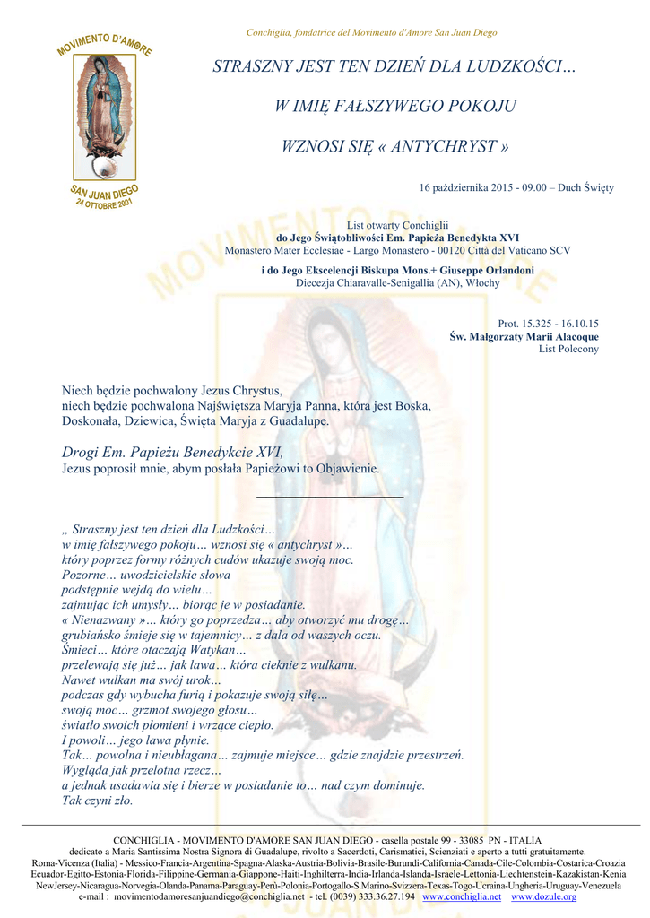 Conchiglia, fondatrice del Movimento d'Amore San Juan Diego STRASZNY JEST TEN DZIEŃ DLA LUDZKOŚCI… W IMIĘ FAŁSZYWEGO POKOJU WZNOSI SIĘ « ANTYCHRYST » 16 października 2015 - 09.00 – Duch Święty List otwarty Conchiglii do Jego Świątobliwości Em. Papieża Benedykta XVI Monastero Mater Ecclesiae - Largo Monastero - 00120 Città del Vaticano SCV i do Jego Ekscelencji Biskupa Mons.+ Giuseppe Orlandoni Diecezja Chiaravalle-Senigallia (AN), Włochy Prot. 15.325 - 16.10.15 Św. Małgorzaty Marii Alacoque List Polecony Niech będzie pochwalony Jezus Chrystus, niech będzie pochwalona Najświętsza Maryja Panna, która jest Boska, Doskonała, Dziewica, Święta Maryja z Guadalupe. Drogi Em. Papieżu Benedykcie XVI, Jezus poprosił mnie, abym posłała Papieżowi to Objawienie. _______________ „ Straszny jest ten dzień dla Ludzkości… w imię fałszywego pokoju… wznosi się « antychryst »… który poprzez formy różnych cudów ukazuje swoją moc. Pozorne… uwodzicielskie słowa podstępnie wejdą do wielu… zajmując ich umysły… biorąc je w posiadanie. « Nienazwany »… który go poprzedza… aby otworzyć mu drogę… grubiańsko śmieje się w tajemnicy… z dala od waszych oczu. Śmieci… które otaczają Watykan… przelewają się już… jak lawa… która cieknie z wulkanu. Nawet wulkan ma swój urok… podczas gdy wybucha furią i pokazuje swoją siłę… swoją moc… grzmot swojego głosu… światło swoich płomieni i wrzące ciepło. I powoli… jego lawa płynie. Tak… powolna i nieubłagana… zajmuje miejsce… gdzie znajdzie przestrzeń. Wygląda jak przelotna rzecz… a jednak usadawia się i bierze w posiadanie to… nad czym dominuje. Tak czyni zło. CONCHIGLIA - MOVIMENTO D'AMORE SAN JUAN DIEGO - casella postale 99 - 33085 PN - ITALIA dedicato a Maria Santissima Nostra Signora di Guadalupe, rivolto a Sacerdoti, Carismatici, Scienziati e aperto a tutti gratuitamente. Roma-Vicenza (Italia) - Messico-Francia-Argentina-Spagna-Alaska-Austria-Bolivia-Brasile-Burundi-California-Canada-Cile-Colombia-Costarica-Croazia Ecuador-Egitto-Estonia-Florida-Filippine-Germania-Giappone-Haiti-Inghilterra-India-Irlanda-Islanda-Israele-Lettonia-Liechtenstein-Kazakistan-Kenia NewJersey-Nicaragua-Norvegia-Olanda-Panama-Paraguay-Perù-Polonia-Portogallo-S.Marino-Svizzera-Texas-Togo-Ucraina-Ungheria-Uruguay-Venezuela e-mail : [email protected] - tel. (0039) 333.36.27.194 www.conchiglia.net www.dozule.org To jest to… co chce uczynić antychryst… fałszywy mesjasz… i dziś… Conchiglio… zostało ci dane poznać jego tożsamość. Znaczenie tego nieszczęsnego dnia stało się rozpalonym piętnem w twoim sercu… które teraz bardziej cierpi. Pokój… pokój… pokój. Ale jaki pokój? Nie istnieje pokój w intencjach Możnych Planety Ziemi. Nie mają go w sercu… nie mają go w umyśle… i ich działania wykazują to dzień po dniu. Antychryst ma już ich wszystkich w garści… i oni są przez niego zdominowani. Mimo to… są oni tak bardzo głupi… że myślą o sprzymierzeniu się z nim… ponieważ nie znają jego rzeczywistej mocy. Materialna moc antychrysta jest wielka… ale jest to w każdym razie słaba moc… jeśli porównać ją do woli człowieka… jeśli ten człowiek jest w Bogu. Istotnie… człowiek… z własnej woli… decyduje w każdej chwili jak prowadzić swoje życie na podstawie pierwotnego wyboru jego Duszy… własnej Duszy. « Nienazwany » chodzi szybko… aby poprowadzić Ludzkość ku Jednej Światowej Religii… a wy gubicie się… czyniąc wojnę między sobą… i rozpraszacie się. Brakuje kilku chwil waszego Czasu… « nienazwany » wyda was w ręce antychrysta… który nie jest istotą eteryczną… ale ma ciało dobrze widzialne ma umysł wyższy od waszego ma wiedzę wyższą od waszej używa nauki jako wycieraczki używa ludzi jak niewolników. Co chce uczynić z tymi niewolnikami? Poprowadzić ich do jednej myśli - jego. Nagiąć ich do jednej woli - jego. Z uprzejmością zaprezentuje wam swój plan… aby pozwolić wam wyewoluować na Ziemi i w ten sposób doprowadzić was do wyewoluowania… żebyście mogli szybować po niebiosach… aby łudzić was możliwą eksploracją Wszechświata. Znajomość materii i niematerii jest jego bronią uwodzenia… a jako że jesteście daleko od Boga Ojca i nie kochacie Go… jak w czasie Adama… Pierwszego Człowieka… będziecie chcieli poznać Tajemnicę Życia… Tajemnicę Stworzenia i to… co jest w Niebiosach. Głupcy. Jak możecie planować… aby dotrzeć do pewnych wysokości wiedzy… jeśli nadal głodzicie i zabijacie dzieci Boże oraz podsycacie głód… nieszczęścia i wojny? Nie potraficie zarządzać Planetą Ziemią i rościcie sobie prawo… aby móc zarządzać czymś innym? Zatrzymajcie się… dopóki jest czas… a czas już minął od dwa tysiące. Czternaście lat biblijnych… 2 CONCHIGLIA - MOVIMENTO D'AMORE SAN JUAN DIEGO - casella postale 99 - 33085 PN - ITALIA dedicato a Maria Santissima Nostra Signora di Guadalupe, rivolto a Sacerdoti, Carismatici, Scienziati e aperto a tutti gratuitamente. Roma-Vicenza (Italia) - Messico-Francia-Argentina-Spagna-Alaska-Austria-Bolivia-Brasile-Burundi-California-Canada-Cile-Colombia-Costarica-Croazia Ecuador-Egitto-Estonia-Florida-Filippine-Germania-Giappone-Haiti-Inghilterra-India-Irlanda-Islanda-Israele-Lettonia-Liechtenstein-Kazakistan-Kenia NewJersey-Nicaragua-Norvegia-Olanda-Panama-Paraguay-Perù-Polonia-Portogallo-S.Marino-Svizzera-Texas-Togo-Ucraina-Ungheria-Uruguay-Venezuela e-mail : [email protected] - tel. (0039) 333.36.27.194 www.conchiglia.net www.dozule.org było potrzebnych dla pierwszej części Wielkiej Księgi Żywota. Zastanówcie się nad liczbą czternaście… następnie dodajcie jeden… nienazwany… następnie dodajcie jeden… antychryst… i mamy szesnaście. Dzisiaj. Antychryst docenia « nienazwanego » tylko pozornie… w rzeczywistości gardzi nim… jak gardzi samym sob