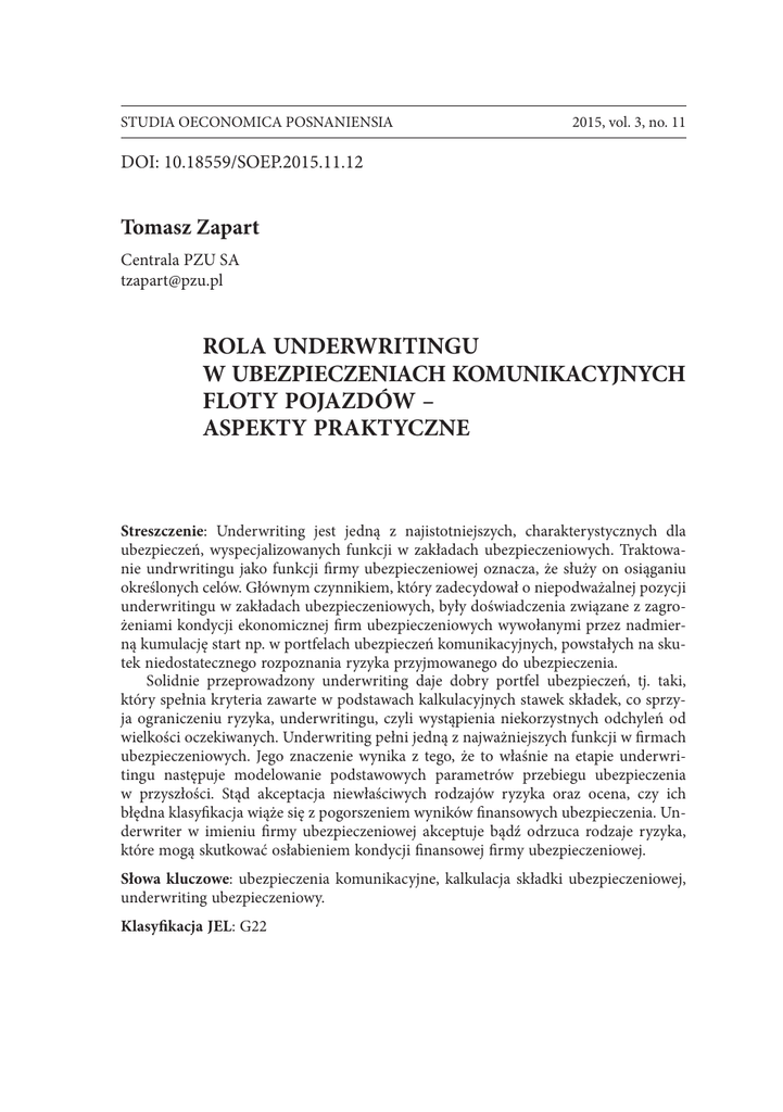 STUDIA OECONOMICA POSNANIENSIA 2015, vol. 3, no. 11 DOI: 10.18559/SOEP.2015.11.12 Tomasz Zapart Centrala PZU SA [email protected] ROLA UNDERWRITINGU W UBEZPIECZENIACH KOMUNIKACYJNYCH FLOTY POJAZDÓW – ASPEKTY PRAKTYCZNE Streszczenie: Underwriting jest jedną z najistotniejszych, charakterystycznych dla ubezpieczeń, wyspecjalizowanych funkcji w zakładach ubezpieczeniowych. Traktowa nie undrwritingu jako funkcji firmy ubezpieczeniowej oznacza, że służy on osiąganiu określonych celów. Głównym czynnikiem, który zadecydował o niepodważalnej pozycji underwritingu w zakładach ubezpieczeniowych, były doświadczenia związane z zagro żeniami kondycji ekonomicznej firm ubezpieczeniowych wywołanymi przez nadmier ną kumulację start np. w portfelach ubezpieczeń komunikacyjnych, powstałych na sku tek niedostatecznego rozpoznania ryzyka przyjmowanego do ubezpieczenia. Solidnie przeprowadzony underwriting daje dobry portfel ubezpieczeń, tj. taki, który spełnia kryteria zawarte w podstawach kalkulacyjnych stawek składek, co sprzy ja ograniczeniu ryzyka, underwritingu, czyli wystąpienia niekorzystnych odchyleń od wielkości oczekiwanych. Underwriting pełni jedną z najważniejszych funkcji w firmach ubezpieczeniowych. Jego znaczenie wynika z tego, że to właśnie na etapie underwri tingu następuje modelowanie podstawowych parametrów przebiegu ubezpieczenia w przyszłości. Stąd akceptacja niewłaściwych rodzajów ryzyka oraz ocena, czy ich błędna klasyfikacja wiąże się z pogorszeniem wyników finansowych ubezpieczenia. Un derwriter w imieniu firmy ubezpieczeniowej akceptuje bądź odrzuca rodzaje ryzyka, które mogą skutkować osłabieniem kondycji finansowej firmy ubezpieczeniowej. Słowa kluczowe: ubezpieczenia komunikacyjne, kalkulacja składki ubezpieczeniowej, underwriting ubezpieczeniowy. Klasyfikacja JEL: G22 166 Tomasz Zapart THE ROLE OF UNDERWRITING MOTOR FLEET INSURANCE – PRACTICAL ASPECTS Abstract: Underwriting is one of the most important functions that characterises tic the insurance market. Underwriting policies identifies areas and types of insurance that should be developed and those products that can be developed under certain condi tions. The main factor that determines the undisputed position of underwriting is experi ence with the poor economic condition of insurance companies caused by the excessive accumulation of losses resulting from an insufficient recognition of risk. Professional underwriting results in a profitable portfolio, ie a portfolio that meets the criteria of premium rate calculation. It enables a reduction of risk, adverse devia tions from the expected results and the administrative work load. The primary purpose of underwriting is to reduce the „negative selection”. Negative selection undoubtedly causes the weak financial condition of insurance companies but also badly affects a cer tain group of customers. As a consequence the clients who maintain appropriate safety standards still have to pay a relatively high premium as the companies compensate for the losses paid out to by customers with an adverse loss history. Keywords: motor insurance, calculation of insurance premiums, insurance under writing. Wstęp Rynek ubezpieczeniowy specjalizuje się w handlu ryzykiem. Zakłady ubez pieczeń są gotowe przyjąć ryzyko za stosowną cenę – wyrażoną składką. Oceną ryzyka ubezpieczeniowego zajmuje się underwriting. Underwriting jest procesem selekcji i klasyfikacji wniosków o zawarcie ubezpieczenia [Vaughan 1982]. Jest on podstawowym elementem skład kowym działalności ubezpieczeniowej [Grabiec 2007]. Jedynym z podsta wowych założeń w taryfowaniu składek jest przyjęcie zasady, że przyszły przebieg szkodowy dla danej grupy ubezpieczeń będzie zbliżony do histo rycznego przebiegu szkodowego, na podstawie którego wyznaczono staw kę taryfową. Z drugiej strony występuje zjawisko tzw. antyselekcji (adverse selection) [Dorman 1998], którą definiuje się jako działania jednostek, które we własnym lub innym interesie zamierzają uzyskać bezpośrednie lub pośred nie korzyści finansowe z systemu klasyfikacji ryzyk (np. firma flotowa stara się nabyć ubezpieczenie autocasco pojazdu od kradzieży bezpośrednio po wystąpieniu groźby kradzieży). Rola underwritingu w ubezpieczeniach komunikacyjnych floty pojazdów167 Jeśli tego typu wnioski, tj. o ponadprzeciętnym ryzykiem, zostaną zaak ceptowane ze stawką przeciętną, to zakład ubezpieczeń poniesie skutki an tyselekcji. Antyselekcja oznacza, że ubezpieczający nie zapłaci składki według stawki słusznej (sprawiedliwej), tj., która odzwierciedlałaby jego ryzy ko. Prowadzić to będzie do większych niż oczekiwano szkód, jeśli underw riter jej nie zidentyfikuje. Niebezpieczeństwo antyselekcji1 [Fedor 2003a] wynika więc z możliwości złego zaklasyfikowania ryzyka i występuje wtedy tzw. asymetryczna informacja między potencjalnym ubezpieczającym a un derwriterem o stopniu zagrożenia ryzykiem [Outreville 1998]. Celem underwritingu jest zapobieżenie bądź ograniczenie atyselekcji ryzyka. W procesie underwritingu powinni być wybrani (wyselekcjonowa ni) ci potencjalni ubezpieczeni, których rzeczywisty przebieg szkodowy nie będzie gorszy niż założony w zasadach taryfowych. W przypadku pojawie nia się sygnałów o możliwości wystąpienia antyselekcji underwriter może wykorzystać, oprócz zakwalifikowania do wyższej klasy taryfowej, również inne środki, np. dołączanie do umowy ubezpieczenia dodatkowych warun ków (zapisów) zabezpieczających. Należy podkreślić, że celem underwritingu nie jest wybranie tylko ryzyka bezszkodowego, co przeczyłoby samej istocie ubezpieczeń. Chodzi wyłącznie o wybranie takich rodzajów ryzyka, w których przebieg szkodowy nie będzie wyższy niż przyjęty w podstawach kalkulacyjnych składek/stawek, tzn. szko dy faktyczne nie powinny być wyższe od oczekiwanych. W danym roku może wyst