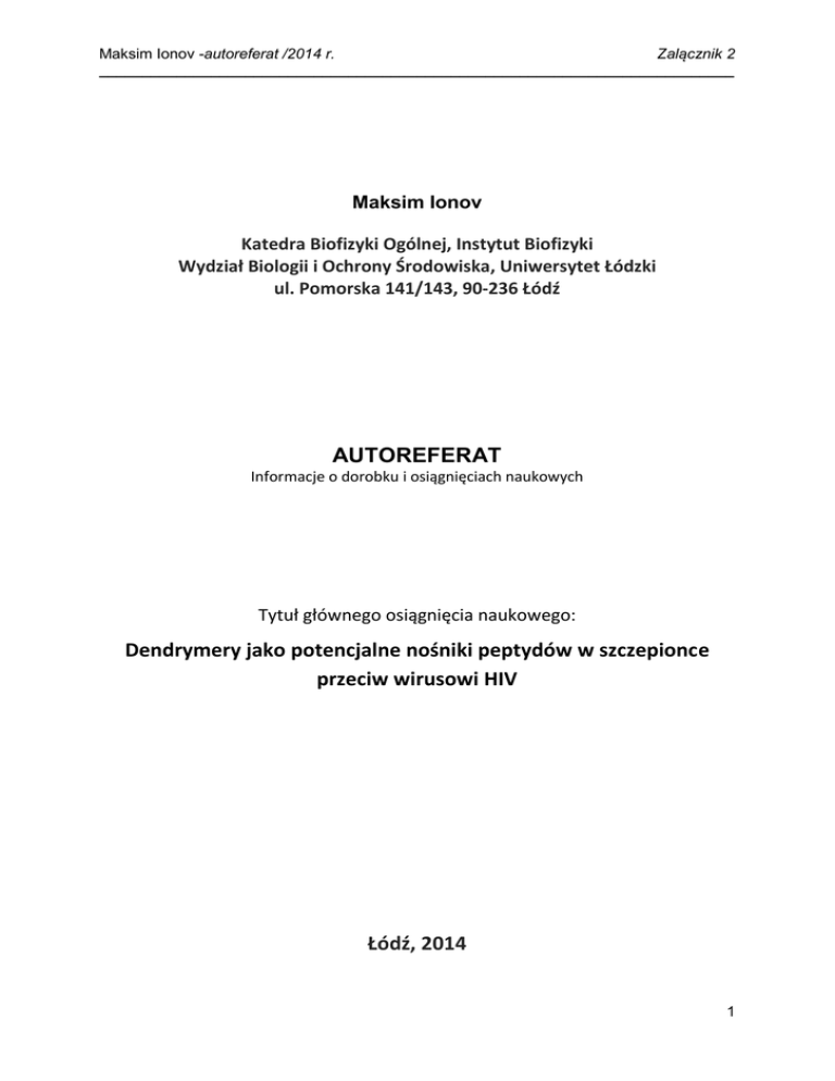 Maksim Ionov -autoreferat /2014 r. Zalącznik 2 __________________________________________________________________________ Maksim Ionov Katedra Biofizyki Ogólnej, Instytut Biofizyki Wydział Biologii i Ochrony Środowiska, Uniwersytet Łódzki ul. Pomorska 141/143, 90-236 Łódź AUTOREFERAT Informacje o dorobku i osiągnięciach naukowych Tytuł głównego osiągnięcia naukowego: Dendrymery jako potencjalne nośniki peptydów w szczepionce przeciw wirusowi HIV Łódź, 2014 1 Maksim Ionov -autoreferat /2014 r. Zalącznik 2 __________________________________________________________________________ Spis treści 1. Życiorys i dorobek naukowy 1.1. Posiadane dyplomy i stopnie naukowe........................................................ 1.2. Zatrudnienie................................................................................................. 1.3 Treningi i staże............................................................................................. 1.4. Stypendia i nagrody..................................................................................... 1.5. Osiągnięcia dydaktyczne............................................................................. 1.6. Recenzowanie publikacji............................................................................. 1.7. Recenzowanie autoreferatów prac doktorskich........................................... 1.8. Udział w projektach badawczych................................................................. 1.9. Członkostwo w organizacjach naukowych.................................................. 1.10. Współpraca międzynarodowa...................................................................... 3 3 3 5 5 5 6 6 7 7 2. Osiągnięcia naukowe 2.1. Publikacje będące podstawą o ubieganie się o stopień doktora habilitowanego................................................................... 8 2.2. Pozostałe publikacje......................................................................................... 9 2.3. Rozdziały w książkach...................................................................................... 12 2.4. Prace opublikowane przed obroną pracy doktorskiej........................................12 3. Omówienie celu naukowego i osiągniętych wyników 3.1. Tytuł osiągnięcia naukowego....................................................................... 3.2. Wstęp........................................................................................................... 3.4. Aktualny stan wiedzy w obszarze dotyczącym tematu rozprawy habilitacyjnej................................................. 3.3. Obiekt badawczy......................................................................................... 3.5. Układ eksperymentalny................................................................................ 3.6. Skrócony opis wyników............................................................................... 3.7. Literatura uzupełniająca............................................................................... 15 15 17 19 20 22 27 4. Informacje bibliometryczne 4.1. Indeks Hirscha............................................................................................. 29 4.2. Wskaźniki Impact Factor, punkty MNiSW oraz liczba cytowań................... 29 2 Maksim Ionov -autoreferat /2014 r. Zalącznik 2 __________________________________________________________________________ 1. Życiorys i dorobek naukowy 1.1. Posiadane dyplomy i stopnie naukowe Tytuł zawodowy magistra 1994 r. Uniwersytet w Taszkiencie, Uzbekistan, Wydział Ochrony Roślin Kierunek: Fitopatologia (specjalność – fitopatologia). Stopień doktora 2001 r. Instytut Chemii Bioorganicznej Akademii Nauk w Taszkiencie, Uzbekistan, Laboratorium Fizyko-Chemicznych Metod Badań, Kierunek: Biologia (doktor nauk biologicznych w zakresie biologii, specjalność – Biofizyka, Chemia Bioorganiczna). 1.2. Informacje o dotychczasowym zatrudnieniu w placówkach naukowych 2007 r.-obecnie – Uniwersytet Łódzki, Katedra Biofizyki Ogólnej, adiunkt 2005 r. -2007 r. Uniwersytet Mirzo Ulugbeka w Taszkiencie, Uzbekistan, Katedra Biofizyki, adiunkt. Instytut Chemii Bioorganicznej Akademii Nauk w Taszkiencie, Laboratorium Fizyko-Chemicznych Metod Badań, adiunkt 2000 r.-2005 r. – Instytut Chemii Bioorganicznej Akademii Nauk w Taszkiencie, Laboratorium Fizyko-Chemicznych Metod Badań, asystent 1996 r.-2000 r. – Instytut Chemii Bioorganicznej Akademii Nauk w Taszkiencie, Stacjonarne Studium Doktoranckie, Biofizyka, Chemia Bioorganiczna, doktorant 1.3. Treningi i staże 2014 Staż naukowy w Instytucie Biofizyki i Inżynierii Komórki, Białoruskiej Akademii Nauk, Mińsk, Bialoruś 2014 Czterech miesięczny warsztat szkoleniowy „Asystent Innowacji-2”, Praktyka w przedsiębiorstwie. Fundacja Rozwoju Przedsiębiorczości w Łodzi, Polska 2013 Warsztat szkoleniowy, Zarządzanie projektami badawczymi. Profesjonalny Biznesplan „Komercjalizacja drogą do sukcesu". Instytut Fraunhofera w Magdeburgu, Niemcy. 3 Maksim Ionov -autoreferat /2014 r. Zalącznik 2 __________________________________________________________________________ 2013 Warsztat szkoleniowy, Projekt międzynarodowy współfinansowany. Wsparcie Ministerstwa Nauki i Szkolnictwa Wyższego dla programów Unii Europejskiej. „Zasady pozyskiwania i rozliczania środków” 23/09/2013. Wydział Programów Międzynarodowych MNiSzW. Łódź, Polska. 2013 Staż naukowy w Instytucie Biofizyki i Inżynierii Komórki, Białoruskiej Akademii Nauk, Mińsk, Bialoruś 2013 Staż naukowy w Instytucie Biologii Chemicznej i Medycyny Fundamentalnej Rosyjskiej Akademii Nauk, Nowosybirsk, Rosja 2012 Warsztat szkoleniowy, Profesjonalny Biznesplan „Komercjalizacja drogą do sukcesu” Wrocław, Polska 2011 II warsztat szkoleniowy, Dendrimers as composites of advanced drug delivery nano systems (aDDnSs) I Warsztat: “Recent advances in Dendrimeric technology” National Hellenic 