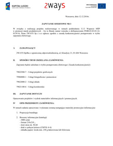 Warszawa, dnia 12.12.2016r. ZAPYTANIE OFERTOWE NR 3 W związku z realizacją projektu realizowanego w ramach poddziałania 3.3.3 Wsparcie MŚP w promocji marek produktowych – Go to Brand, numer wniosku o dofinansowanie POIR.03.03.03-140139/16, firma 2WAYS Sp z o.o ogłasza zgodnie z zasadą konkurencyjności postępowanie w trybie zapytania ofertowego. I. ZAMAWIAJĄCY 2WAYS Spółka z ograniczoną odpowiedzialnością, ul. Klaudyny 21, 01-684 Warszawa II. SPOSÓB I TRYB UDZIELANIA ZAMÓWIENIA Zapytanie będzie udzielane w trybie postępowania ofertowego ( Zasada konkurencyjności) 79822500-7 – Usługi projektów graficznych 79960000-1 – Usługi fotograficzne i pomocnicze 79822000-2 – Usługi składu 79821100-6 – Usługi korektorskie III. ZAPYTANIE DOTYCZY Opracowanie projektów i wydruk materiałów informacyjnych i promocyjnych. IV OPIS PRZEDMIOTU ZAMÓWIENIA: W ramach zadania opracowane i wykonane zostaną następujące materiały promocyjno-informacyjne: 1. Propozycja brandingu 2. Broszury informacyjne (katalogi) - 3000 sztuk - format 210x210 ,, - ilość stron ok. 50-60 - druk w pełnym kolorze (CMYK 4+4) - okładka papier: kreda min. 250 g lakierowana lub foliowana - wewnątrz papier: kreda min. 170 g - oprawa szyta 3. Ulotki 3DL - 3000 sztuk - druk obustronny - druk w pełnym kolorze (CMYK 4+4) - papier kreda błysk min. 150 g 4. Koperty firmowe – 2000 szt. format A4 - 2000 szt - format A4 5. Teczki firmowe – 2000 szt. - 2000 sztuk - druk w pełnym kolorze (CMYK 4+4) - papier: kreda min. 350 g lakierowana lub foliowana 6. Roll up – 2 szt., wymiary 100x200 cm 7. Wizytówki firmowe – dwustronne, matowe 8. Logo ( księga znaku) Wykonanie powyższych materiałów dotyczy również opracowania graficznego. V. TERMIN WYKONANIA ZAMÓWIENIA Planowany termin rozpoczęcia realizacji przedmiotu umowy: 1 stycznia 2017r. Planowany termin zakończenia realizacji przedmiotu umowy: Październik 2018r. VI. WYMAGANIA DOTYCZĄCE OFERENTÓW 1. Oferent powinien prowadzić działalność zgodną z przedmiotem niniejszego zapytania 2. Oferent winien posiadać niezbędną wiedzę i doświadczenie oraz dysponować odpowiednim potencjałem technicznym i osobami zdolnymi do wykonania zamówienia 3. Oferent zobowiązany jest do przedłożenia niniejszego zamówienia, ze wskazaniem: nawy zamawiającego, tematu usługi, wartości usługi, terminu realizacji usługi, numeru telefonu osoby mogącej potwierdzić prawidłową realizację usługi. VII. WYMAGANIA DOTYCZĄCE OFERTY: Oferta powinna zawierać: 1. Nazwę i adres oferenta, 2. Opis nawiązujący do parametrów wyszczególnionych w zapytaniu ofertowym, 3. Cenę netto i brutto wykonania poszczególnych usług wymienionych powyżej 4. Łączną cenę netto i brutto 5. Termin ważności oferty 6. Oferta powinna być podpisana przez osoby upoważnione do podpisywania oferty 7. Do oferty należy załączyć oświadczenie o braku powiązań kapitałowych i osobowych z Zamawiającym stanowiące Załacznik nr 1 do zapytania ofertowego 8. Do oferty należy dołączyć oświadczenie o spełnianiu warunków z Zamawiającym stanowiące Załącznik nr 2 do Zapytania ofertowego. 9. Oferty należy składać w języku polskim lub angielskim Zamawiający może uznać ofertę za nieważną jeżeli: - jeżeli została złożona po wyznaczonym terminie - nie spełnia warunków określonych w niniejszym Zapytaniu Ofertowym VIII. ZAKRES WYKLUCZENIA Zamawiający Wykluczy Wykonawcę z postępowania, w przypadku niespełnienia warunków udziału w postępowaniu, o którym mowa powyżej oraz niezłożenia oświadczeń, zgodnie z załącznikiem nr 1 i 2 do niniejszego zapytania ofertowego. Ofertę Wykonawcy wykluczonego uznaje się za odrzuconą. IX. TERMIN SKŁADANIA OFERT Termin składania ofert upływa w dniu: 19.12.2016r. X. SPOSÓB SKŁADANIA OFERT Miejsce składania ofert – 2WAYS Sp.z o.o, ul. Klaudyny 21, 01-684 Warszawa. Sposób składania ofert – oferta może być złożona w formie pisemnej lub w formie elektronicznej na adres mailowy: [email protected] XI. KRYTERIA PUNKTOWE OCENY OFERT 1. Cena: 90% Najniższa cena x 90 Badana cena 2. Termin płatności: 10 pkt Do 30 dni – 0 pkt. 31-45 dni – 5 pkt 45-60 dni więcej – 10 pkt Łączna ocenia obejmuje sumę punktów uzyskanych przez ofertę w kryteriach 1-2 XII. WARUNKI DOKONANIA ZMIANY UMOWY Zamawiający przewiduje możliwość zmiany umowy, w przypadku gdy nastąpi zmiana powszechnie obowiązujących przepisów prawa w zakresie mającym wpływ na realizację przedmiotu umowy. Zamawiający przewiduje możliwość zmiany umowy, w przypadku zaistnienia okoliczności spowodowanych czynnikami zewnętrznymi, np. termin realizacji zamówienia, warunki płatności, zmiana wartości zamówienia wynikają ze zmniejszenia/rozszerzenia zakresu rzeczowego. Zastrzeżenia: Niniejsze zapytanie ofertowe nie zobowiązuje firmy 2WAYS do następujących działań: a) Akceptacji oferty, w całości lub części i nie zobowiązuje firmy 2WAYS do składania wyjaśnień dotyczących powodów akceptacji lub odrzucenia ofert b) Ponoszenia kosztów związanych z przygotowaniem oferty w odpowiedzi na zapytanie ofertowe Projekt współfinansowany przez Unię Europejską ze środków Europejskiego Funduszu R o z w o j u R e g i o n a l n e g o w r a m a c h P r o g r a m u O p e r a c y j n e g o I n t e Załącznik nr 1 do Zapytania ofertowego – Oświadczenie Dostawcy ............................................................... (pieczątka nagłówkowa Wykonawcy) ................................, dnia .................. (miejscowość, data) OŚWIADCZENIE O BRAKU POWIĄZAŃ Oświadczam, iż reprezentowany przeze mnie podmiot …………………………………………………………………………………………………………… ani osoby upoważnione do zaciągania zobowiązań w jej imieniu nie posiadają żadnych powiązań osobowych ani kapitałowych z Zamawiającym (Firma Produkcyjno-Handlowa „PA